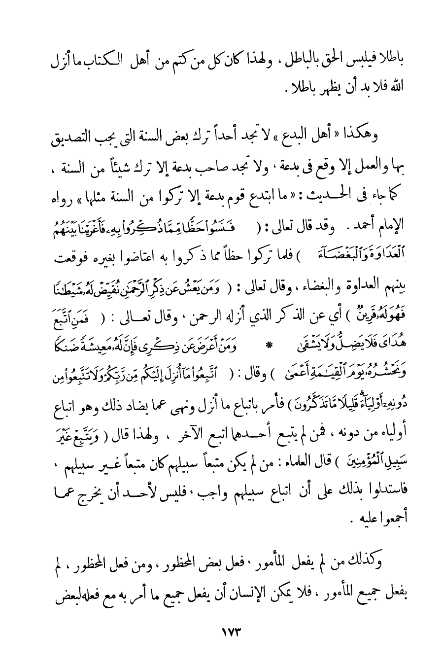 بَاطِلًا فَيُلْبِسُ الْحَقَّ بِالْبَاطِلِ وَلِهَذَا كَانَ كُلُّ مَنْ كَتَمَ مِنْ أَهْلِ الْكِتَابِ مَا أَنْزَلَ اللَّهُ فَلَا بُدَّ أَنْ يُظْهِرَ بَاطِلًا. وَهَكَذَا " أَهْلُ الْبِدَعِ " لَا تَجِدُ أَحَدًا تَرَكَ بَعْضَ السُّنَّةِ الَّتِي يَجِبُ التَّصْدِيقُ بِهَا وَالْعَمَلُ إلَّا وَقَعَ فِي بِدْعَةٍ وَلَا تَجِدُ صَاحِبَ بِدْعَةٍ إلَّا تَرَكَ شَيْئًا مِنْ السُّنَّةِ كَمَا جَاءَ فِي الْحَدِيثِ: " {مَا ابْتَدَعَ قَوْمٌ بِدْعَةً إلَّا تَرَكُوا مِنْ السُّنَّةِ مِثْلَهَا} " رَوَاهُ الْإِمَامُ أَحْمَد. وَقَدْ قَالَ تَعَالَى: {فَنَسُوا حَظًّا مِمَّا ذُكِّرُوا بِهِ فَأَغْرَيْنَا بَيْنَهُمُ الْعَدَاوَةَ وَالْبَغْضَاءَ} فَلَمَّا تَرَكُوا حَظًّا مِمَّا ذُكِّرُوا بِهِ اعتاضوا بِغَيْرِهِ فَوَقَعَتْ بَيْنَهُمْ الْعَدَاوَةُ وَالْبَغْضَاءُ وَقَالَ تَعَالَى: {وَمَنْ يَعْشُ عَنْ ذِكْرِ الرَّحْمَنِ نُقَيِّضْ لَهُ شَيْطَانًا فَهُوَ لَهُ قَرِينٌ} أَيْ عَنْ الذِّكْرِ الَّذِي أَنْزَلَهُ الرَّحْمَنُ وَقَالَ تَعَالَى: {فَمَنِ اتَّبَعَ هُدَايَ فَلَا يَضِلُّ وَلَا يَشْقَى} {وَمَنْ أَعْرَضَ عَنْ ذِكْرِي فَإِنَّ لَهُ مَعِيشَةً ضَنْكًا وَنَحْشُرُهُ يَوْمَ الْقِيَامَةِ أَعْمَى} وَقَالَ: {اتَّبِعُوا مَا أُنْزِلَ إلَيْكُمْ مِنْ رَبِّكُمْ وَلَا تَتَّبِعُوا مِنْ دُونِهِ أَوْلِيَاءَ قَلِيلًا مَا تَذَكَّرُونَ} فَأَمَرَ بِاتِّبَاعِ مَا أَنْزَلَ وَنَهَى عَمَّا يُضَادُّ ذَلِكَ وَهُوَ اتِّبَاعُ أَوْلِيَاءَ مِنْ دُونِهِ فَمَنْ لَمْ يَتَّبِعْ أَحَدَهُمَا اتَّبَعَ الْآخَرَ وَلِهَذَا قَالَ {وَيَتَّبِعْ غَيْرَ سَبِيلِ الْمُؤْمِنِينَ} قَالَ الْعُلَمَاءُ: مَنْ لَمْ يَكُنْ مُتَّبِعًا سَبِيلَهُمْ كَانَ مُتَّبِعًا غَيْرَ سَبِيلِهِمْ فَاسْتَدَلُّوا بِذَلِكَ عَلَى أَنَّ اتِّبَاعَ سَبِيلِهِمْ وَاجِبٌ فَلَيْسَ لِأَحَدِ أَنْ يَخْرُجَ عَمَّا أَجْمَعُوا عَلَيْهِ. وَكَذَلِكَ مَنْ لَمْ يَفْعَلْ الْمَأْمُورَ فَعَلَ بَعْضَ الْمَحْظُورِ وَمَنْ فَعَلَ الْمَحْظُورَ لَمْ يَفْعَلْ جَمِيعَ الْمَأْمُورِ فَلَا يُمْكِنُ الْإِنْسَانَ أَنْ يَفْعَلَ جَمِيعَ مَا أُمِرَ بِهِ مَعَ فِعْلِهِ لِبَعْضِ