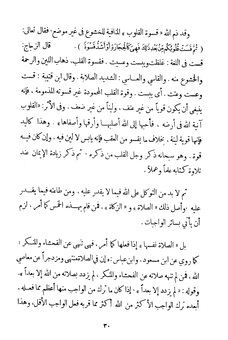 وَقَدْ ذَمَّ اللَّهُ " قَسْوَةَ الْقُلُوبِ " الْمُنَافِيَةَ لِلْخُشُوعِ فِي غَيْرِ مَوْضِعٍ فَقَالَ تَعَالَى: {ثُمَّ قَسَتْ قُلُوبُكُمْ مِنْ بَعْدِ ذَلِكَ فَهِيَ كَالْحِجَارَةِ أَوْ أَشَدُّ قَسْوَةً} . قَالَ الزَّجَّاجُ: قَسَتْ فِي اللُّغَةِ: غَلُظَتْ وَيَبِسَتْ وَعَسِيَتْ. فَقَسْوَةُ الْقَلْبِ ذَهَابُ اللِّينِ وَالرَّحْمَةِ وَالْخُشُوعِ مِنْهُ وَالْقَاسِي والعاسي: الشَّدِيدُ الصَّلَابَةِ. وَقَالَ ابْنُ قُتَيْبَةَ: قَسَتْ وَعَسَتْ وَعَتَتْ. أَيْ يَبِسَتْ. وَقُوَّةُ الْقَلْبِ الْمَحْمُودَةُ غَيْرُ قَسْوَتِهِ الْمَذْمُومَةِ فَإِنَّهُ يَنْبَغِي أَنْ يَكُونَ قَوِيًّا مِنْ غَيْرِ عُنْفٍ وَلَيِّنًا مِنْ غَيْرِ ضَعْفٍ. وَفِي الْأَثَرِ: {الْقُلُوبُ آنِيَةُ اللَّهِ فِي أَرْضِهِ فَأَحَبُّهَا إلَى اللَّهِ أَصْلَبُهَا وَأَرَقُّهَا وَأَصْفَاهَا} . وَهَذَا كَالْيَدِ فَإِنَّهَا قَوِيَّةٌ لَيِّنَةٌ بِخِلَافِ مَا يَقْسُو مِنْ الْعَقِبِ فَإِنَّهُ يَابِسٌ لَا لِينَ فِيهِ وَإِنْ كَانَ فِيهِ قُوَّةٌ.