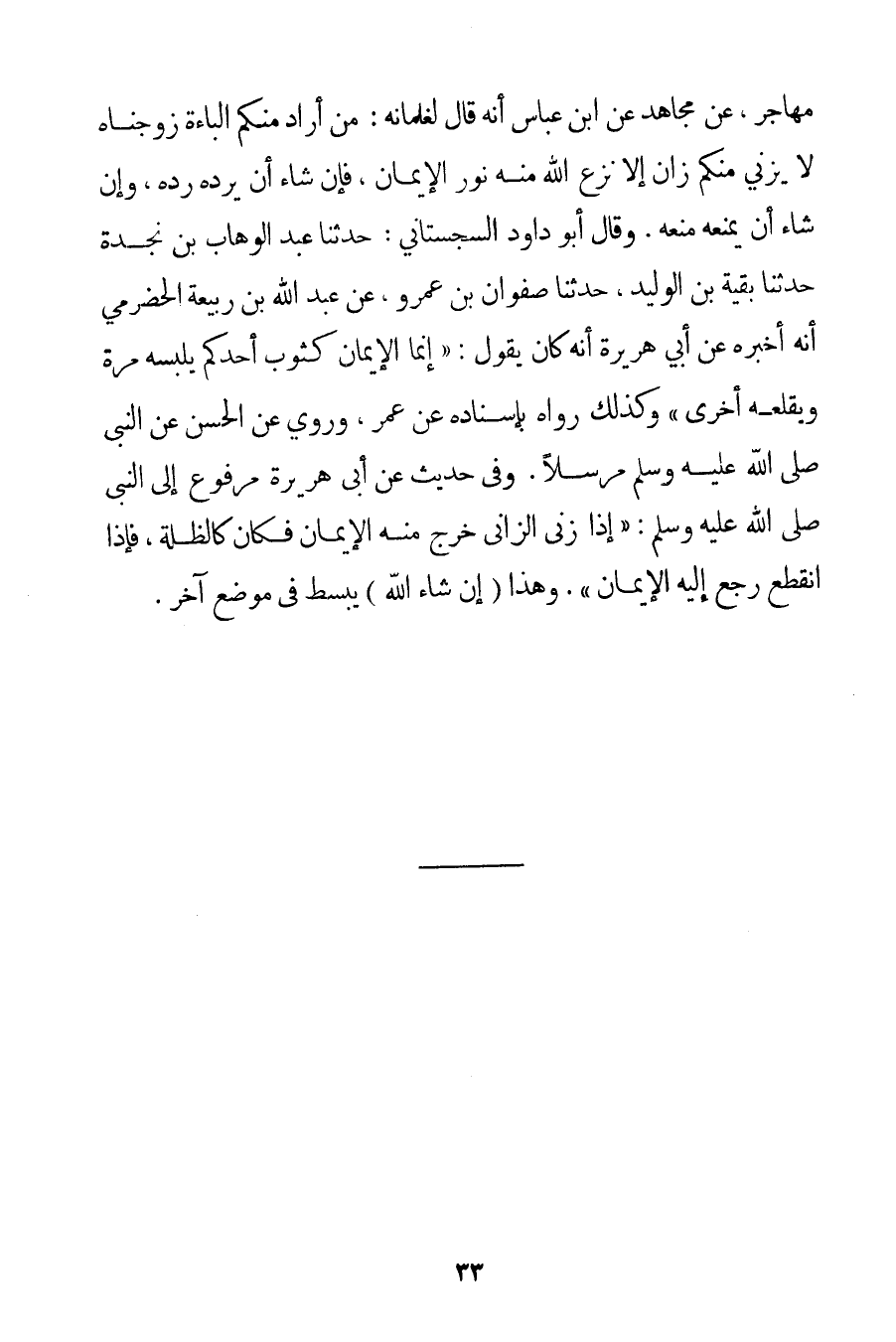 مُهَاجِرٍ عَنْ مُجَاهِدٍ عَنْ ابْنِ عَبَّاسٍ أَنَّهُ قَالَ لِغِلْمَانِهِ: مَنْ أَرَادَ مِنْكُمْ الْبَاءَةَ زَوَّجْنَاهُ لَا يَزْنِي مِنْكُمْ زَانٍ إلَّا نَزَعَ اللَّهُ مِنْهُ نُورَ الْإِيمَانِ فَإِنْ شَاءَ أَنْ يَرُدَّهُ رَدَّهُ وَإِنْ شَاءَ أَنْ يَمْنَعَهُ مَنَعَهُ. وَقَالَ أَبُو دَاوُد السجستاني: حَدَّثَنَا عَبْدُ الْوَهَّابِ بْنُ نَجْدَةَ حَدَّثَنَا بَقِيَّةُ بْنُ الْوَلِيدِ حَدَّثَنَا صَفْوَانُ بْنُ عَمْرٍو عَنْ عَبْدِ اللَّهِ بْنِ رَبِيعَةَ الْحَضْرَمِيِّ أَنَّهُ أَخْبَرَهُ {عَنْ أَبِي هُرَيْرَةَ أَنَّهُ كَانَ يَقُولُ: إنَّمَا الْإِيمَانُ كَثَوْبِ أَحَدِكُمْ يَلْبَسُهُ مَرَّةً وَيَقْلَعُهُ أُخْرَى} وَكَذَلِكَ رَوَاهُ بِإِسْنَادِهِ عَنْ عُمَرَ وَرُوِيَ عَنْ الْحَسَنِ عَنْ النَّبِيِّ صَلَّى اللَّهُ عَلَيْهِ وَسَلَّمَ مُرْسَلًا. وَفِي حَدِيثٍ عَنْ أَبِي هُرَيْرَةَ مَرْفُوعٍ إلَى النَّبِيِّ صَلَّى اللَّهُ عَلَيْهِ وَسَلَّمَ {إذَا زَنَى الزَّانِي خَرَجَ مِنْهُ الْإِيمَانُ فَكَانَ كَالظُّلَّةِ فَإِذَا انْقَطَعَ رَجَعَ إلَيْهِ الْإِيمَانُ} . وَهَذَا (إنْ شَاءَ اللَّهُ) يُبْسَطُ فِي مَوْضِعٍ آخَرَ.