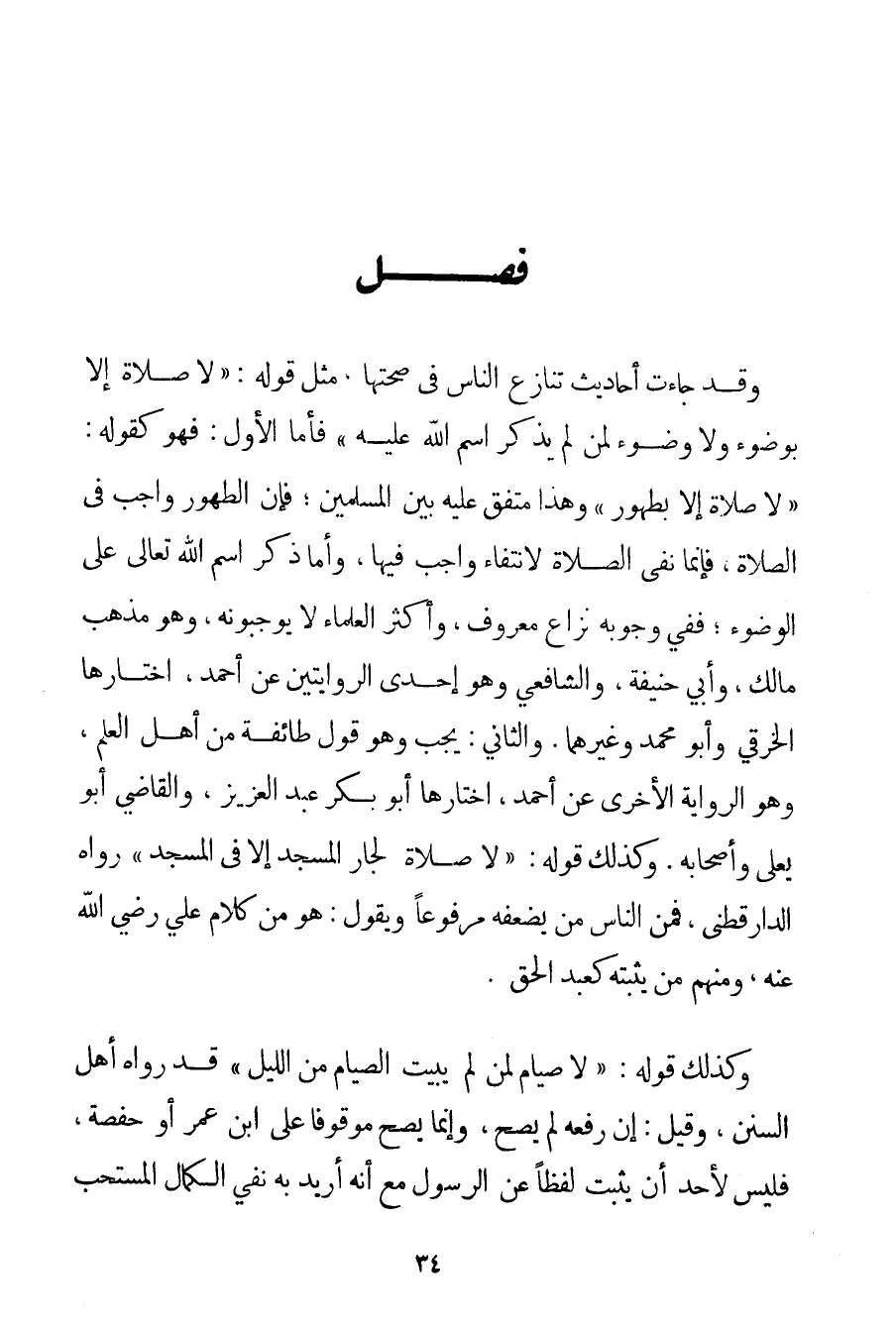 وَقَدْ جَاءَتْ أَحَادِيثُ تَنَازَعَ النَّاسُ فِي صِحَّتِهَا، مِثْلُ قَوْلِهِ: {لَا صَلَاةَ إلَّا بِوُضُوءِ وَلَا وُضُوءَ لِمَنْ لَمْ يَذْكُرْ اسْمَ اللَّهِ عَلَيْهِ} فَأَمَّا الْأَوَّلُ: فَهُوَ كَقَوْلِهِ: {لَا صَلَاةَ إلَّا بِطَهُورِ} وَهَذَا مُتَّفَقٌ عَلَيْهِ بَيْنَ الْمُسْلِمِينَ؛ فَإِنَّ الطَّهُورَ وَاجِبٌ فِي الصَّلَاةِ فَإِنَّمَا نَفَى الصَّلَاةَ لِانْتِفَاءِ وَاجِبٍ فِيهَا وَأَمَّا ذِكْرُ اسْمِ اللَّهِ تَعَالَى عَلَى الْوُضُوءِ؛ فَفِي وُجُوبِهِ نِزَاعٌ مَعْرُوفٌ وَأَكْثَرُ الْعُلَمَاءِ لَا يُوجِبُونَهُ وَهُوَ مَذْهَبُ مَالِكٍ وَأَبِي حَنِيفَةَ وَالشَّافِعِيِّ وَهُوَ إحْدَى الرِّوَايَتَيْنِ عَنْ أَحْمَد اخْتَارَهَا الخَرْقِي وَأَبُو مُحَمَّدٍ وَغَيْرُهُمَا. وَالثَّانِي: يَجِبُ وَهُوَ قَوْلُ طَائِفَةٍ مِنْ أَهْلِ الْعِلْمِ وَهُوَ الرِّوَايَةُ الْأُخْرَى عَنْ أَحْمَد اخْتَارَهَا أَبُو بَكْرٍ عَبْدُ الْعَزِيزِ وَالْقَاضِي أَبُو يَعْلَى وَأَصْحَابُهُ. وَكَذَلِكَ قَوْلُهُ: {لَا صَلَاةَ لِجَارِ الْمَسْجِدِ إلَّا فِي الْمَسْجِدِ} رَوَاهُ الدارقطني. فَمِنْ النَّاسِ مَنْ يُضَعِّفُهُ مَرْفُوعًا وَيَقُولُ: هُوَ مِنْ كَلَامِ عَلِيٍّ رَضِيَ اللَّهُ عَنْهُ وَمِنْهُمْ مَنْ يُثْبِتُهُ كَعَبْدِ الْحَقِّ. وَكَذَلِكَ قَوْلُهُ: {لَا صِيَامَ لِمَنْ لَمْ يُبَيِّتْ الصِّيَامَ مِنْ اللَّيْلِ} قَدْ رَوَاهُ أَهْلُ السُّنَنِ وَقِيلَ: إنَّ رَفْعَهُ لَمْ يَصِحَّ وَإِنَّمَا يَصِحُّ مَوْقُوفًا عَلَى ابْنِ عُمَرَ أَوْ حَفْصَةَ فَلَيْسَ لِأَحَدِ أَنْ يُثْبِتَ لَفْظًا عَنْ الرَّسُولِ مَعَ أَنَّهُ أُرِيدَ بِهِ نَفْيُ الْكَمَالِ