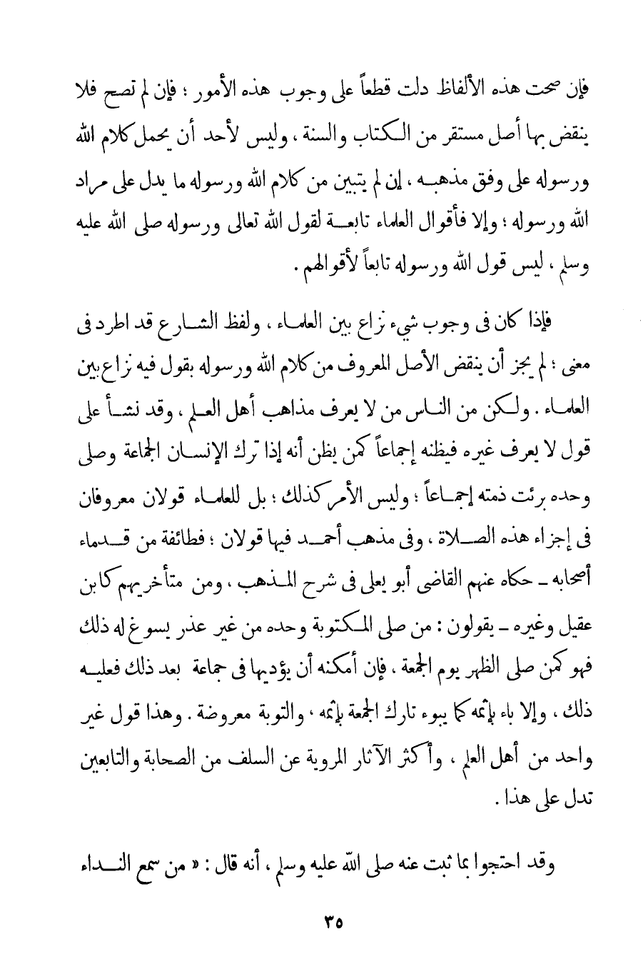 الْمُسْتَحَبِّ فَإِنْ صَحَّتْ هَذِهِ الْأَلْفَاظُ دَلَّتْ قَطْعًا عَلَى وُجُوبِ هَذِهِ الْأُمُورِ؛ فَإِنْ لَمْ تَصِحَّ فَلَا يُنْقَضُ بِهَا أَصْلٌ مُسْتَقِرٌّ مِنْ الْكِتَابِ وَالسُّنَّةِ وَلَيْسَ لِأَحَدِ أَنْ يَحْمِلَ كَلَامَ اللَّهِ وَرَسُولِهِ عَلَى وَفْقِ مَذْهَبِهِ إنْ لَمْ يَتَبَيَّنْ مِنْ كَلَامِ اللَّهِ وَرَسُولِهِ مَا يَدُلُّ عَلَى مُرَادِ اللَّهِ وَرَسُولِهِ؛ وَإِلَّا فَأَقْوَالُ الْعُلَمَاءِ تَابِعَةٌ لِقَوْلِ اللَّهِ تَعَالَى وَرَسُولِهِ صَلَّى اللَّهُ عَلَيْهِ وَسَلَّمَ لَيْسَ قَوْلُ اللَّهِ وَرَسُولِهِ تَابِعًا لِأَقْوَالِهِمْ. فَإِذَا كَانَ فِي وُجُوبِ شَيْءٍ نِزَاعٌ بَيْنَ الْعُلَمَاءِ، وَلَفْظُ الشَّارِعِ قَدْ اطَّرَدَ فِي مَعْنًى؛ لَمْ يَجُزْ أَنْ يُنْقَضَ الْأَصْلُ الْمَعْرُوفُ مِنْ كَلَامِ اللَّهِ وَرَسُولِهِ بِقَوْلِ فِيهِ نِزَاعٌ بَيْنَ الْعُلَمَاءِ. وَلَكِنْ مِنْ النَّاسِ مَنْ لَا يَعْرِفُ مَذَاهِبَ أَهْلِ الْعِلْمِ وَقَدْ نَشَأَ عَلَى قَوْلٍ لَا يَعْرِفُ غَيْرَهُ فَيَظُنُّهُ إجْمَاعًا كَمَنْ يَظُنُّ أَنَّهُ إذَا تَرَكَ الْإِنْسَانُ الْجَمَاعَةَ وَصَلَّى وَحْدَهُ بَرِئَتْ ذِمَّتُهُ إجْمَاعًا؛ وَلَيْسَ الْأَمْرُ كَذَلِكَ؛ بَلْ لِلْعُلَمَاءِ قَوْلَانِ مَعْرُوفَانِ فِي إجْزَاءِ هَذِهِ الصَّلَاةِ وَفِي مَذْهَبِ أَحْمَد فِيهَا قَوْلَانِ؛ فَطَائِفَةٌ مِنْ قُدَمَاءِ أَصْحَابِهِ - حَكَاهُ عَنْهُمْ الْقَاضِي أَبُو يَعْلَى فِي شَرْحِ الْمَذْهَبِ وَمِنْ مُتَأَخِّرِيهِمْ كَابْنِ عَقِيلٍ وَغَيْرِهِ - يَقُولُونَ: مَنْ صَلَّى الْمَكْتُوبَةَ وَحْدَهُ مِنْ غَيْرِ عُذْرٍ يُسَوِّغُ لَهُ ذَلِكَ فَهُوَ كَمَنْ صَلَّى الظُّهْرَ يَوْمَ الْجُمُعَةِ فَإِنْ أَمْكَنَهُ أَنْ يُؤَدِّيَهَا فِي جَمَاعَةٍ بَعْدَ ذَلِكَ فَعَلَيْهِ ذَلِكَ وَإِلَّا بَاءَ بِإِثْمِهِ كَمَا يَبُوءُ تَارِكُ الْجُمُعَةِ بِإِثْمِهِ، وَالتَّوْبَةُ مَعْرُوضَةٌ. وَهَذَا قَوْلُ غَيْرِ وَاحِدٍ مِنْ أَهْلِ الْعِلْمِ، وَأَكْثَرُ الْآثَارِ الْمَرْوِيَّةِ عَنْ السَّلَفِ مِنْ الصَّحَابَةِ وَالتَّابِعِينَ تَدُلُّ عَلَى هَذَا. وَقَدْ احْتَجُّوا بِمَا ثَبَتَ عَنْهُ صَلَّى اللَّهُ عَلَيْهِ وَسَلَّمَ أَنَّهُ قَالَ: {مَنْ سَمِعَ النِّدَاءَ