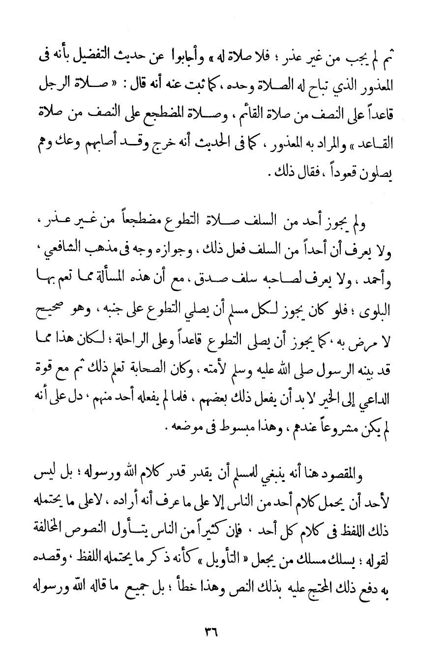 ثُمَّ لَمْ يُجِبْ مِنْ غَيْرِ عُذْرٍ؛ فَلَا صَلَاةَ لَهُ} وَأَجَابُوا عَنْ حَدِيثِ التَّفْضِيلِ بِأَنَّهُ فِي الْمَعْذُورِ الَّذِي تُبَاحُ لَهُ الصَّلَاةُ وَحْدَهُ كَمَا ثَبَتَ عَنْهُ أَنَّهُ قَالَ: {صَلَاةُ الرَّجُلِ قَاعِدًا عَلَى النِّصْفِ مِنْ صَلَاةِ الْقَائِمِ وَصَلَاةُ الْمُضْطَجِعِ عَلَى النِّصْفِ مِنْ صَلَاةِ الْقَاعِدِ} وَالْمُرَادُ بِهِ الْمَعْذُورُ كَمَا فِي الْحَدِيثِ أَنَّهُ خَرَجَ وَقَدْ أَصَابَهُمْ وَعْكٌ وَهُمْ يُصَلُّونَ قُعُودًا فَقَالَ ذَلِكَ. وَلَمْ يُجَوِّزْ أَحَدٌ مِنْ السَّلَفِ صَلَاةَ التَّطَوُّعِ مُضْطَجِعًا مِنْ غَيْرِ عُذْرٍ، وَلَا يُعْرَفُ أَنَّ أَحَدًا مِنْ السَّلَفِ فَعَلَ ذَلِكَ، وَجَوَازُهُ وَجْهٌ فِي مَذْهَبِ الشَّافِعِيِّ وَأَحْمَد، وَلَا يُعْرَفُ لِصَاحِبِهِ سَلَفُ صِدْقٍ مَعَ أَنَّ هَذِهِ الْمَسْأَلَةَ مِمَّا تَعُمُّ بِهَا الْبَلْوَى؛ فَلَوْ كَانَ يَجُوزُ لِكُلِّ مُسْلِمٍ أَنْ يُصَلِّيَ التَّطَوُّعَ عَلَى جَنْبِهِ وَهُوَ صَحِيحٌ لَا مَرَضَ بِهِ كَمَا يَجُوزُ أَنْ يُصَلِّيَ التَّطَوُّعَ قَاعِدًا وَعَلَى الرَّاحِلَةِ؛ لَكَانَ هَذَا مِمَّا قَدْ بَيَّنَهُ الرَّسُولُ صَلَّى اللَّهُ عَلَيْهِ وَسَلَّمَ لِأُمَّتِهِ وَكَانَ الصَّحَابَةُ تَعْلَمُ ذَلِكَ، ثُمَّ مَعَ قُوَّةِ الدَّاعِي إلَى الْخَيْرِ لَا بُدَّ أَنْ يَفْعَلَ ذَلِكَ بَعْضُهُمْ، فَلَمَّا لَمْ يَفْعَلْهُ أَحَدٌ مِنْهُمْ دَلَّ عَلَى أَنَّهُ لَمْ يَكُنْ مَشْرُوعًا عِنْدَهُمْ وَهَذَا مَبْسُوطٌ فِي مَوْضِعِهِ.
