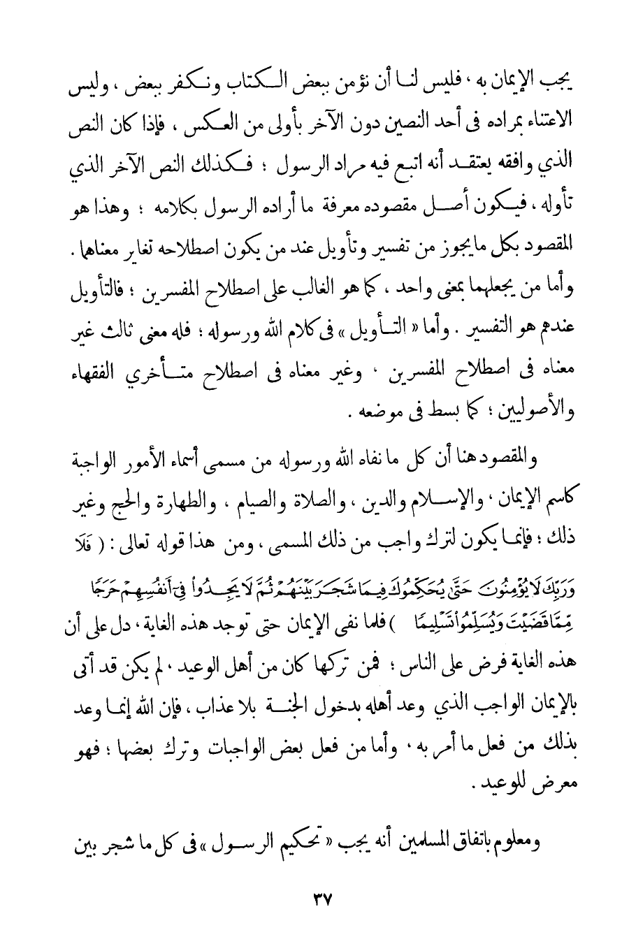 يَجِبُ الْإِيمَانُ بِهِ. فَلَيْسَ لَنَا أَنْ نُؤْمِنَ بِبَعْضِ الْكِتَابِ وَنَكْفُرَ بِبَعْضِ، وَلَيْسَ الِاعْتِنَاءُ بِمُرَادِهِ فِي أَحَدِ النَّصَّيْنِ دُونَ الْآخَرِ بِأَوْلَى مِنْ الْعَكْسِ، فَإِذَا كَانَ النَّصُّ الَّذِي وَافَقَهُ يَعْتَقِدُ أَنَّهُ اتَّبَعَ فِيهِ مُرَادَ الرَّسُولِ؛ فَكَذَلِكَ النَّصُّ الْآخَرُ الَّذِي تَأَوَّلَهُ فَيَكُونُ أَصْلُ مَقْصُودِهِ مَعْرِفَةَ مَا أَرَادَهُ الرَّسُولُ بِكَلَامِهِ؛ وَهَذَا هُوَ الْمَقْصُودُ بِكُلِّ مَا يَجُوزُ مِنْ تَفْسِيرٍ وَتَأْوِيلٍ عِنْدَ مَنْ يَكُونُ اصْطِلَاحُهُ تَغَايُرَ مَعْنَاهُمَا. وَأَمَّا مَنْ يَجْعَلُهُمَا بِمَعْنَى وَاحِدٍ كَمَا هُوَ الْغَالِبُ عَلَى اصْطِلَاحِ الْمُفَسِّرِينَ؛ فَالتَّأْوِيلُ عِنْدَهُمْ هُوَ التَّفْسِيرُ. وَأَمَّا " التَّأْوِيلُ " فِي كَلَامِ اللَّهِ وَرَسُولِهِ؛ فَلَهُ مَعْنًى ثَالِثٌ غَيْرَ مَعْنَاهُ فِي اصْطِلَاحِ الْمُفَسِّرِينَ. وَغَيْرَ مَعْنَاهُ فِي اصْطِلَاحِ مُتَأَخِّرِي الْفُقَهَاءِ وَالْأُصُولِيِّينَ؛ كَمَا بُسِطَ فِي مَوْضِعِهِ. وَالْمَقْصُودُ هُنَا أَنَّ كُلَّ مَا نَفَاهُ اللَّهُ وَرَسُولُهُ مِنْ مُسَمَّى أَسْمَاءِ الْأُمُورِ الْوَاجِبَةِ كَاسْمِ الْإِيمَانِ وَالْإِسْلَامِ وَالدِّينِ وَالصَّلَاةِ وَالصِّيَامِ وَالطَّهَارَةِ وَالْحَجِّ وَغَيْرِ ذَلِكَ؛ فَإِنَّمَا يَكُونُ لِتَرْكِ وَاجِبٍ مِنْ ذَلِكَ الْمُسَمَّى وَمِنْ هَذَا قَوْله تَعَالَى {فَلَا وَرَبِّكَ لَا يُؤْمِنُونَ حَتَّى يُحَكِّمُوكَ فِيمَا شَجَرَ بَيْنَهُمْ ثُمَّ لَا يَجِدُوا فِي أَنْفُسِهِمْ حَرَجًا مِمَّا قَضَيْتَ وَيُسَلِّمُوا تَسْلِيمًا} فَلَمَّا نَفَى الْإِيمَانَ حَتَّى تُوجَدَ هَذِهِ الْغَايَةُ دَلَّ عَلَى أَنَّ هَذِهِ الْغَايَةَ فَرْضٌ عَلَى النَّاسِ؛ فَمَنْ تَرَكَهَا كَانَ مِنْ أَهْلِ الْوَعِيدِ لَمْ يَكُنْ قَدْ أَتَى بِالْإِيمَانِ الْوَاجِبِ الَّذِي وُعِدَ أَهْلُهُ بِدُخُولِ الْجَنَّةِ بِلَا عَذَابٍ، فَإِنَّ اللَّهَ إنَّمَا وَعَدَ بِذَلِكَ مَنْ فَعَلَ مَا أُمِرَ بِهِ وَأَمَّا مَنْ فَعَلَ بَعْضَ الْوَاجِبَاتِ وَتَرَكَ بَعْضَهَا؛ فَهُوَ مُعَرَّضٌ لِلْوَعِيدِ.