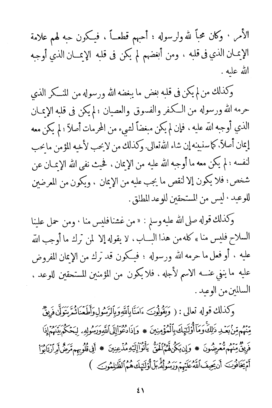 وَكَذَلِكَ قَوْلُهُ صَلَّى اللَّهُ عَلَيْهِ وَسَلَّمَ {مَنْ غَشَّنَا فَلَيْسَ مِنَّا وَمَنْ حَمَلَ عَلَيْنَا السِّلَاحَ فَلَيْسَ مِنَّا} كُلُّهُ مِنْ هَذَا الْبَابِ لَا يَقُولُهُ إلَّا لِمَنْ تَرَكَ مَا أَوْجَبَ اللَّهُ عَلَيْهِ أَوْ فَعَلَ مَا حَرَّمَهُ اللَّهُ وَرَسُولُهُ؛ فَيَكُونُ قَدْ تَرَكَ مِنْ الْإِيمَانِ الْمَفْرُوضِ عَلَيْهِ مَا يَنْفِي عَنْهُ الِاسْمَ لِأَجْلِهِ فَلَا يَكُونُ مِنْ الْمُؤْمِنِينَ الْمُسْتَحِقِّينَ لِلْوَعْدِ السَّالِمِينَ مِنْ الْوَعِيدِ. وَكَذَلِكَ قَوْله تَعَالَى {وَيَقُولُونَ آمَنَّا بِاللَّهِ وَبِالرَّسُولِ وَأَطَعْنَا ثُمَّ يَتَوَلَّى فَرِيقٌ مِنْهُمْ مِنْ بَعْدِ ذَلِكَ وَمَا أُولَئِكَ بِالْمُؤْمِنِينَ} {وَإِذَا دُعُوا إلَى اللَّهِ وَرَسُولِهِ لِيَحْكُمَ بَيْنَهُمْ إذَا فَرِيقٌ مِنْهُمْ مُعْرِضُونَ} {وَإِنْ يَكُنْ لَهُمُ الْحَقُّ يَأْتُوا إلَيْهِ مُذْعِنِينَ} {أَفِي قُلُوبِهِمْ مَرَضٌ أَمِ ارْتَابُوا أَمْ يَخَافُونَ أَنْ يَحِيفَ اللَّهُ عَلَيْهِمْ وَرَسُولُهُ بَلْ أُولَئِكَ هُمُ الظَّالِمُونَ}