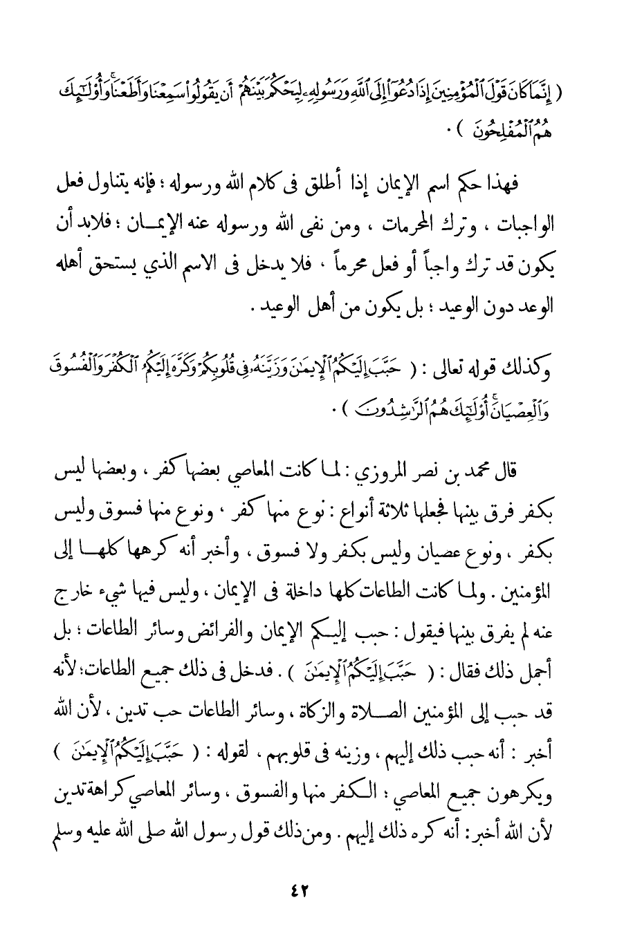 {إنَّمَا كَانَ قَوْلَ الْمُؤْمِنِينَ إذَا دُعُوا إلَى اللَّهِ وَرَسُولِهِ لِيَحْكُمَ بَيْنَهُمْ أَنْ يَقُولُوا سَمِعْنَا وَأَطَعْنَا وَأُولَئِكَ هُمُ الْمُفْلِحُونَ} . فَهَذَا حُكْمُ اسْمِ الْإِيمَانِ إذَا أُطْلِقَ فِي كَلَامِ اللَّهِ وَرَسُولِهِ؛ فَإِنَّهُ يَتَنَاوَلُ فِعْلَ الْوَاجِبَاتِ وَتَرْكَ الْمُحَرَّمَاتِ وَمَنْ نَفَى اللَّهُ وَرَسُولُهُ عَنْهُ الْإِيمَانَ؛ فَلَا بُدَّ أَنْ يَكُونَ قَدْ تَرَكَ وَاجِبًا أَوْ فَعَلَ مُحَرَّمًا فَلَا يَدْخُلُ فِي الِاسْمِ الَّذِي يَسْتَحِقُّ أَهْلُهُ الْوَعْدَ دُونَ الْوَعِيدِ؛ بَلْ يَكُونُ مِنْ أَهْلِ الْوَعِيدِ. وَكَذَلِكَ قَوْله تَعَالَى {حَبَّبَ إلَيْكُمُ الْإِيمَانَ وَزَيَّنَهُ فِي قُلُوبِكُمْ وَكَرَّهَ إلَيْكُمُ الْكُفْرَ وَالْفُسُوقَ وَالْعِصْيَانَ أُولَئِكَ هُمُ الرَّاشِدُونَ} . قَالَ مُحَمَّدُ بْنُ نَصْرٍ الْمَرْوَزِي: لَمَّا كَانَتْ الْمَعَاصِي بَعْضُهَا كُفْرٌ وَبَعْضُهَا لَيْسَ بِكُفْرِ فَرَّقَ بَيْنَهَا فَجَعَلَهَا ثَلَاثَةَ أَنْوَاعٍ: نَوْعٌ مِنْهَا كُفْرٌ وَنَوْعٌ مِنْهَا فُسُوقٌ وَلَيْسَ بِكُفْرِ وَنَوْعٌ عِصْيَانٌ وَلَيْسَ بِكُفْرِ وَلَا فُسُوقٍ. وَأَخْبَرَ أَنَّهُ كَرَّهَهَا كُلَّهَا إلَى الْمُؤْمِنِينَ. وَلَمَّا كَانَتْ الطَّاعَاتُ كُلُّهَا دَاخِلَةٍ فِي الْإِيمَانِ وَلَيْسَ فِيهَا شَيْءٌ خَارِجٌ عَنْهُ لَمْ يُفَرِّقْ بَيْنَهَا فَيَقُولُ: حَبَّبَ إلَيْكُمْ الْإِيمَانَ وَالْفَرَائِضَ وَسَائِرَ الطَّاعَاتِ؛ بَلْ أَجْمَلَ ذَلِكَ فَقَالَ: {حَبَّبَ إلَيْكُمُ الْإِيمَانَ} . فَدَخَلَ فِي ذَلِكَ جَمِيعُ الطَّاعَاتِ؛ لِأَنَّهُ قَدْ حَبَّبَ إلَى الْمُؤْمِنِينَ الصَّلَاةَ وَالزَّكَاةَ وَسَائِرَ الطَّاعَاتِ حُبَّ تَدَيُّنٍ لِأَنَّ اللَّهَ أَخْبَرَ: أَنَّهُ حَبَّبَ ذَلِكَ إلَيْهِمْ وَزَيَّنَهُ فِي قُلُوبِهِمْ لِقَوْلِهِ: {حَبَّبَ إلَيْكُمُ الْإِيمَانَ} وَيَكْرَهُونَ جَمِيعَ الْمَعَاصِي؛ الْكُفْرَ مِنْهَا وَالْفُسُوقَ وَسَائِرَ الْمَعَاصِي كَرَاهَةَ تَدَيُّنٍ لِأَنَّ اللَّهَ أَخْبَرَ: أَنَّهُ كَرَّهَ ذَلِكَ إلَيْهِمْ. وَمِنْ ذَلِكَ قَوْلُ رَسُولِ اللَّهِ صَلَّى اللَّهُ عَلَيْهِ وَسَلَّمَ: