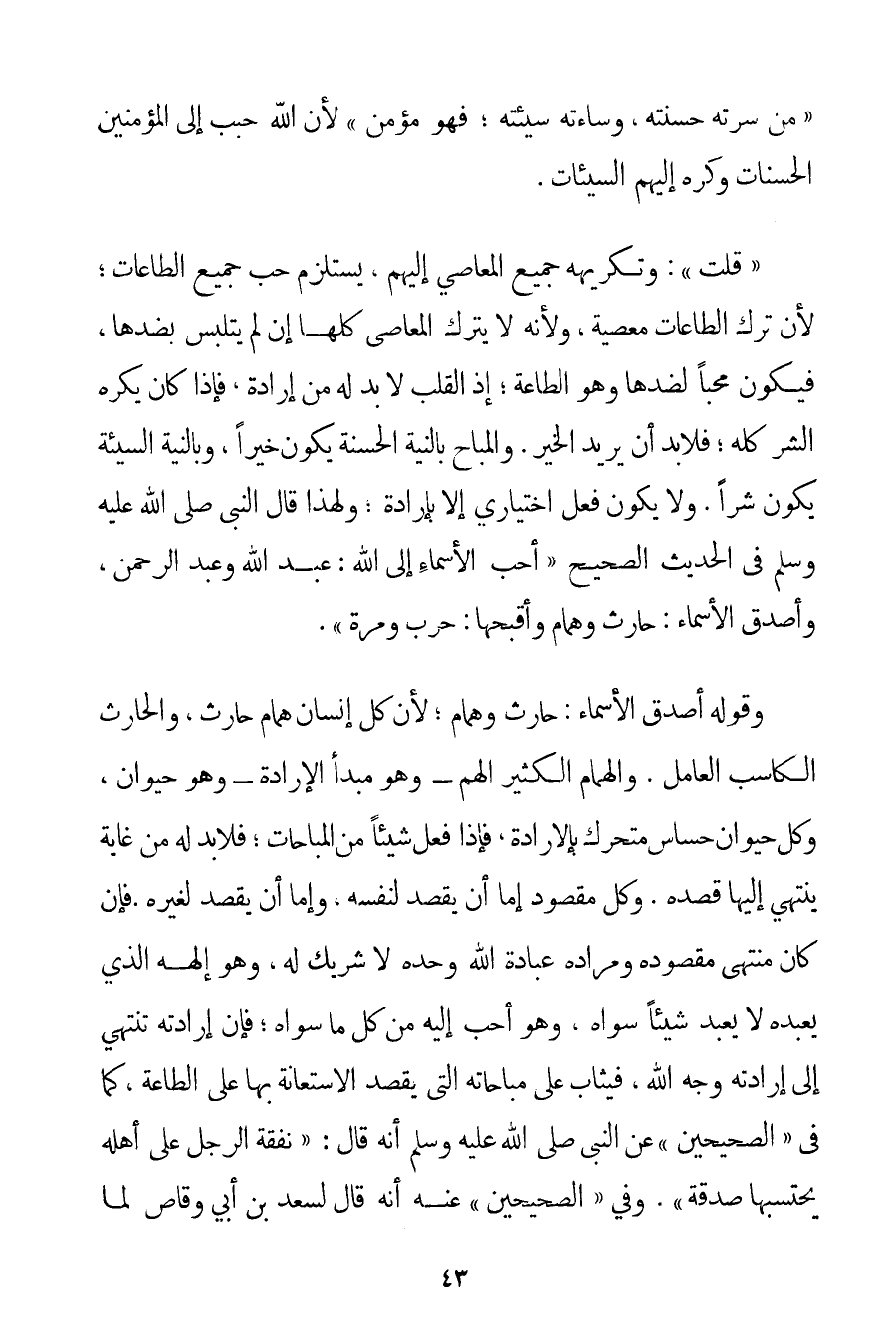 {مَنْ سَرَّتْهُ حَسَنَتُهُ وَسَاءَتْهُ سَيِّئَتُهُ؛ فَهُوَ مُؤْمِنٌ} لِأَنَّ اللَّهَ حَبَّبَ إلَى الْمُؤْمِنِينَ الْحَسَنَاتِ وَكَرَّهَ إلَيْهِمْ السَّيِّئَاتِ. " قُلْت ": وَتَكْرِيهُهُ جَمِيعَ الْمَعَاصِي إلَيْهِمْ يَسْتَلْزِمُ حُبَّ جَمِيعِ الطَّاعَاتِ؛ لِأَنَّ تَرْكَ الطَّاعَاتِ مَعْصِيَةٌ وَلِأَنَّهُ لَا يَتْرُكُ الْمَعَاصِيَ كُلَّهَا إنْ لَمْ يَتَلَبَّسْ بِضِدِّهَا فَيَكُونُ مُحِبًّا لِضِدِّهَا وَهُوَ الطَّاعَةُ؛ إذْ الْقَلْبُ لَا بُدَّ لَهُ مِنْ إرَادَةٍ فَإِذَا كَانَ يَكْرَهُ الشَّرَّ كُلَّهُ؛ فَلَا بُدَّ أَنْ يُرِيدَ الْخَيْرَ. وَالْمُبَاحُ بِالنِّيَّةِ الْحَسَنَةِ يَكُونُ خَيْرًا وَبِالنِّيَّةِ السَّيِّئَةِ يَكُونُ شَرًّا. وَلَا يَكُونُ فِعْلٌ اخْتِيَارِيٌّ إلَّا بِإِرَادَةِ؛ وَلِهَذَا قَالَ النَّبِيُّ صَلَّى اللَّهُ عَلَيْهِ وَسَلَّمَ فِي الْحَدِيثِ الصَّحِيحِ {أَحَبُّ الْأَسْمَاءِ إلَى اللَّهِ: عَبْدُ اللَّهِ وَعَبْدُ الرَّحْمَنِ وَأَصْدَقُ الْأَسْمَاءِ: حَارِثٌ وَهَمَّامٌ وَأَقْبَحُهَا: حَرْبٌ وَمُرَّةُ} . وَقَوْلُهُ أَصْدَقُ الْأَسْمَاءِ: حَارِثٌ وَهَمَّامٌ؛ لِأَنَّ كُلَّ إنْسَانٍ هَمَّامٌ حَارِثٌ وَالْحَارِثُ الْكَاسِبُ الْعَامِلُ. وَالْهَمَّامُ الْكَثِيرُ الْهَمِّ - وَهُوَ مَبْدَأُ الْإِرَادَةِ - وَهُوَ حَيَوَانٌ، وَكُلُّ حَيَوَانٍ حَسَّاسٌ مُتَحَرِّكٌ بِالْإِرَادَةِ فَإِذَا فَعَلَ شَيْئًا مِنْ الْمُبَاحَاتِ؛ فَلَا بُدَّ لَهُ مِنْ غَايَةٍ يَنْتَهِي إلَيْهَا قَصْدُهُ. وَكُلُّ مَقْصُودٍ إمَّا أَنْ يُقْصَدَ لِنَفْسِهِ وَإِمَّا أَنْ يُقْصَدَ لِغَيْرِهِ. فَإِنْ كَانَ مُنْتَهَى مَقْصُودِهِ وَمُرَادِهِ عِبَادَةَ اللَّهِ وَحْدَهُ لَا شَرِيكَ لَهُ وَهُوَ إلَهُهُ الَّذِي يَعْبُدُهُ لَا يَعْبُدُ شَيْئًا سِوَاهُ وَهُوَ أَحَبُّ إلَيْهِ مِنْ كُلِّ مَا سِوَاهُ؛ فَإِنَّ إرَادَتَهُ تَنْتَهِي إلَى إرَادَتِهِ وَجْهَ اللَّهِ فَيُثَابُ عَلَى مُبَاحَاتِهِ الَّتِي يَقْصِدُ الِاسْتِعَانَةَ بِهَا عَلَى الطَّاعَةِ كَمَا فِي " الصَّحِيحَيْنِ " عَنْ النَّبِيِّ صَلَّى اللَّهُ عَلَيْهِ وَسَلَّمَ أَنَّهُ قَالَ: {نَفَقَةُ الرَّجُلِ عَلَى أَهْلِهِ يَحْتَسِبُهَا صَدَقَةً} . وَفِي " الصَّحِيحَيْنِ " عَنْهُ أَنَّهُ {قَالَ لِسَعْدِ بْنِ أَبِي وَقَّاصٍ لَمَّا