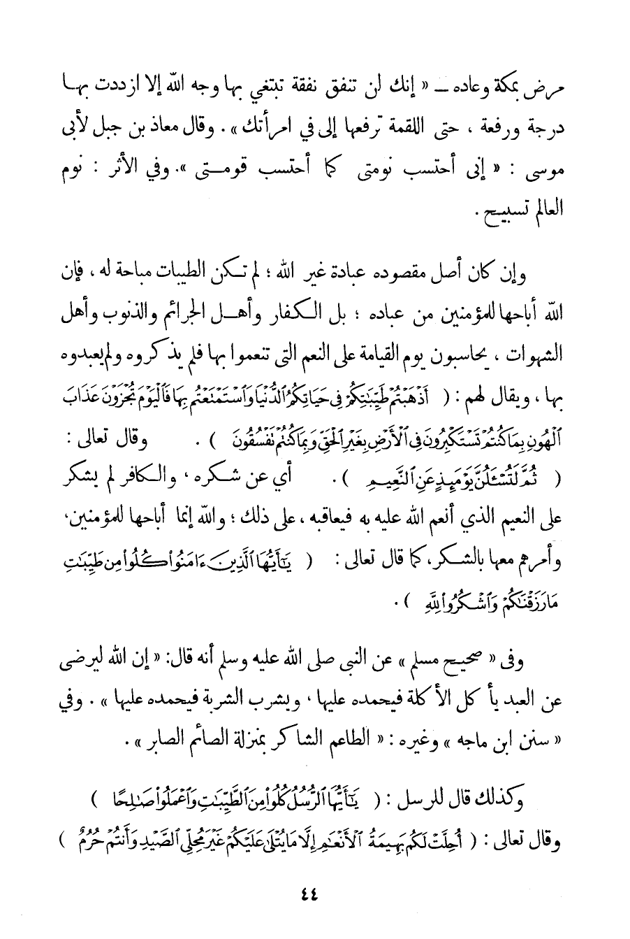 مَرِضَ بِمَكَّةَ وَعَادَهُ - إنَّك لَنْ تُنْفِقَ نَفَقَةً تَبْتَغِي بِهَا وَجْهَ اللَّهِ إلَّا ازْدَدْت بِهَا دَرَجَةً وَرِفْعَةً حَتَّى اللُّقْمَةُ تَرْفَعُهَا إلَى فِي امْرَأَتِك} . وَقَالَ مُعَاذُ بْنُ جَبَلٍ لِأَبِي مُوسَى: " إنِّي أَحْتَسِبُ نَوْمَتِي كَمَا أَحْتَسِبُ قَوْمَتِي ". وَفِي الْأَثَرِ: نَوْمُ الْعَالِمِ تَسْبِيحٌ. وَإِنْ كَانَ أَصْلُ مَقْصُودِهِ عِبَادَةَ غَيْرِ اللَّهِ؛ لَمْ تَكُنْ الطَّيِّبَاتُ مُبَاحَةً لَهُ فَإِنَّ اللَّهَ أَبَاحَهَا لِلْمُؤْمِنِينَ مِنْ عِبَادِهِ؛ بَلْ الْكُفَّارُ وَأَهْلُ الْجَرَائِمِ وَالذُّنُوبِ وَأَهْلُ الشَّهَوَاتِ يُحَاسَبُونَ يَوْمَ الْقِيَامَةِ عَلَى النِّعَمِ الَّتِي تَنَعَّمُوا بِهَا فَلَمْ يَذْكُرُوهُ وَلَمْ يَعْبُدُوهُ بِهَا وَيُقَالُ لَهُمْ: {أَذْهَبْتُمْ طَيِّبَاتِكُمْ فِي حَيَاتِكُمُ الدُّنْيَا وَاسْتَمْتَعْتُمْ بِهَا فَالْيَوْمَ تُجْزَوْنَ عَذَابَ الْهُونِ بِمَا كُنْتُمْ تَسْتَكْبِرُونَ فِي الْأَرْضِ بِغَيْرِ الْحَقِّ وَبِمَا كُنْتُمْ تَفْسُقُونَ} . وَقَالَ تَعَالَى: {ثُمَّ لَتُسْأَلُنَّ يَوْمَئِذٍ عَنِ النَّعِيمِ} . أَيْ عَنْ شُكْرِهِ وَالْكَافِرُ لَمْ يَشْكُرْ عَلَى النَّعِيمِ الَّذِي أَنْعَمَ اللَّهُ عَلَيْهِ بِهِ فَيُعَاقِبُهُ عَلَى ذَلِكَ؛ وَاَللَّهُ إنَّمَا أَبَاحَهَا لِلْمُؤْمِنِينَ وَأَمَرَهُمْ مَعَهَا بِالشُّكْرِ كَمَا قَالَ تَعَالَى: {يَا أَيُّهَا الَّذِينَ آمَنُوا كُلُوا مِنْ طَيِّبَاتِ مَا رَزَقْنَاكُمْ وَاشْكُرُوا لِلَّهِ} . وَفِي " صَحِيحِ مُسْلِمٍ " عَنْ النَّبِيِّ صَلَّى اللَّهُ عَلَيْهِ وَسَلَّمَ أَنَّهُ قَالَ: {إنَّ اللَّهَ لَيَرْضَى عَنْ الْعَبْدِ يَأْكُلُ الْأَكْلَةَ فَيَحْمَدُهُ عَلَيْهَا وَيَشْرَبُ الشَّرْبَةَ فَيَحْمَدُهُ عَلَيْهَا} . وَفِي " سُنَنِ ابْنِ مَاجَه " وَغَيْرِهِ: {الطَّاعِمُ الشَّاكِرُ بِمَنْزِلَةِ الصَّائِمِ الصَّابِرِ} . وَكَذَلِكَ قَالَ لِلرُّسُلِ: {يَا أَيُّهَا الرُّسُلُ كُلُوا مِنَ الطَّيِّبَاتِ وَاعْمَلُوا صَالِحًا} وَقَالَ تَعَالَى: {أُحِلَّتْ لَكُمْ بَهِيمَةُ الْأَنْعَامِ إلَّا مَا يُتْلَى عَلَيْكُمْ غَيْرَ مُحِلِّي الصَّيْدِ وَأَنْتُمْ