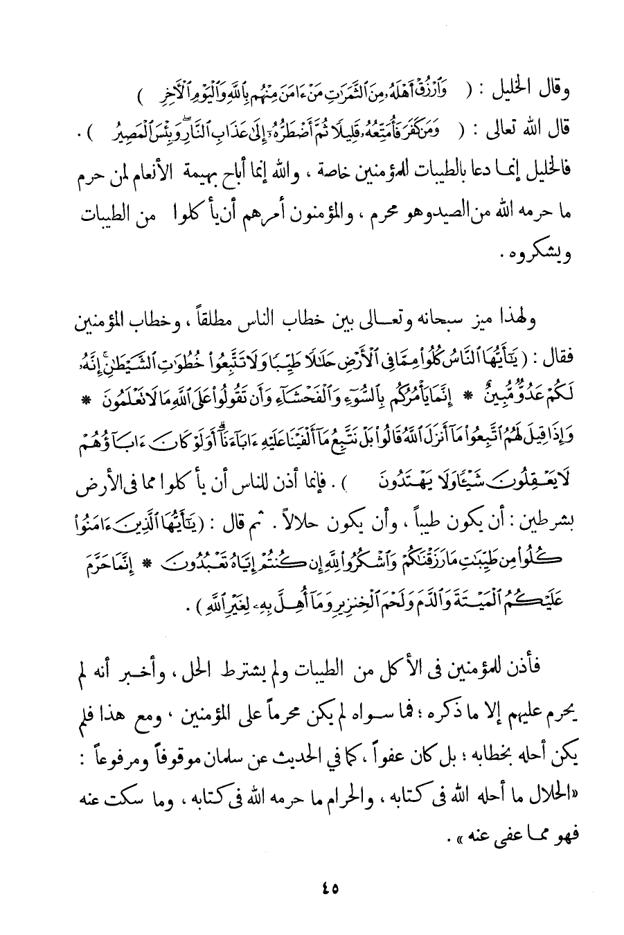 حُرُمٌ} وَقَالَ الْخَلِيلُ: {وَارْزُقْ أَهْلَهُ مِنَ الثَّمَرَاتِ مَنْ آمَنَ مِنْهُمْ بِاللَّهِ وَالْيَوْمِ الْآخِرِ} قَالَ اللَّهُ تَعَالَى: {وَمَنْ كَفَرَ فَأُمَتِّعُهُ قَلِيلًا ثُمَّ أَضْطَرُّهُ إلَى عَذَابِ النَّارِ وَبِئْسَ الْمَصِيرُ} . فَالْخَلِيلُ إنَّمَا دَعَا بِالطَّيِّبَاتِ لِلْمُؤْمِنِينَ خَاصَّةً وَاَللَّهُ إنَّمَا أَبَاحَ بَهِيمَةَ الْأَنْعَامِ لِمَنْ حَرَّمَ مَا حَرَّمَهُ اللَّهُ مِنْ الصَّيْدِ وَهُوَ مُحْرِمٌ وَالْمُؤْمِنُونَ أَمَرَهُمْ أَنْ يَأْكُلُوا مِنْ الطَّيِّبَاتِ وَيَشْكُرُوهُ. وَلِهَذَا مَيَّزَ سُبْحَانَهُ وَتَعَالَى بَيْنَ خِطَابِ النَّاسِ مُطْلَقًا وَخِطَابِ الْمُؤْمِنِينَ فَقَالَ: {يَا أَيُّهَا النَّاسُ كُلُوا مِمَّا فِي الْأَرْضِ حَلَالًا طَيِّبًا وَلَا تَتَّبِعُوا خُطُوَاتِ الشَّيْطَانِ إنَّهُ لَكُمْ عَدُوٌّ مُبِينٌ} {إنَّمَا يَأْمُرُكُمْ بِالسُّوءِ وَالْفَحْشَاءِ وَأَنْ تَقُولُوا عَلَى اللَّهِ مَا لَا تَعْلَمُونَ} {وَإِذَا قِيلَ لَهُمُ اتَّبِعُوا مَا أَنْزَلَ اللَّهُ قَالُوا بَلْ نَتَّبِعُ مَا أَلْفَيْنَا عَلَيْهِ آبَاءَنَا أَوَلَوْ كَانَ آبَاؤُهُمْ لَا يَعْقِلُونَ شَيْئًا وَلَا يَهْتَدُونَ} . فَإِنَّمَا أَذِنَ لِلنَّاسِ أَنْ يَأْكُلُوا مِمَّا فِي الْأَرْضِ بِشَرْطَيْنِ: أَنْ يَكُونَ طَيِّبًا وَأَنْ يَكُونَ حَلَالًا. ثُمَّ قَالَ: {يَا أَيُّهَا الَّذِينَ آمَنُوا كُلُوا مِنْ طَيِّبَاتِ مَا رَزَقْنَاكُمْ وَاشْكُرُوا لِلَّهِ إنْ كُنْتُمْ إيَّاهُ تَعْبُدُونَ} {إنَّمَا حَرَّمَ عَلَيْكُمُ الْمَيْتَةَ وَالدَّمَ وَلَحْمَ الْخِنْزِيرِ وَمَا أُهِلَّ بِهِ لِغَيْرِ اللَّهِ} . فَأَذِنَ لِلْمُؤْمِنِينَ فِي الْأَكْلِ مِنْ الطَّيِّبَاتِ وَلَمْ يَشْتَرِطْ الْحِلَّ، وَأَخْبَرَ أَنَّهُ لَمْ يُحَرِّمْ عَلَيْهِمْ إلَّا مَا ذَكَرَهُ؛ فَمَا سِوَاهُ لَمْ يَكُنْ مُحَرَّمًا عَلَى الْمُؤْمِنِينَ وَمَعَ هَذَا فَلَمْ يَكُنْ أَحَلَّهُ بِخِطَابِهِ؛ بَلْ كَانَ عَفْوًا كَمَا فِي الْحَدِيثِ عَنْ سَلْمَانَ مَوْقُوفًا وَمَرْفُوعًا: {الْحَلَالُ مَا أَحَلَّهُ اللَّهُ فِي كِتَابِهِ وَالْحَرَامُ مَا حَرَّمَهُ اللَّهُ فِي كِتَابِهِ وَمَا سَكَتَ عَنْهُ فَهُوَ مِمَّا عُفِيَ عَنْهُ} .