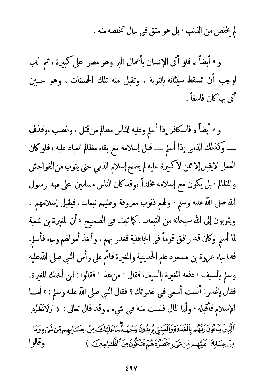 لَمْ يَخْلُصْ مِنْ الذَّنْبِ بَلْ هُوَ مُتَّقٍ فِي حَالِ تَخَلُّصِهِ مِنْهُ. وَ " أَيْضًا " فَلَوْ أَتَى الْإِنْسَانُ بِأَعْمَالِ الْبِرِّ وَهُوَ مُصِرٌّ عَلَى كَبِيرَةٍ ثُمَّ تَابَ لَوَجَبَ أَنْ تَسْقُطَ سَيِّئَاتُهُ بِالتَّوْبَةِ وَتُقْبَلُ مِنْهُ تِلْكَ الْحَسَنَاتُ وَهُوَ حِينَ أَتَى بِهَا كَانَ فَاسِقًا. وَ " أَيْضًا " فَالْكَافِرُ إذَا أَسْلَمَ وَعَلَيْهِ لِلنَّاسِ مَظَالِمُ مِنْ قَتْلٍ وَغَصْبٍ وَقَذْفٍ - وَكَذَلِكَ الذِّمِّيُّ إذَا أَسْلَمَ - قَبْلَ إسْلَامِهِ مَعَ بَقَاءِ مَظَالِمِ الْعِبَادِ عَلَيْهِ؛ فَلَوْ كَانَ الْعَمَلُ لَا يُقْبَلُ إلَّا مِمَّنْ لَا كَبِيرَةَ عَلَيْهِ لَمْ يَصِحَّ إسْلَامُ الذِّمِّيِّ حَتَّى يَتُوبَ مِنْ الْفَوَاحِشِ وَالْمَظَالِمِ؛ بَلْ يَكُونُ مَعَ إسْلَامِهِ مُخَلَّدًا وَقَدْ كَانَ النَّاسُ مُسْلِمِينَ عَلَى عَهْدِ رَسُولِ اللَّهِ صَلَّى اللَّهُ عَلَيْهِ وَسَلَّمَ وَلَهُمْ ذُنُوبٌ مَعْرُوفَةٌ وَعَلَيْهِمْ تَبِعَاتٌ فَيُقْبَلُ إسْلَامُهُمْ وَيَتُوبُونَ إلَى اللَّهِ سُبْحَانَهُ مِنْ التَّبِعَاتِ. كَمَا ثَبَتَ فِي الصَّحِيحِ {أَنَّ الْمُغِيرَةَ بْنَ شُعْبَةَ لَمَّا أَسْلَمَ وَكَانَ قَدْ رَافَقَ قَوْمًا فِي الْجَاهِلِيَّةِ فَغَدَرَ بِهِمْ وَأَخَذَ أَمْوَالَهُمْ وَجَاءَ فَأَسْلَمَ فَلَمَّا جَاءَ عُرْوَةُ بْنُ مَسْعُودٍ عَامَ الْحُدَيْبِيَةِ وَالْمُغِيرَةُ قَائِمٌ عَلَى رَأْسِ النَّبِيِّ صَلَّى اللَّهُ عَلَيْهِ وَسَلَّمَ بِالسَّيْفِ دَفَعَهُ الْمُغِيرَةُ بِالسَّيْفِ فَقَالَ: مَنْ هَذَا فَقَالُوا: ابْنُ أُخْتِك الْمُغِيرَةُ فَقَالَ يَا غُدَرُ أَلَسْت أَسْعَى فِي غُدْرَتِكَ؟ فَقَالَ النَّبِيُّ صَلَّى اللَّهُ عَلَيْهِ وَسَلَّمَ أَمَّا الْإِسْلَامُ فَأَقْبَلُهُ وَأَمَّا الْمَالُ فَلَسْت مِنْهُ فِي شَيْءٍ} وَقَدْ قَالَ تَعَالَى: {وَلَا تَطْرُدِ الَّذِينَ يَدْعُونَ رَبَّهُمْ بِالْغَدَاةِ وَالْعَشِيِّ يُرِيدُونَ وَجْهَهُ مَا عَلَيْكَ مِنْ حِسَابِهِمْ مِنْ شَيْءٍ وَمَا مِنْ حِسَابِكَ عَلَيْهِمْ مِنْ شَيْءٍ فَتَطْرُدَهُمْ فَتَكُونَ مِنَ الظَّالِمِينَ} وَقَالُوا
