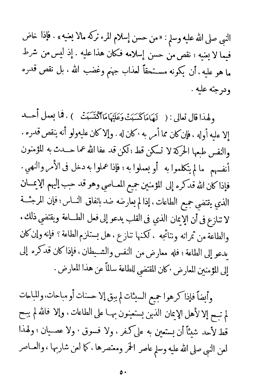 النَّبِيُّ صَلَّى اللَّهُ عَلَيْهِ وَسَلَّمَ {مِنْ حُسْنِ إسْلَامِ الْمَرْءِ تَرْكُهُ مَا لَا يَعْنِيهِ} . فَإِذَا خَاضَ فِيمَا لَا يَعْنِيهِ؛ نَقَصَ مِنْ حُسْنِ إسْلَامِهِ فَكَانَ هَذَا عَلَيْهِ. إذْ لَيْسَ مِنْ شَرْطِ مَا هُوَ عَلَيْهِ أَنْ يَكُونَ مُسْتَحِقًّا لِعَذَابِ جَهَنَّمَ وَغَضَبِ اللَّهِ بَلْ نَقْصُ قَدْرِهِ وَدَرَجَتِهِ عَلَيْهِ. وَلِهَذَا قَالَ تَعَالَى: {لَهَا مَا كَسَبَتْ وَعَلَيْهَا مَا اكْتَسَبَتْ} . فَمَا يَعْمَلُ أَحَدٌ إلَّا عَلَيْهِ أَوْ لَهُ فَإِنْ كَانَ مِمَّا أُمِرَ بِهِ كَانَ لَهُ. وَإِلَّا كَانَ عَلَيْهِ وَلَوْ أَنَّهُ يُنْقِصُ قَدْرَهُ. وَالنَّفْسُ طَبْعُهَا الْحَرَكَةُ لَا تَسْكُنُ قَطُّ؛ لَكِنْ قَدْ عَفَا اللَّهُ عَمَّا حَدَّثَ بِهِ الْمُؤْمِنُونَ أَنْفُسَهُمْ مَا لَمْ يَتَكَلَّمُوا بِهِ أَوْ يَعْمَلُوا بِهِ؛ فَإِذَا عَمِلُوا بِهِ دَخَلَ فِي الْأَمْرِ وَالنَّهْيِ. فَإِذَا كَانَ اللَّهُ قَدْ كَرَّهَ إلَى الْمُؤْمِنِينَ جَمِيعَ الْمَعَاصِي وَهُوَ قَدْ حَبَّبَ إلَيْهِمْ الْإِيمَانَ الَّذِي يَقْتَضِي جَمِيعَ الطَّاعَاتِ إذَا لَمْ يُعَارِضْهُ ضِدٌّ بِاتِّفَاقِ النَّاسِ؛ فَإِنَّ الْمُرْجِئَةَ لَا تُنَازِعُ فِي أَنَّ الْإِيمَانَ الَّذِي فِي الْقَلْبِ يَدْعُو إلَى فِعْلِ الطَّاعَةِ وَيَقْتَضِي ذَلِكَ وَالطَّاعَةُ مِنْ ثَمَرَاتِهِ وَنَتَائِجِهِ لَكِنَّهَا تُنَازِعُ هَلْ يَسْتَلْزِمُ الطَّاعَةَ؟ فَإِنَّهُ وَإِنْ كَانَ يَدْعُو إلَى الطَّاعَةِ؛ فَلَهُ مُعَارِضٌ مِنْ النَّفْسِ وَالشَّيْطَانِ، فَإِذَا كَانَ قَدْ كَرَّهَ إلَى الْمُؤْمِنِينَ الْمُعَارِضَ كَانَ الْمُقْتَضِي لِلطَّاعَةِ سَالِمًا عَنْ هَذَا الْمُعَارِضِ. وَأَيْضًا فَإِذَا كَرِهُوا جَمِيعَ السَّيِّئَاتِ لَمْ يَبْقَ إلَّا حَسَنَاتٌ أَوْ مُبَاحَاتٌ، وَالْمُبَاحَاتُ لَمْ تُبَحْ إلَّا لِأَهْلِ الْإِيمَانِ الَّذِينَ يَسْتَعِينُونَ بِهَا عَلَى الطَّاعَاتِ وَإِلَّا فَاَللَّهُ لَمْ يُبِحْ قَطُّ لِأَحَدِ شَيْئًا أَنْ يَسْتَعِينَ بِهِ عَلَى كُفْرٍ وَلَا فُسُوقٍ وَلَا عِصْيَانٍ؛ وَلِهَذَا لَعَنَ النَّبِيُّ صَلَّى اللَّهُ عَلَيْهِ وَسَلَّمَ عَاصِرَ الْخَمْرِ وَمُعْتَصِرَهَا كَمَا لَعَنَ شَارِبَهَا، وَالْعَاصِرُ