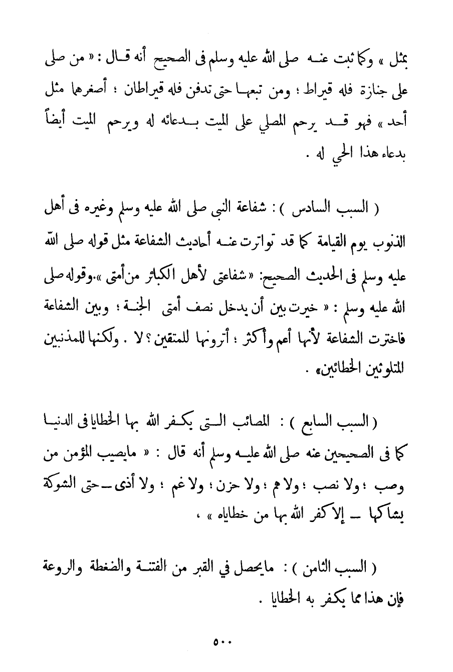 السَّبَبُ السَّادِسُ: شَفَاعَةُ النَّبِيِّ صَلَّى اللَّهُ عَلَيْهِ وَسَلَّمَ وَغَيْرُهُ فِي أَهْلِ الذُّنُوبِ يَوْمَ الْقِيَامَةِ كَمَا قَدْ تَوَاتَرَتْ عَنْهُ أَحَادِيثُ الشَّفَاعَةِ مِثْلَ قَوْلِهِ صَلَّى اللَّهُ عَلَيْهِ وَسَلَّمَ فِي الْحَدِيثِ الصَّحِيحِ: {شَفَاعَتِي لِأَهْلِ الْكَبَائِرِ مِنْ أُمَّتِي} . وَقَوْلُهُ صَلَّى اللَّهُ عَلَيْهِ وَسَلَّمَ {خُيِّرْت بَيْنَ أَنْ يَدْخُلَ نِصْفُ أُمَّتِي الْجَنَّةَ؛ وَبَيْنَ الشَّفَاعَةِ فَاخْتَرْت الشَّفَاعَةَ لِأَنَّهَا أَعَمُّ وَأَكْثَرُ؛ أَتَرَوْنَهَا لِلْمُتَّقِينَ؟ لَا. وَلَكِنَّهَا لِلْمُذْنِبِينَ المتلوثين الْخَطَّائِينَ} .