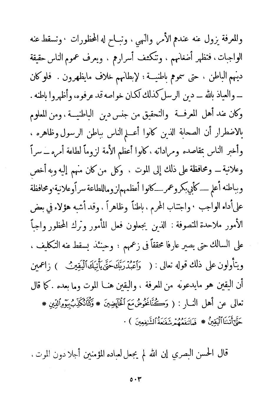 وَالْمَعْرِفَةِ يَزُولُ عَنْهُ عِنْدَهُمْ الْأَمْرُ وَالنَّهْيُ وَتُبَاحُ لَهُ الْمَحْظُورَاتُ وَتَسْقُطُ عَنْهُ الْوَاجِبَاتُ فَتَظْهَرُ أَضْغَانُهُمْ وَتَنْكَشِفُ أَسْرَارُهُمْ وَيَعْرِفُ عُمُومُ النَّاسِ حَقِيقَةَ دِينِهِمْ الْبَاطِنِ حَتَّى سَمَّوْهُمْ بَاطِنِيَّةً؛ لِإِبْطَانِهِمْ خِلَافَ مَا يُظْهِرُونَ. فَلَوْ كَانَ - وَالْعِيَاذُ بِاَللَّهِ - دِينُ الرُّسُلِ كَذَلِكَ لَكَانَ خَوَاصُّهُ قَدْ عَرَفُوهُ وَأَظْهَرُوا بَاطِنَهُ. وَكَانَ عِنْدَ أَهْلِ الْمَعْرِفَةِ وَالتَّحْقِيقِ مِنْ جِنْسِ دِينِ الْبَاطِنِيَّةِ وَمِنْ الْمَعْلُومِ بِالِاضْطِرَارِ أَنَّ الصَّحَابَةَ الَّذِينَ كَانُوا أَعْلَمَ النَّاسِ بِبَاطِنِ الرَّسُولِ وَظَاهِرِهِ وَأَخْبَرَ النَّاسِ بِمَقَاصِدِهِ وَمُرَادَاتِهِ كَانُوا أَعْظَمَ الْأُمَّةِ لُزُومًا لِطَاعَةِ أَمْرِهِ - سِرًّا وَعَلَانِيَةً - وَمُحَافَظَةً عَلَى ذَلِكَ إلَى الْمَوْتِ وَكُلُّ مَنْ كَانَ مِنْهُمْ إلَيْهِ وَبِهِ أَخَصُّ وَبِبَاطِنِهِ أَعْلَمُ - كَأَبِي بَكْرٍ وَعُمَرَ - كَانُوا أَعْظَمَهُمْ لُزُومًا لِلطَّاعَةِ سِرًّا وَعَلَانِيَةً وَمُحَافَظَةً عَلَى أَدَاءِ الْوَاجِبِ وَاجْتِنَابِ الْمُحَرَّمِ بَاطِنًا وَظَاهِرًا وَقَدْ أَشْبَهَ هَؤُلَاءِ فِي بَعْضِ الْأُمُورِ مَلَاحِدَةُ الْمُتَصَوِّفَةِ: الَّذِينَ يَجْعَلُونَ فِعْلَ الْمَأْمُورِ وَتَرْكَ الْمَحْظُورِ وَاجِبًا عَلَى السَّالِكِ حَتَّى يَصِيرَ عَارِفًا مُحَقِّقًا فِي زَعْمِهِمْ؛ وَحِينَئِذٍ يَسْقُطُ عَنْهُ التَّكْلِيفُ وَيَتَأَوَّلُونَ عَلَى ذَلِكَ قَوْله تَعَالَى {وَاعْبُدْ رَبَّكَ حَتَّى يَأْتِيَكَ الْيَقِينُ} زَاعِمِينَ أَنَّ الْيَقِينَ هُوَ مَا يَدَّعُونَهُ مِنْ الْمَعْرِفَةِ وَالْيَقِينُ هُنَا الْمَوْتُ وَمَا بَعْدَهُ. كَمَا قَالَ تَعَالَى عَنْ أَهْلِ النَّارِ: {وَكُنَّا نَخُوضُ مَعَ الْخَائِضِينَ} {وَكُنَّا نُكَذِّبُ بِيَوْمِ الدِّينِ} {حَتَّى أَتَانَا الْيَقِينُ} {فَمَا تَنْفَعُهُمْ شَفَاعَةُ الشَّافِعِينَ} . قَالَ الْحَسَنُ الْبَصْرِيُّ إنَّ اللَّهَ لَمْ يَجْعَلْ لِعِبَادِهِ الْمُؤْمِنِينَ أَجَلًا دُونَ الْمَوْتِ