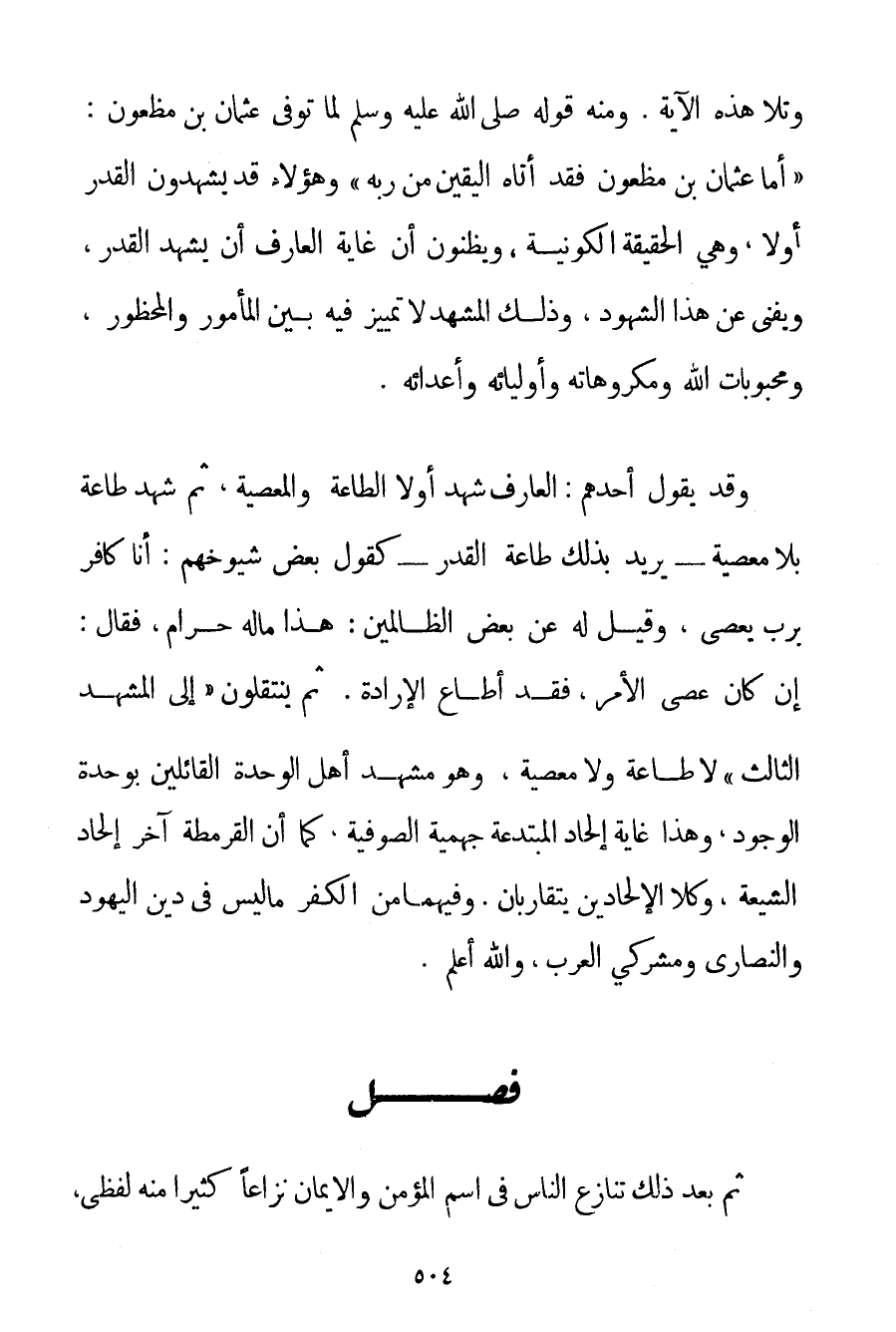 وَتَلَا هَذِهِ الْآيَةَ. وَمِنْهُ {قَوْلُهُ صَلَّى اللَّهُ عَلَيْهِ وَسَلَّمَ لَمَّا تُوُفِّيَ عُثْمَانُ بْنُ مَظْعُونٍ: أَمَّا عُثْمَانُ بْنُ مَظْعُونٍ فَقَدْ أَتَاهُ الْيَقِينُ مِنْ رَبِّهِ} وَهَؤُلَاءِ قَدْ يَشْهَدُونَ الْقَدَرَ أَوَّلًا وَهِيَ الْحَقِيقَةُ الْكَوْنِيَّةُ وَيَظُنُّونَ أَنَّ غَايَةَ الْعَارِفِ أَنْ يَشْهَدَ الْقَدَرَ وَيَفْنَى عَنْ هَذَا الشُّهُودِ وَذَلِكَ الْمَشْهَدُ لَا تَمْيِيزَ فِيهِ بَيْنَ الْمَأْمُورِ وَالْمَحْظُورِ وَمَحْبُوبَاتِ اللَّهِ وَمَكْرُوهَاتِهِ وَأَوْلِيَائِهِ وَأَعْدَائِهِ. وَقَدْ يَقُولُ أَحَدُهُمْ: الْعَارِفُ شَهِدَ أَوَّلًا الطَّاعَةَ وَالْمَعْصِيَةَ ثُمَّ شَهِدَ طَاعَةً بِلَا مَعْصِيَةٍ - يُرِيدُ بِذَلِكَ طَاعَةَ الْقَدَرِ - كَقَوْلِ بَعْضِ شُيُوخِهِمْ: أَنَا كَافِرٌ بِرَبِّ يُعْصَى وَقِيلَ لَهُ عَنْ بَعْضِ الظَّالِمِينَ: هَذَا مَالُهُ حَرَامٌ فَقَالَ: إنْ كَانَ عَصَى الْأَمْرَ فَقَدْ أَطَاعَ الْإِرَادَةَ. ثُمَّ يَنْتَقِلُونَ " إلَى الْمَشْهَدِ الثَّالِثِ " لَا طَاعَةَ وَلَا مَعْصِيَةَ وَهُوَ مَشْهَدُ أَهْلِ الْوَحْدَةِ الْقَائِلِينَ بِوَحْدَةِ الْوُجُودِ وَهَذَا غَايَةُ إلْحَادِ الْمُبْتَدَعَةِ جهمية الصُّوفِيَّةِ كَمَا أَنَّ الْقَرْمَطَةَ آخِرُ إلْحَادِ الشِّيعَةِ وَكِلَا الْإِلْحَادَيْنِ يَتَقَارَبَانِ. وَفِيهِمَا مِنْ الْكُفْرِ مَا لَيْسَ فِي دِينِ الْيَهُودِ وَالنَّصَارَى وَمُشْرِكِي الْعَرَبِ وَاَللَّهُ أَعْلَمُ.