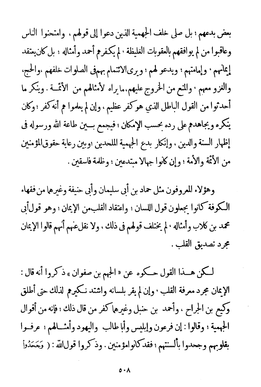 بَعْضِ بِدَعِهِمْ؛ بَلْ صَلَّى خَلْفَ الْجَهْمِيَّة الَّذِينَ دَعَوْا إلَى قَوْلِهِمْ وَامْتَحَنُوا النَّاسَ وَعَاقَبُوا مَنْ لَمْ يُوَافِقْهُمْ بِالْعُقُوبَاتِ الْغَلِيظَةِ لَمْ يُكَفِّرْهُمْ أَحْمَد وَأَمْثَالُهُ؛ بَلْ كَانَ يَعْتَقِدُ إيمَانَهُمْ وَإِمَامَتَهُمْ؛ وَيَدْعُو لَهُمْ؛ وَيَرَى الِائْتِمَامَ بِهِمْ فِي الصَّلَوَاتِ خَلْفَهُمْ وَالْحَجَّ وَالْغَزْوَ مَعَهُمْ وَالْمَنْعَ مِنْ الْخُرُوجِ عَلَيْهِمْ مَا يَرَاهُ لِأَمْثَالِهِمْ مِنْ الْأَئِمَّةِ. وَيُنْكِرُ مَا أَحْدَثُوا مِنْ الْقَوْلِ الْبَاطِلِ الَّذِي هُوَ كُفْرٌ عَظِيمٌ وَإِنْ لَمْ يَعْلَمُوا هُمْ أَنَّهُ كُفْرٌ؛ وَكَانَ يُنْكِرُهُ وَيُجَاهِدُهُمْ عَلَى رَدِّهِ بِحَسَبِ الْإِمْكَانِ؛ فَيَجْمَعُ بَيْنَ طَاعَةِ اللَّهِ وَرَسُولِهِ فِي إظْهَارِ السُّنَّةِ وَالدِّينِ وَإِنْكَارِ بِدَعِ الْجَهْمِيَّة الْمُلْحِدِينَ؛ وَبَيْنَ رِعَايَةِ حُقُوقِ الْمُؤْمِنِينَ مِنْ الْأَئِمَّةِ وَالْأُمَّةِ؛ وَإِنْ كَانُوا جُهَّالًا مُبْتَدِعِينَ؛ وَظَلَمَةً فَاسِقِينَ. وَهَؤُلَاءِ الْمَعْرُوفُونَ مِثْلُ حَمَّادِ بْنِ أَبِي سُلَيْمَانَ وَأَبِي حَنِيفَةَ وَغَيْرِهِمَا مِنْ فُقَهَاءِ الْكُوفَةِ كَانُوا يَجْعَلُونَ قَوْلَ اللِّسَانِ؛ وَاعْتِقَادَ الْقَلْبِ مِنْ الْإِيمَانِ؛ وَهُوَ قَوْلُ أَبِي مُحَمَّدِ بْنِ كُلَّابٍ وَأَمْثَالِهِ لَمْ يَخْتَلِفْ قَوْلُهُمْ فِي ذَلِكَ وَلَا نُقِلَ عَنْهُمْ أَنَّهُمْ قَالُوا الْإِيمَانَ مُجَرَّدُ تَصْدِيقِ الْقَلْبِ. لَكِنَّ هَذَا الْقَوْلَ حَكَوْهُ عَنْ " الْجَهْمِ بْنِ صَفْوَانَ " ذَكَرُوا أَنَّهُ قَالَ: الْإِيمَانُ مُجَرَّدُ مَعْرِفَةِ الْقَلْبِ وَإِنْ لَمْ يُقِرَّ بِلِسَانِهِ وَاشْتَدَّ نَكِيرُهُمْ لِذَلِكَ حَتَّى أَطْلَقَ وَكِيعُ بْنُ الْجَرَّاحِ وَأَحْمَد بْنُ حَنْبَلٍ وَغَيْرُهُمَا كُفْرَ مَنْ قَالَ ذَلِكَ؛ فَإِنَّهُ مِنْ أَقْوَالِ الْجَهْمِيَّة؛ وَقَالُوا: إنَّ فِرْعَوْنَ وَإِبْلِيسَ وَأَبَا طَالِبٍ وَالْيَهُودَ وَأَمْثَالَهُمْ؛ عُرِفُوا بِقُلُوبِهِمْ وَجَحَدُوا بِأَلْسِنَتِهِمْ؛ فَقَدْ كَانُوا مُؤْمِنِينَ. وَذَكَرُوا قَوْلَ اللَّهِ: {وَجَحَدُوا