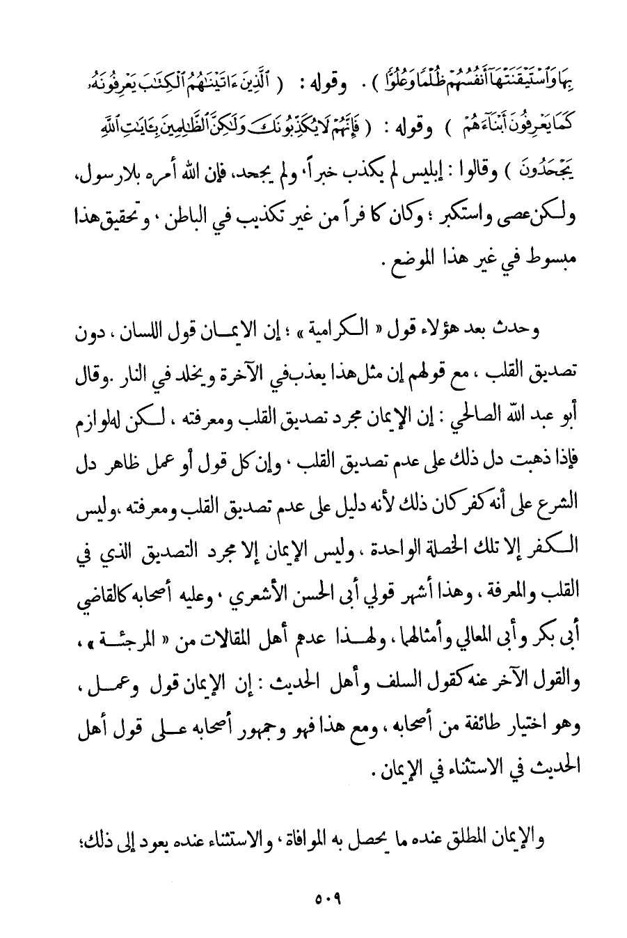 وَحَدَثَ بَعْدَ هَؤُلَاءِ قَوْلُ " الكَرَّامِيَة "؛ إنَّ الْإِيمَانَ قَوْلُ اللِّسَانِ دُونَ تَصْدِيقِ الْقَلْبِ مَعَ قَوْلِهِمْ إنَّ مِثْلَ هَذَا يُعَذَّبُ فِي الْآخِرَةِ وَيُخَلَّدُ فِي النَّارِ. وَقَالَ أَبُو عَبْدِ اللَّهِ الصالحي: إنَّ الْإِيمَانَ مُجَرَّدُ تَصْدِيقِ الْقَلْبِ وَمَعْرِفَتِهِ لَكِنْ لَهُ لَوَازِمُ فَإِذَا ذَهَبَتْ دَلَّ ذَلِكَ عَلَى عَدَمِ تَصْدِيقِ الْقَلْبِ وَإِنَّ كُلَّ قَوْلٍ أَوْ عَمَلٍ ظَاهِرٍ دَلَّ الشَّرْعُ عَلَى أَنَّهُ كُفْرٌ كَانَ ذَلِكَ لِأَنَّهُ دَلِيلٌ عَلَى عَدَمِ تَصْدِيقِ الْقَلْبِ وَمَعْرِفَتِهِ وَلَيْسَ الْكُفْرُ إلَّا تِلْكَ الْخَصْلَةُ الْوَاحِدَةُ وَلَيْسَ الْإِيمَانُ إلَّا مُجَرَّدُ التَّصْدِيقِ الَّذِي فِي الْقَلْبِ وَالْمَعْرِفَةِ وَهَذَا أَشْهَرُ قَوْلَيْ أَبِي الْحَسَنِ الْأَشْعَرِيِّ وَعَلَيْهِ أَصْحَابُهُ كَالْقَاضِي أَبِي بَكْرٍ وَأَبِي الْمَعَالِي وَأَمْثَالِهِمَا وَلِهَذَا عَدَّهُمْ أَهْلُ الْمَقَالَاتِ مِنْ " الْمُرْجِئَةِ " وَالْقَوْلُ الْآخَرُ عَنْهُ كَقَوْلِ السَّلَفِ وَأَهْلِ الْحَدِيثِ: إنَّ الْإِيمَانَ قَوْلٌ وَعَمَلٌ وَهُوَ اخْتِيَارُ طَائِفَةٍ مِنْ أَصْحَابِهِ وَمَعَ هَذَا فَهُوَ وَجُمْهُورُ أَصْحَابِهِ عَلَى قَوْلِ أَهْلِ الْحَدِيثِ فِي الِاسْتِثْنَاءِ فِي الْإِيمَانِ. وَالْإِيمَانُ الْمُطْلَقُ عِنْدَهُ مَا يَحْصُلُ بِهِ الْمُوَافَاةُ وَالِاسْتِثْنَاءُ عِنْدَهُ يَعُودُ إلَى ذَلِكَ؛