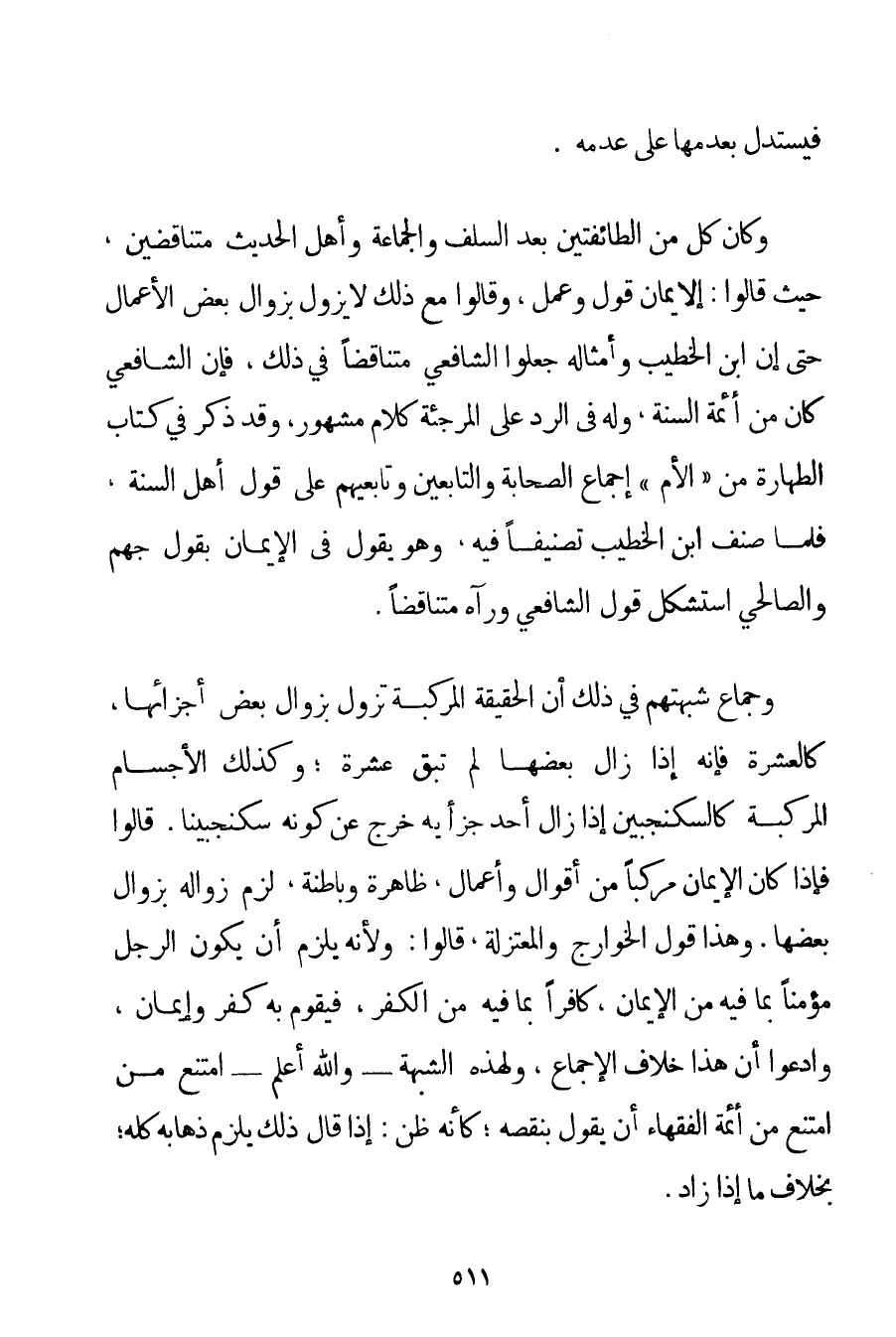 فَيُسْتَدَلُّ بِعَدَمِهِ عَلَى عَدَمِهِ. وَكَانَ كُلٌّ مِنْ الطَّائِفَتَيْنِ بَعْدَ السَّلَفِ وَالْجَمَاعَةِ وَأَهْلِ الْحَدِيثِ مُتَنَاقِضِينَ حَيْثُ قَالُوا: الْإِيمَانُ قَوْلٌ وَعَمَلٌ وَقَالُوا مَعَ ذَلِكَ لَا يَزُولُ بِزَوَالِ بَعْضِ الْأَعْمَالِ حَتَّى إنَّ ابْنَ الْخَطِيبِ وَأَمْثَالَهُ جَعَلُوا الشَّافِعِيَّ مُتَنَاقِضًا فِي ذَلِكَ فَإِنَّ الشَّافِعِيَّ كَانَ مِنْ أَئِمَّةِ السُّنَّةِ وَلَهُ فِي الرَّدِّ عَلَى الْمُرْجِئَةِ كَلَامٌ مَشْهُورٌ وَقَدْ ذَكَرَ فِي كِتَابِ الطَّهَارَةِ مِنْ " الْأُمِّ " إجْمَاعَ الصَّحَابَةِ وَالتَّابِعِينَ وَتَابِعِيهِمْ عَلَى قَوْلِ أَهْلِ السُّنَّةِ فَلَمَّا صَنَّفَ ابْنُ الْخَطِيبِ تَصْنِيفًا فِيهِ وَهُوَ يَقُولُ فِي الْإِيمَانِ بِقَوْلِ جَهْمٍ والصالحي اسْتَشْكَلَ قَوْلَ الشَّافِعِيِّ وَرَآهُ مُتَنَاقِضًا. وَجِمَاعُ شُبْهَتِهِمْ فِي ذَلِكَ أَنَّ الْحَقِيقَةَ الْمُرَكَّبَةَ تَزُولُ بِزَوَالِ بَعْضِ أَجْزَائِهَا كَالْعَشَرَةِ فَإِنَّهُ إذَا زَالَ بَعْضُهَا لَمْ تَبْقَ عَشَرَةً؛ وَكَذَلِكَ الْأَجْسَامُ الْمُرَكَّبَةُ كالسكنجبين إذَا زَالَ أَحَدُ جُزْأَيْهِ خَرَجَ عَنْ كَوْنِهِ سكنجبينا. قَالُوا فَإِذَا كَانَ الْإِيمَانُ مُرَكَّبًا مِنْ أَقْوَالٍ وَأَعْمَالٍ ظَاهِرَةٍ وَبَاطِنَةٍ لَزِمَ زَوَالُهُ بِزَوَالِ بَعْضِهَا. وَهَذَا قَوْل الْخَوَارِجِ وَالْمُعْتَزِلَةِ قَالُوا: وَلِأَنَّهُ يَلْزَمُ أَنْ يَكُونَ الرَّجُلُ مُؤْمِنًا بِمَا فِيهِ مِنْ الْإِيمَانِ كَافِرًا بِمَا فِيهِ مِنْ الْكُفْرِ فَيَقُومُ بِهِ كُفْرٌ وَإِيمَانٌ وَادَّعَوْا أَنَّ هَذَا خِلَافُ الْإِجْمَاعِ وَلِهَذِهِ الشُّبْهَةِ - وَاَللَّهُ أَعْلَمُ - امْتَنَعَ مَنْ امْتَنَعَ مِنْ أَئِمَّةِ الْفُقَهَاءِ أَنْ يَقُولَ بِنَقْصِهِ؛ كَأَنَّهُ ظَنَّ: إذَا قَالَ ذَلِكَ يَلْزَمُ ذَهَابَهُ كُلَّهُ؛ بِخِلَافِ مَا إذَا زَادَ.