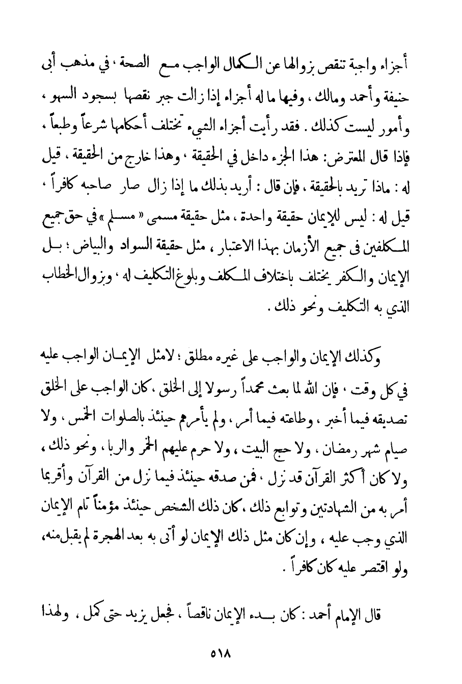 أَجْزَاءٌ وَاجِبَةٌ تَنْقُصُ بِزَوَالِهَا عَنْ الْكَمَالِ الْوَاجِبِ مَعَ الصِّحَّةِ فِي مَذْهَبِ أَبِي حَنِيفَةَ وَأَحْمَد وَمَالِكٍ وَفِيهَا مَا لَهُ أَجْزَاءٌ إذَا زَالَتْ جُبِرَ نَقْصُهَا بِسُجُودِ السَّهْوِ وَأُمُورٌ لَيْسَتْ كَذَلِكَ. فَقَدْ رَأَيْت أَجْزَاءَ الشَّيْءِ تَخْتَلِفُ أَحْكَامُهَا شَرْعًا وَطَبْعًا فَإِذَا قَالَ الْمُعْتَرِضُ: هَذَا الْجُزْءُ دَاخِلٌ فِي الْحَقِيقَةِ وَهَذَا خَارِجٌ مِنْ الْحَقِيقَةِ قِيلَ لَهُ: مَاذَا تُرِيدُ بِالْحَقِيقَةِ فَإِنْ قَالَ: أُرِيدُ بِذَلِكَ مَا إذَا زَالَ صَارَ صَاحِبُهُ كَافِرًا قِيلَ لَهُ: لَيْسَ لِلْإِيمَانِ حَقِيقَةٌ وَاحِدَةٌ مِثْلُ حَقِيقَةِ مُسَمَّى " مُسْلِمٍ " فِي حَقِّ جَمِيعِ الْمُكَلَّفِينَ فِي جَمِيعِ الْأَزْمَانِ بِهَذَا الِاعْتِبَارِ مِثْلُ حَقِيقَةِ السَّوَادِ وَالْبَيَاضِ؛ بَلْ الْإِيمَانُ وَالْكُفْرُ يَخْتَلِفُ بِاخْتِلَافِ الْمُكَلَّفِ وَبُلُوغِ التَّكْلِيفِ لَهُ وَبِزَوَالِ الْخِطَابِ الَّذِي بِهِ التَّكْلِيفُ وَنَحْوِ ذَلِكَ. وَكَذَلِكَ الْإِيمَانُ وَالْوَاجِبُ عَلَى غَيْرِهِ مُطْلَقٌ؛ لَا مِثْلَ الْإِيمَانِ الْوَاجِبِ عَلَيْهِ فِي كُلِّ وَقْتٍ فَإِنَّ اللَّهَ لَمَّا بَعَثَ مُحَمَّدًا رَسُولًا إلَى الْخَلْقِ كَانَ الْوَاجِبُ عَلَى الْخَلْقِ تَصْدِيقَهُ فِيمَا أَخْبَرَ وَطَاعَتَهُ فِيمَا أَمَرَ وَلَمْ يَأْمُرْهُمْ حِينَئِذٍ بِالصَّلَوَاتِ الْخَمْسِ وَلَا صِيَامِ شَهْرِ رَمَضَانَ وَلَا حَجِّ الْبَيْتِ وَلَا حَرَّمَ عَلَيْهِمْ الْخَمْرَ وَالرِّبَا وَنَحْوَ ذَلِكَ وَلَا كَانَ أَكْثَرُ الْقُرْآنِ قَدْ نَزَلَ فَمَنْ صَدَّقَهُ حِينَئِذٍ فِيمَا نَزَّلَ مِنْ الْقُرْآنِ وَأَقَرَّ بِمَا أَمَرَ بِهِ مِنْ الشَّهَادَتَيْنِ وَتَوَابِعِ ذَلِكَ كَانَ ذَلِكَ الشَّخْصُ حِينَئِذٍ مُؤْمِنًا تَامَّ الْإِيمَانِ الَّذِي وَجَبَ عَلَيْهِ وَإِنْ كَانَ مِثْلُ ذَلِكَ الْإِيمَانِ لَوْ أَتَى بِهِ بَعْدَ الْهِجْرَةِ لَمْ يُقْبَلْ مِنْهُ وَلَوْ اقْتَصَرَ عَلَيْهِ كَانَ كَافِرًا. قَالَ الْإِمَامُ أَحْمَدُ: كَانَ بَدْءُ الْإِيمَانِ نَاقِصًا فَجَعَلَ يَزِيدُ حَتَّى كَمُلَ، وَلِهَذَا
