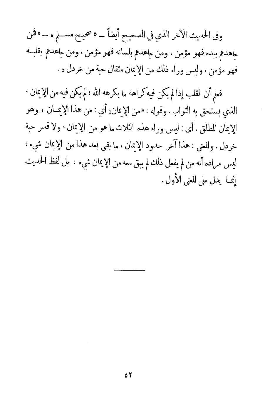 وَفِي الْحَدِيثِ الْآخَرِ الَّذِي فِي الصَّحِيحِ أَيْضًا - " صَحِيحِ مُسْلِمٍ " -: {فَمَنْ جَاهَدَهُمْ بِيَدِهِ فَهُوَ مُؤْمِنٌ وَمَنْ جَاهَدَهُمْ بِلِسَانِهِ فَهُوَ مُؤْمِنٌ وَمَنْ جَاهَدَهُمْ بِقَلْبِهِ فَهُوَ مُؤْمِنٌ وَلَيْسَ وَرَاءَ ذَلِكَ مِنْ الْإِيمَانِ مِثْقَالُ حَبَّةٍ مِنْ خَرْدَلٍ} . فَعُلِمَ أَنَّ الْقَلْبَ إذَا لَمْ يَكُنْ فِيهِ كَرَاهَةُ مَا يَكْرَهُهُ اللَّهُ؛ لَمْ يَكُنْ فِيهِ مِنْ الْإِيمَانِ الَّذِي يَسْتَحِقُّ بِهِ الثَّوَابَ. وَقَوْلُهُ: {مِنْ الْإِيمَانِ} أَيْ: مِنْ هَذَا الْإِيمَانِ وَهُوَ الْإِيمَانُ الْمُطْلَقُ. أَيْ: لَيْسَ وَرَاءَ هَذِهِ الثَّلَاثِ مَا هُوَ مِنْ الْإِيمَانِ وَلَا قَدْرُ حَبَّةِ خَرْدَلٍ. وَالْمَعْنَى: هَذَا آخِرُ حُدُودِ الْإِيمَانِ، مَا بَقِيَ بَعْدَ هَذَا مِنْ الْإِيمَانِ شَيْءٌ؛ لَيْسَ مُرَادُهُ أَنَّهُ مَنْ لَمْ يَفْعَلْ ذَلِكَ لَمْ يَبْقَ مَعَهُ مِنْ الْإِيمَانِ شَيْءٌ؛ بَلْ لَفْظُ الْحَدِيثِ إنَّمَا يَدُلُّ عَلَى الْمَعْنَى الْأَوَّلِ.