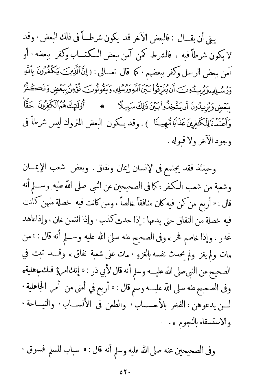 يَبْقَى أَنْ يُقَالَ: فَالْبَعْضُ الْآخَرُ قَدْ يَكُونُ شَرْطًا فِي ذَلِكَ الْبَعْضِ وَقَدْ لَا يَكُونُ شَرْطًا فِيهِ فَالشَّرْطُ كَمَنْ آمَنَ بِبَعْضِ الْكِتَابِ وَكَفَرَ بِبَعْضِهِ أَوْ آمَنَ بِبَعْضِ الرُّسُلِ وَكَفَرَ بِبَعْضِهِمْ كَمَا قَالَ تَعَالَى: {إنَّ الَّذِينَ يَكْفُرُونَ بِاللَّهِ وَرُسُلِهِ وَيُرِيدُونَ أَنْ يُفَرِّقُوا بَيْنَ اللَّهِ وَرُسُلِهِ وَيَقُولُونَ نُؤْمِنُ بِبَعْضٍ وَنَكْفُرُ بِبَعْضٍ وَيُرِيدُونَ أَنْ يَتَّخِذُوا بَيْنَ ذَلِكَ سَبِيلًا} {أُولَئِكَ هُمُ الْكَافِرُونَ حَقًّا وَأَعْتَدْنَا لِلْكَافِرِينَ عَذَابًا مُهِينًا} . وَقَدْ يَكُونُ الْبَعْضُ الْمَتْرُوكُ لَيْسَ شَرْطًا فِي وُجُودِ الْآخَرِ وَلَا قَبُولِهِ.