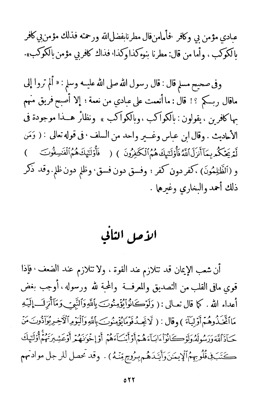 عِبَادِي مُؤْمِنٌ بِي وَكَافِرٌ فَأَمَّا مَنْ قَالَ مُطِرْنَا بِفَضْلِ اللَّهِ وَرَحْمَتِهِ فَذَلِكَ مُؤْمِنٌ بِي كَافِرٌ بِالْكَوْكَبِ وَأَمَّا مَنْ قَالَ: مُطِرْنَا بِنَوْءِ كَذَا وَكَذَا فَذَاكَ كَافِرٌ بِي مُؤْمِنٌ بِالْكَوْكَبِ} . وَفِي صَحِيحِ مُسْلِمٍ قَالَ: قَالَ رَسُولُ اللَّهِ صَلَّى اللَّهُ عَلَيْهِ وَسَلَّمَ {أَلَمْ تَرَوْا إلَى مَا قَالَ رَبُّكُمْ قَالَ: مَا أَنْعَمْت عَلَى عِبَادِي مِنْ نِعْمَةٍ؛ إلَّا أَصْبَحَ فَرِيقٌ مِنْهُمْ بِهَا كَافِرِينَ يَقُولُونَ: بِالْكَوْكَبِ وَبِالْكَوَاكِبِ} وَنَظَائِرُ هَذَا مَوْجُودَةٌ فِي الْأَحَادِيثِ. وَقَالَ ابْنُ عَبَّاسٍ وَغَيْرُ وَاحِدٍ مِنْ السَّلَفِ فِي قَوْله تَعَالَى {وَمَنْ لَمْ يَحْكُمْ بِمَا أَنْزَلَ اللَّهُ فَأُولَئِكَ هُمُ الْكَافِرُونَ} {فَأُولَئِكَ هُمُ الْفَاسِقُونَ} و {الظَّالِمُونَ} كُفْرٌ دُونَ كُفْرٍ؛ وَفِسْقٌ دُونَ فِسْقٍ وَظُلْمٌ دُونَ ظُلْمٍ. وَقَدْ ذَكَرَ ذَلِكَ أَحْمَدُ وَالْبُخَارِيُّ وَغَيْرُهُمَا.