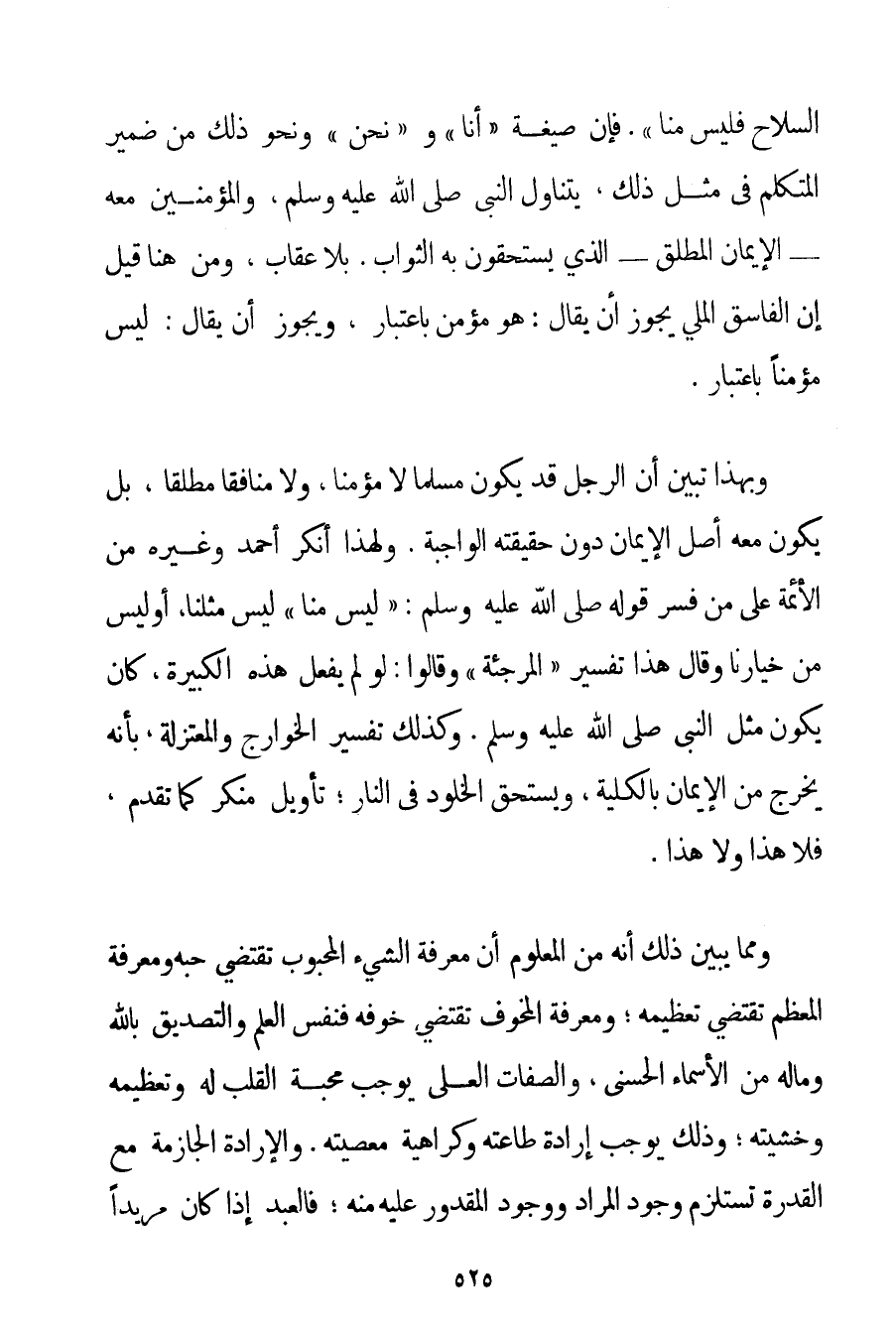 السِّلَاحَ فَلَيْسَ مِنَّا} . فَإِنَّ صِيغَةَ " أَنَا " وَ " نَحْنُ " وَنَحْوَ ذَلِكَ مِنْ ضَمِيرِ الْمُتَكَلِّمِ فِي مِثْلِ ذَلِكَ يَتَنَاوَلُ النَّبِيَّ صَلَّى اللَّهُ عَلَيْهِ وَسَلَّمَ وَالْمُؤْمِنِينَ مَعَهُ - الْإِيمَانُ الْمُطْلَقُ - الَّذِي يَسْتَحِقُّونَ بِهِ الثَّوَابَ. بِلَا عِقَابٍ وَمِنْ هُنَا قِيلَ إنَّ الْفَاسِقَ الْمِلِّي يَجُوزُ أَنْ يُقَالَ: هُوَ مُؤْمِنٌ بِاعْتِبَارِ وَيَجُوزُ أَنْ يُقَالَ: لَيْسَ مُؤْمِنًا بِاعْتِبَارِ. وَبِهَذَا تَبَيَّنَ أَنَّ الرَّجُلَ قَدْ يَكُونُ مُسْلِمًا لَا مُؤْمِنًا وَلَا مُنَافِقًا مُطْلَقًا بَلْ يَكُونُ مَعَهُ أَصْلُ الْإِيمَانِ دُونَ حَقِيقَتِهِ الْوَاجِبَةِ. وَلِهَذَا أَنْكَرَ أَحْمَد وَغَيْرُهُ مِنْ الْأَئِمَّةِ عَلَى مَنْ فَسَّرَ قَوْلَهُ صَلَّى اللَّهُ عَلَيْهِ وَسَلَّمَ " لَيْسَ مِنَّا " لَيْسَ مِثْلَنَا أَوْ لَيْسَ مِنْ خِيَارِنَا وَقَالَ هَذَا تَفْسِيرُ " الْمُرْجِئَةِ " وَقَالُوا: لَوْ لَمْ يَفْعَلْ هَذِهِ الْكَبِيرَةَ كَانَ يَكُونُ مِثْلَ النَّبِيِّ صَلَّى اللَّهُ عَلَيْهِ وَسَلَّمَ. وَكَذَلِكَ تَفْسِيرُ الْخَوَارِجِ وَالْمُعْتَزِلَةِ بِأَنَّهُ يَخْرُجُ مِنْ الْإِيمَانِ بِالْكُلِّيَّةِ وَيَسْتَحِقُّ الْخُلُودَ فِي النَّارِ؛ تَأْوِيلٌ مُنْكَرٌ كَمَا تَقَدَّمَ فَلَا هَذَا وَلَا هَذَا. وَمِمَّا يُبَيِّنُ ذَلِكَ أَنَّهُ مِنْ الْمَعْلُومِ أَنَّ مَعْرِفَةَ الشَّيْءِ الْمَحْبُوبِ تَقْتَضِي حُبَّهُ وَمَعْرِفَةُ الْمُعَظَّمِ تَقْتَضِي تَعْظِيمَهُ وَمَعْرِفَةُ الْمُخَوَّفِ تَقْتَضِي خَوْفَهُ، فَنَفْسُ الْعِلْمِ وَالتَّصْدِيقُ بِاَللَّهِ وَمَا لَهُ مِنْ الْأَسْمَاءِ الْحُسْنَى وَالصِّفَاتِ الْعُلَى يُوجِبُ مَحَبَّةَ الْقَلْبِ لَهُ وَتَعْظِيمَهُ وَخَشْيَتَهُ؛ وَذَلِكَ يُوجِبُ إرَادَةَ طَاعَتِهِ وَكَرَاهِيَةَ مَعْصِيَتِهِ.