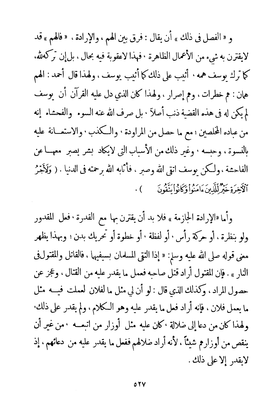 وَالْفَصْلُ فِي ذَلِكَ أَنْ يُقَالَ: فَرْقٌ بَيْنَ الْهَمِّ وَالْإِرَادَةِ " فَالْهَمُّ " قَدْ لَا يَقْتَرِنُ بِهِ شَيْءٌ مِنْ الْأَعْمَالِ الظَّاهِرَةِ فَهَذَا لَا عُقُوبَةَ فِيهِ بِحَالِ بَلْ إنْ تَرَكَهُ لِلَّهِ كَمَا تَرَكَ يُوسُفُ هَمَّهُ أُثِيبَ عَلَى ذَلِكَ كَمَا أُثِيبَ يُوسُفُ وَلِهَذَا قَالَ أَحْمَد: الْهَمُّ هَمَّانِ: هَمُّ خَطِرَاتٍ، وَهَمُّ إصْرَارٍ وَلِهَذَا كَانَ الَّذِي دَلَّ عَلَيْهِ الْقُرْآنُ أَنَّ يُوسُفَ لَمْ يَكُنْ لَهُ فِي هَذِهِ الْقَضِيَّةِ ذَنَبٌ أَصْلًا بَلْ صَرَفَ اللَّهُ عَنْهُ السُّوءَ وَالْفَحْشَاءَ إنَّهُ مِنْ عِبَادِهِ الْمُخْلَصِينَ؛ مَعَ مَا حَصَلَ مِنْ الْمُرَاوَدَةِ وَالْكَذِبِ وَالِاسْتِعَانَةِ عَلَيْهِ بِالنِّسْوَةِ وَحَبْسِهِ وَغَيْرِ ذَلِكَ مِنْ الْأَسْبَابِ الَّتِي لَا يَكَادُ بَشَرٌ يَصْبِرُ مَعَهَا عَنْ الْفَاحِشَةِ وَلَكِنَّ يُوسُفَ اتَّقَى اللَّهَ وَصَبَرَ فَأَثَابَهُ اللَّهُ بِرَحْمَتِهِ فِي الدُّنْيَا. {وَلَأَجْرُ الْآخِرَةِ خَيْرٌ لِلَّذِينَ آمَنُوا وَكَانُوا يَتَّقُونَ} . وَأَمَّا " الْإِرَادَةُ الْجَازِمَةُ " فَلَا بُدَّ أَنْ يَقْتَرِنَ بِهَا مَعَ الْقُدْرَةِ فِعْلُ الْمَقْدُورِ وَلَوْ بِنَظْرَةِ أَوْ حَرَكَةِ رَأْسٍ أَوْ لَفْظَةٍ أَوْ خُطْوَةٍ أَوْ تَحْرِيكِ بَدَنٍ؛ وَبِهَذَا يَظْهَرُ مَعْنَى قَوْلِهِ صَلَّى اللَّهُ عَلَيْهِ وَسَلَّمَ {إذَا الْتَقَى الْمُسْلِمَانِ بِسَيْفَيْهِمَا فَالْقَاتِلُ وَالْمَقْتُولُ فِي النَّارِ} . فَإِنَّ الْمَقْتُولَ أَرَادَ قَتْلَ صَاحِبِهِ فَعَمِلَ مَا يَقْدِرُ عَلَيْهِ مِنْ الْقِتَالِ وَعَجَزَ عَنْ حُصُولِ الْمُرَادِ وَكَذَلِكَ الَّذِي قَالَ: لَوْ أَنَّ لِي مِثْلَ مَا لِفُلَانِ لَعَمِلْت فِيهِ مِثْلَ مَا يَعْمَلُ فُلَانٌ فَإِنَّهُ أَرَادَ فِعْلَ مَا يَقْدِرُ عَلَيْهِ وَهُوَ الْكَلَامُ وَلَمْ يَقْدِرْ عَلَى ذَلِكَ (*) وَلِهَذَا كَانَ مَنْ دَعَا إلَى ضَلَالَةٍ كَانَ عَلَيْهِ مِثْلُ أَوْزَارِ مَنْ اتَّبَعَهُ مِنْ غَيْرِ أَنْ يَنْقُصَ مِنْ أَوْزَارِهِمْ شَيْءٌ لِأَنَّهُ أَرَادَ ضَلَالَهُمْ فَفَعَلَ مَا يَقْدِرُ عَلَيْهِ مِنْ دُعَائِهِمْ إذْ لَا يَقْدِرُ إلَّا عَلَى ذَلِكَ.