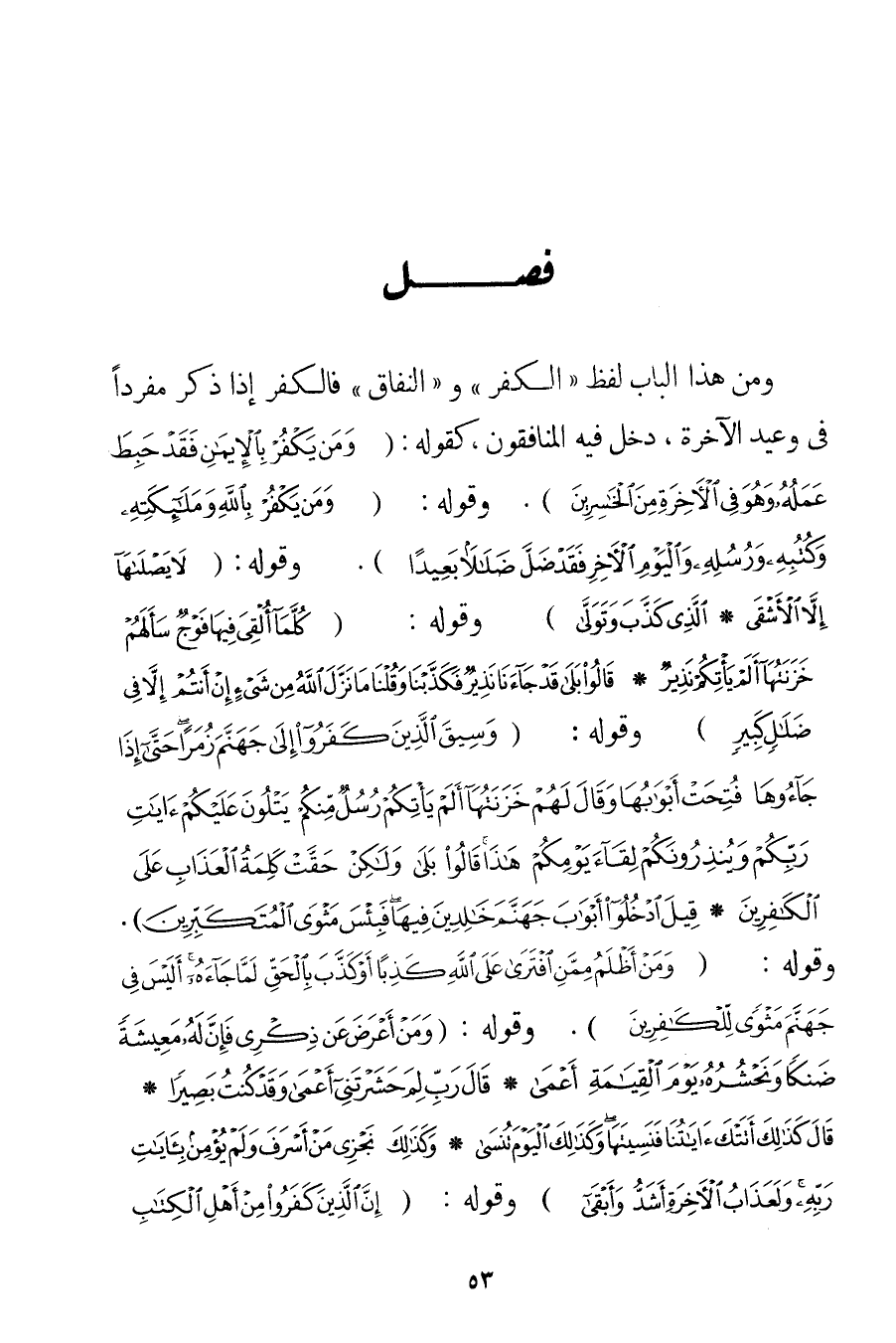 وَمِنْ هَذَا الْبَابِ لَفْظُ " الْكُفْرِ " وَ " النِّفَاقِ " فَالْكُفْرُ إذَا ذُكِرَ مُفْرَدًا فِي وَعِيدِ الْآخِرَةِ دَخَلَ فِيهِ الْمُنَافِقُونَ كَقَوْلِهِ: {وَمَنْ يَكْفُرْ بِالْإِيمَانِ فَقَدْ حَبِطَ عَمَلُهُ وَهُوَ فِي الْآخِرَةِ مِنَ الْخَاسِرِينَ} . وَقَوْلِهِ: {وَمَنْ يَكْفُرْ بِاللَّهِ وَمَلَائِكَتِهِ وَكُتُبِهِ وَرُسُلِهِ وَالْيَوْمِ الْآخِرِ فَقَدْ ضَلَّ ضَلَالًا بَعِيدًا} . وَقَوْلِهِ: {لَا يَصْلَاهَا إلَّا الْأَشْقَى} {الَّذِي كَذَّبَ وَتَوَلَّى} وَقَوْلِهِ: {كُلَّمَا أُلْقِيَ فِيهَا فَوْجٌ سَأَلَهُمْ خَزَنَتُهَا أَلَمْ يَأْتِكُمْ نَذِيرٌ} {قَالُوا بَلَى قَدْ جَاءَنَا نَذِيرٌ فَكَذَّبْنَا وَقُلْنَا مَا نَزَّلَ اللَّهُ مِنْ شَيْءٍ إنْ أَنْتُمْ إلَّا فِي ضَلَالٍ كَبِيرٍ} وَقَوْلِهِ: {وَسِيقَ الَّذِينَ كَفَرُوا إلَى جَهَنَّمَ زُمَرًا حَتَّى إذَا جَاءُوهَا فُتِحَتْ أَبْوَابُهَا وَقَالَ لَهُمْ خَزَنَتُهَا أَلَمْ يَأْتِكُمْ رُسُلٌ مِنْكُمْ يَتْلُونَ عَلَيْكُمْ آيَاتِ رَبِّكُمْ وَيُنْذِرُونَكُمْ لِقَاءَ يَوْمِكُمْ هَذَا قَالُوا بَلَى وَلَكِنْ حَقَّتْ كَلِمَةُ الْعَذَابِ عَلَى الْكَافِرِينَ} {قِيلَ ادْخُلُوا أَبْوَابَ جَهَنَّمَ خَالِدِينَ فِيهَا فَبِئْسَ مَثْوَى الْمُتَكَبِّرِينَ} . وَقَوْلِهِ: {وَمَنْ أَظْلَمُ مِمَّنِ افْتَرَى عَلَى اللَّهِ كَذِبًا أَوْ كَذَّبَ بِالْحَقِّ لَمَّا جَاءَهُ أَلَيْسَ فِي جَهَنَّمَ مَثْوًى لِلْكَافِرِينَ} . وَقَوْلِهِ: {وَمَنْ أَعْرَضَ عَنْ ذِكْرِي فَإِنَّ لَهُ مَعِيشَةً ضَنْكًا وَنَحْشُرُهُ يَوْمَ الْقِيَامَةِ أَعْمَى} {قَالَ رَبِّ لِمَ حَشَرْتَنِي أَعْمَى وَقَدْ كُنْتُ بَصِيرًا} {قَالَ كَذَلِكَ أَتَتْكَ آيَاتُنَا فَنَسِيتَهَا وَكَذَلِكَ الْيَوْمَ تُنْسَى} {وَكَذَلِكَ نَجْزِي مَنْ أَسْرَفَ وَلَمْ يُؤْمِنْ بِآيَاتِ رَبِّهِ وَلَعَذَابُ الْآخِرَةِ أَشَدُّ وَأَبْقَى} وَقَوْلِهِ: