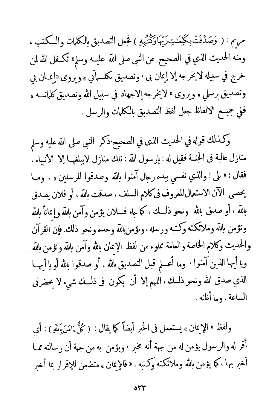 مَرْيَمَ: {وَصَدَّقَتْ بِكَلِمَاتِ رَبِّهَا وَكُتُبِهِ} فَجَعَلَ التَّصْدِيقَ بِالْكَلِمَاتِ وَالْكُتُبِ وَمِنْهُ الْحَدِيثُ الَّذِي فِي الصَّحِيحِ عَنْ النَّبِيِّ صَلَّى اللَّهُ عَلَيْهِ وَسَلَّمَ {تَكَفَّلَ اللَّهُ لِمَنْ خَرَجَ فِي سَبِيلِهِ لَا يُخْرِجُهُ إلَّا إيمَانٌ بِي وَتَصْدِيقٌ بِكَلِمَاتِي وَيُرْوَى إيمَانٌ بِي وَتَصْدِيقٌ بِرُسُلِي وَيُرْوَى لَا يُخْرِجُهُ إلَّا جِهَادٌ فِي سَبِيلِ اللَّهِ وَتَصْدِيقُ كَلِمَاتِهِ} فَفِي جَمِيعِ الْأَلْفَاظِ جَعَلَ لَفْظَ التَّصْدِيقِ بِالْكَلِمَاتِ وَالرُّسُلِ. وَكَذَلِكَ قَوْلُهُ فِي الْحَدِيثِ الَّذِي فِي الصَّحِيحِ {ذَكَرَ النَّبِيُّ صَلَّى اللَّهُ عَلَيْهِ وَسَلَّمَ مَنَازِلَ عَالِيَةً فِي الْجَنَّةِ فَقِيلَ لَهُ: يَا رَسُولَ اللَّهِ: تِلْكَ مَنَازِلُ لَا يَبْلُغُهَا إلَّا الْأَنْبِيَاءُ فَقَالَ: بَلَى وَاَلَّذِي نَفْسِي بِيَدِهِ رِجَالٌ آمَنُوا بِاَللَّهِ وَصَدَّقُوا الْمُرْسَلِينَ} . وَمَا يُحْصَى الْآنَ الِاسْتِعْمَالُ الْمَعْرُوفُ فِي كَلَامِ السَّلَفِ صَدَّقْت بِاَللَّهِ، أَوْ فُلَانٌ يُصَدِّقُ بِاَللَّهِ أَوْ صَدَّقَ بِاَللَّهِ وَنَحْوِ ذَلِكَ كَمَا جَاءَ فُلَانٌ يُؤْمِنُ وَآمَنَ بِاَللَّهِ وَإِيمَانًا بِاَللَّهِ وَنُؤْمِنُ بِاَللَّهِ وَمَلَائِكَتِهِ وَكُتُبِهِ وَرُسُلِهِ وَنُؤْمِنُ بِاَللَّهِ وَحْدَهُ وَنَحْوِ ذَلِكَ. فَإِنَّ الْقُرْآنَ وَالْحَدِيثَ وَكَلَامَ الْخَاصَّةِ وَالْعَامَّةِ مَمْلُوءٌ مِنْ لَفْظِ الْإِيمَانِ بِاَللَّهِ وَآمَنَ بِاَللَّهِ وَنُؤْمِنُ بِاَللَّهِ وَيَا أَيُّهَا الَّذِينَ آمَنُوا وَمَا أَعْلَمُ قِيلَ التَّصْدِيقُ بِاَللَّهِ أَوْ صَدَّقُوا بِاَللَّهِ أَوْ يَا أَيُّهَا الَّذِي صَدَّقَ اللَّهَ وَنَحْوُ ذَلِكَ اللَّهُمَّ إلَّا أَنْ يَكُونَ فِي ذَلِكَ شَيْءٌ لَا يَحْضُرُنِي السَّاعَةَ وَمَا أَظُنُّهُ. وَلَفْظُ " الْإِيمَانِ " يُسْتَعْمَلُ فِي الْخَبَرِ أَيْضًا كَمَا يُقَالُ: {كُلٌّ آمَنَ بِاللَّهِ} أَيْ أَقَرَّ لَهُ وَالرَّسُولُ يُؤْمِنُ لَهُ مِنْ جِهَةِ أَنَّهُ مُخْبِرٌ وَيُؤْمِنُ بِهِ مِنْ جِهَةِ أَنَّ رِسَالَتَهُ مِمَّا أَخْبَرَ بِهَا كَمَا يُؤْمِنُ بِاَللَّهِ وَمَلَائِكَتِهِ وَكُتُبِهِ. " فَالْإِيمَانُ " مُتَضَمِّنٌ لِلْإِقْرَارِ بِمَا أَخْبَرَ