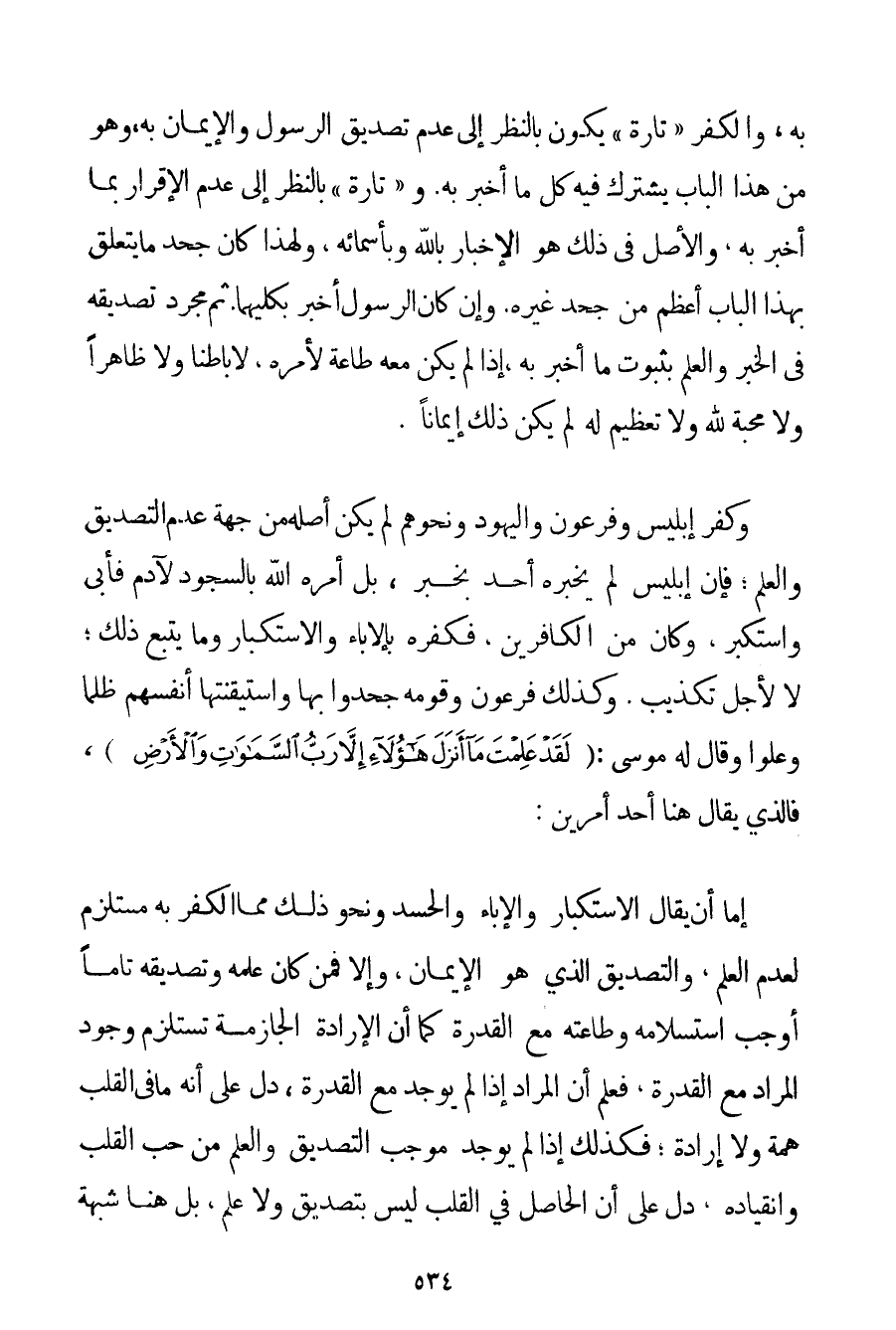 بِهِ وَالْكُفْرُ " تَارَةً " يَكُونُ بِالنَّظَرِ إلَى عَدَمِ تَصْدِيقِ الرَّسُولِ وَالْإِيمَانِ بِهِ وَهُوَ مِنْ هَذَا الْبَابِ يَشْتَرِكُ فِيهِ كُلُّ مَا أَخْبَرَ بِهِ. وَ " تَارَةً " بِالنَّظَرِ إلَى عَدَمِ الْإِقْرَارِ بِمَا أَخْبَرَ بِهِ وَالْأَصْلُ فِي ذَلِكَ هُوَ الْإِخْبَارُ بِاَللَّهِ وَبِأَسْمَائِهِ وَلِهَذَا كَانَ جَحْدُ مَا يَتَعَلَّقُ بِهَذَا الْبَابِ أَعْظَمَ مَنْ جَحْدِ غَيْرِهِ. وَإِنْ كَانَ الرَّسُولُ أَخْبَرَ بِكِلَيْهِمَا ثُمَّ مُجَرَّدُ تَصْدِيقِهِ فِي الْخَبَرِ وَالْعِلْمِ بِثُبُوتِ مَا أَخْبَرَ بِهِ إذَا لَمْ يَكُنْ مَعَهُ طَاعَةٌ لِأَمْرِهِ لَا بَاطِنًا وَلَا ظَاهِرًا وَلَا مَحَبَّةٌ لِلَّهِ وَلَا تَعْظِيمٌ لَهُ لَمْ يَكُنْ ذَلِكَ إيمَانًا. وَكُفْرُ إبْلِيسَ وَفِرْعَوْنَ وَالْيَهُودِ وَنَحْوُهُمْ لَمْ يَكُنْ أَصْلُهُ مِنْ جِهَةِ عَدَمِ التَّصْدِيقِ وَالْعِلْمِ؛ فَإِنَّ إبْلِيسَ لَمْ يُخْبِرْهُ أَحَدٌ بِخَبَرِ بَلْ أَمَرَهُ اللَّهُ بِالسُّجُودِ لِآدَمَ فَأَبَى وَاسْتَكْبَرَ وَكَانَ مِنْ الْكَافِرِينَ فَكُفْرُهُ بِالْإِبَاءِ وَالِاسْتِكْبَارِ وَمَا يَتْبَعُ ذَلِكَ؛ لَا لِأَجْلِ تَكْذِيبٍ. وَكَذَلِكَ فِرْعَوْنُ وَقَوْمُهُ جَحَدُوا بِهَا وَاسْتَيْقَنَتْهَا أَنْفُسُهُمْ ظُلْمًا وَعُلُوًّا وَقَالَ لَهُ مُوسَى: {لَقَدْ عَلِمْتَ مَا أَنْزَلَ هَؤُلَاءِ إلَّا رَبُّ السَّمَاوَاتِ وَالْأَرْضِ} فَاَلَّذِي يُقَالُ هُنَا أَحَدُ أَمْرَيْنِ: إمَّا أَنْ يُقَالَ الِاسْتِكْبَارُ وَالْإِبَاءُ وَالْحَسَدُ وَنَحْوُ ذَلِكَ مِمَّا الْكُفْرُ بِهِ مُسْتَلْزِمٌ لِعَدَمِ الْعِلْمِ وَالتَّصْدِيقِ الَّذِي هُوَ الْإِيمَانُ وَإِلَّا فَمَنْ كَانَ عِلْمُهُ وَتَصْدِيقُهُ تَامًّا أَوْجَبَ اسْتِسْلَامُهُ وَطَاعَتُهُ مَعَ الْقُدْوَةِ كَمَا أَنَّ الْإِرَادَةَ الْجَازِمَةَ تَسْتَلْزِمُ وُجُودَ الْمُرَادِ مَعَ الْقُدْرَةِ فَعُلِمَ أَنَّ الْمُرَادَ إذَا لَمْ يُوجَدْ مَعَ الْقُدْرَةِ دَلَّ عَلَى أَنَّهُ مَا فِي الْقَلْبِ هِمَّةٌ وَلَا إرَادَةٌ؛ فَكَذَلِكَ إذَا لَمْ يُوجَدْ مُوجَبُ التَّصْدِيقِ وَالْعِلْمِ مِنْ حُبِّ الْقَلْبِ وَانْقِيَادِهِ دَلَّ عَلَى أَنَّ الْحَاصِلَ فِي الْقَلْبِ لَيْسَ بِتَصْدِيقِ وَلَا عِلْمٍ بَلْ هُنَا شُبْهَةٌ