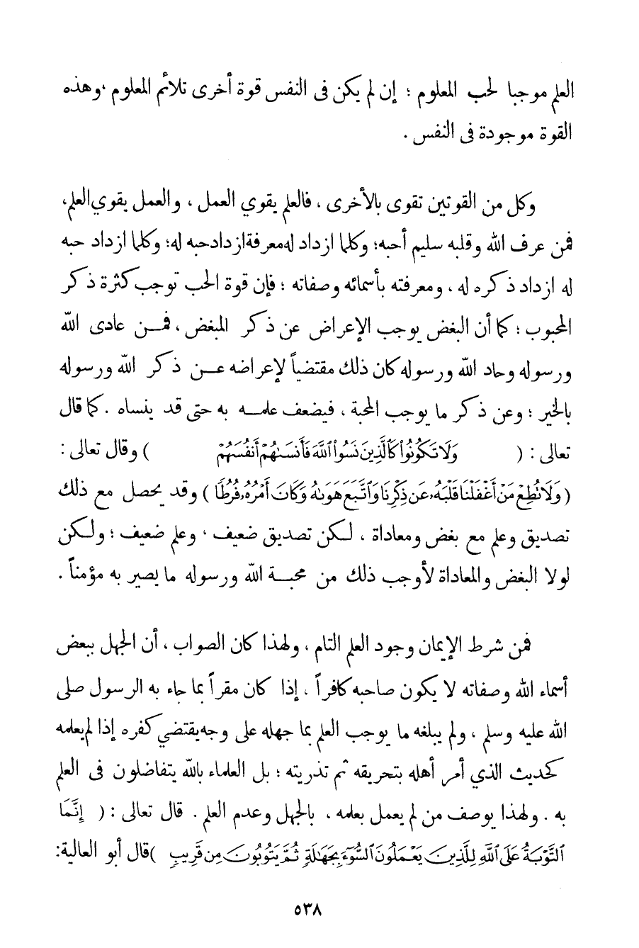 الْعِلْمِ مُوجِبًا لِحُبِّ الْمَعْلُومِ؛ إنْ لَمْ يَكُنْ فِي النَّفْسِ قُوَّةٌ أُخْرَى تُلَائِمُ الْمَعْلُومَ وَهَذِهِ الْقُوَّةُ مَوْجُودَةٌ فِي النَّفْسِ. وَكُلٌّ مِنْ الْقُوَّتَيْنِ تَقْوَى بِالْأُخْرَى فَالْعِلْمُ يُقَوِّي الْعَمَلَ وَالْعَمَلُ يُقَوِّي الْعِلْمَ فَمَنْ عَرَفَ اللَّهَ وَقَلْبُهُ سَلِيمٌ أَحَبَّهُ؛ وَكُلَّمَا ازْدَادَ لَهُ مَعْرِفَةً ازْدَادَ حُبُّهُ لَهُ؛ وَكُلَّمَا ازْدَادَ حُبُّهُ لَهُ ازْدَادَ ذِكْرُهُ لَهُ وَمَعْرِفَتُهُ بِأَسْمَائِهِ وَصِفَاتِهِ؛ فَإِنَّ قُوَّةَ الْحُبِّ تُوجِبُ كَثْرَةَ ذِكْرِ الْمَحْبُوبِ؛ كَمَا أَنَّ الْبُغْضَ يُوجِبُ الْإِعْرَاضَ عَنْ ذِكْرِ الْمُبْغِضِ فَمَنْ عَادَى اللَّهَ وَرَسُولَهُ وَحَادَّ اللَّهَ وَرَسُولَهُ كَانَ ذَلِكَ مُقْتَضِيًا لِإِعْرَاضِهِ عَنْ ذِكْرِ اللَّهِ وَرَسُولِهِ بِالْخَيْرِ؛ وَعَنْ ذِكْرِ مَا يُوجِبُ الْمَحَبَّةَ فَيَضْعُفُ عِلْمُهُ بِهِ حَتَّى قَدْ يَنْسَاهُ. كَمَا قَالَ تَعَالَى: {وَلَا تَكُونُوا كَالَّذِينَ نَسُوا اللَّهَ فَأَنْسَاهُمْ أَنْفُسَهُمْ} وَقَالَ تَعَالَى: {وَلَا تُطِعْ مَنْ أَغْفَلْنَا قَلْبَهُ عَنْ ذِكْرِنَا وَاتَّبَعَ هَوَاهُ وَكَانَ أَمْرُهُ فُرُطًا} وَقَدْ يَحْصُلُ مَعَ ذَلِكَ تَصْدِيقٌ وَعِلْمٌ مَعَ بُغْضٍ وَمُعَادَاةٍ لَكِنْ تَصْدِيقٌ ضَعِيفٌ وَعِلْمٌ ضَعِيفٌ؛ وَلَكِنْ لَوْلَا الْبُغْضُ وَالْمُعَادَاةُ لَأَوْجَبَ ذَلِكَ مِنْ مَحَبَّةِ اللَّهِ وَرَسُولِهِ مَا يَصِيرُ بِهِ مُؤْمِنًا. فَمِنْ شَرْطِ الْإِيمَانِ وُجُودُ الْعِلْمِ التَّامِّ وَلِهَذَا كَانَ الصَّوَابُ أَنَّ الْجَهْلَ بِبَعْضِ أَسْمَاءِ اللَّهِ وَصِفَاتِهِ لَا يَكُونُ صَاحِبُهُ كَافِرًا إذَا كَانَ مُقِرًّا بِمَا جَاءَ بِهِ الرَّسُولُ صَلَّى اللَّهُ عَلَيْهِ وَسَلَّمَ وَلَمْ يَبْلُغْهُ مَا يُوجِبُ الْعِلْمَ بِمَا جَهِلَهُ عَلَى وَجْهٍ يَقْتَضِي كُفْرُهُ إذَا لَمْ يَعْلَمْهُ كَحَدِيثِ الَّذِي أَمَرَ أَهْلَهُ بِتَحْرِيقِهِ ثُمَّ تَذْرِيَتِهِ؛ بَلْ الْعُلَمَاءُ بِاَللَّهِ يَتَفَاضَلُونَ فِي الْعِلْمِ بِهِ. وَلِهَذَا يُوصَفُ مَنْ لَمْ يَعْمَلْ بِعِلْمِهِ بِالْجَهْلِ وَعَدَمِ الْعِلْمِ. قَالَ تَعَالَى: {إنَّمَا التَّوْبَةُ عَلَى اللَّهِ لِلَّذِينَ يَعْمَلُونَ السُّوءَ بِجَهَالَةٍ ثُمَّ يَتُوبُونَ مِنْ قَرِيبٍ} قَالَ أَبُو الْعَالِيَةِ: