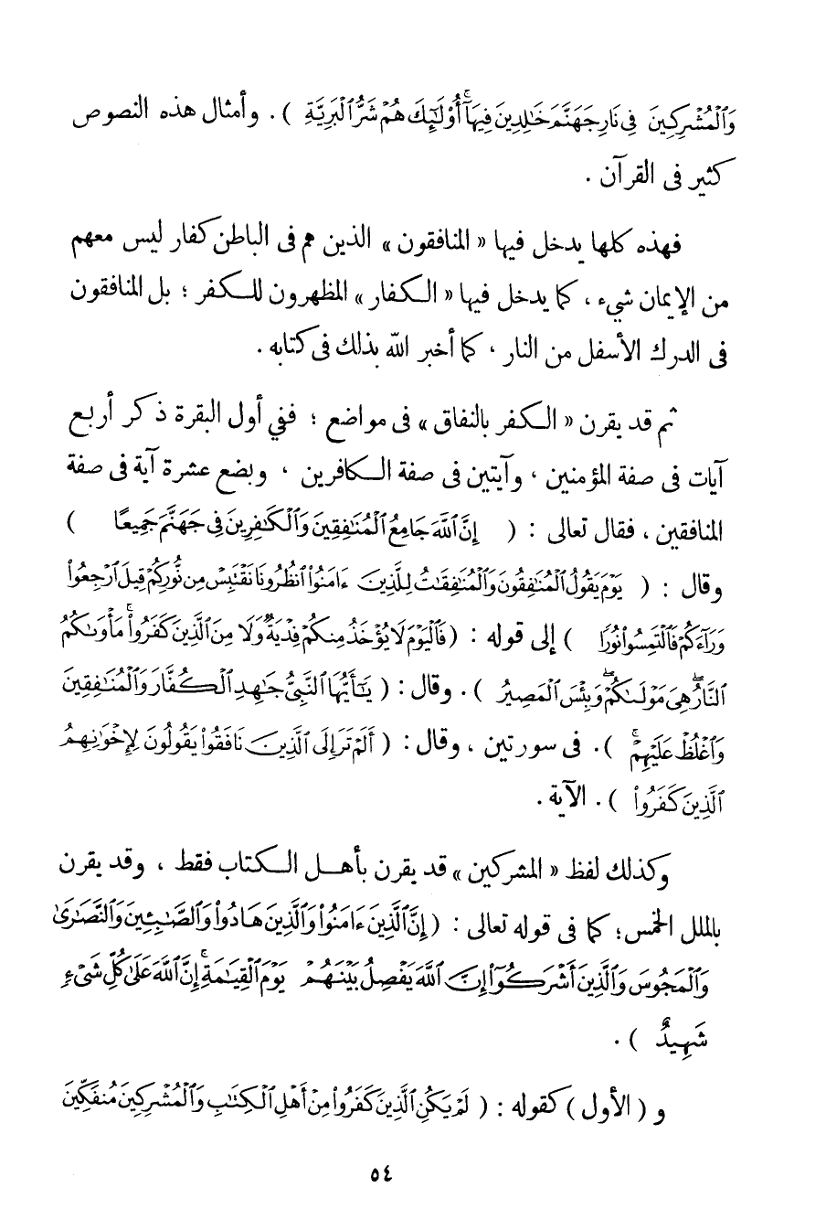 {إنَّ الَّذِينَ كَفَرُوا مِنْ أَهْلِ الْكِتَابِ وَالْمُشْرِكِينَ فِي نَارِ جَهَنَّمَ خَالِدِينَ فِيهَا أُولَئِكَ هُمْ شَرُّ الْبَرِيَّةِ} . وَأَمْثَالُ هَذِهِ النُّصُوصِ كَثِيرٌ فِي الْقُرْآنِ. فَهَذِهِ كُلُّهَا يَدْخُلُ فِيهَا " الْمُنَافِقُونَ " الَّذِينَ هُمْ فِي الْبَاطِنِ كُفَّارٌ لَيْسَ مَعَهُمْ مِنْ الْإِيمَانِ شَيْءٌ كَمَا يَدْخُلُ فِيهَا " الْكُفَّارُ " الْمُظْهِرُونَ لِلْكُفْرِ؛ بَلْ الْمُنَافِقُونَ فِي الدَّرْكِ الْأَسْفَلِ مِنْ النَّارِ كَمَا أَخْبَرَ اللَّهُ بِذَلِكَ فِي كِتَابِهِ. ثُمَّ قَدْ يُقْرَنُ " الْكُفْرُ بِالنِّفَاقِ " فِي مَوَاضِعَ؛ فَفِي أَوَّلِ الْبَقَرَةِ ذَكَرَ أَرْبَعَ آيَاتٍ فِي صِفَةِ الْمُؤْمِنِينَ وَآيَتَيْنِ فِي صِفَةِ الْكَافِرِينَ وَبِضْعَ عَشْرَةَ آيَةً فِي صِفَةِ الْمُنَافِقِينَ فَقَالَ تَعَالَى: {إنَّ اللَّهَ جَامِعُ الْمُنَافِقِينَ وَالْكَافِرِينَ فِي جَهَنَّمَ جَمِيعًا} وَقَالَ: {يَوْمَ يَقُولُ الْمُنَافِقُونَ وَالْمُنَافِقَاتُ لِلَّذِينَ آمَنُوا انْظُرُونَا نَقْتَبِسْ مِنْ نُورِكُمْ قِيلَ ارْجِعُوا وَرَاءَكُمْ فَالْتَمِسُوا نُورًا} إلَى قَوْلِهِ: {فَالْيَوْمَ لَا يُؤْخَذُ مِنْكُمْ فِدْيَةٌ وَلَا مِنَ الَّذِينَ كَفَرُوا مَأْوَاكُمُ النَّارُ هِيَ مَوْلَاكُمْ وَبِئْسَ الْمَصِيرُ} . وَقَالَ: {يَا أَيُّهَا النَّبِيُّ جَاهِدِ الْكُفَّارَ وَالْمُنَافِقِينَ وَاغْلُظْ عَلَيْهِمْ} . فِي سُورَتَيْنِ وَقَالَ: {أَلَمْ تَرَ إلَى الَّذِينَ نَافَقُوا يَقُولُونَ لِإِخْوَانِهِمُ الَّذِينَ كَفَرُوا} . الْآيَةَ. وَكَذَلِكَ لَفْظُ " الْمُشْرِكِينَ " قَدْ يُقْرَنُ بِأَهْلِ الْكِتَابِ فَقَطْ وَقَدْ يُقْرَنُ بِالْمِلَلِ الْخَمْسِ؛ كَمَا فِي قَوْله تَعَالَى {إنَّ الَّذِينَ آمَنُوا وَالَّذِينَ هَادُوا وَالصَّابِئِينَ وَالنَّصَارَى وَالْمَجُوسَ وَالَّذِينَ أَشْرَكُوا إنَّ اللَّهَ يَفْصِلُ بَيْنَهُمْ يَوْمَ الْقِيَامَةِ إنَّ اللَّهَ عَلَى كُلِّ شَيْءٍ شَهِيدٌ} . وَ (الْأَوَّلُ) كَقَوْلِهِ: {لَمْ يَكُنِ الَّذِينَ كَفَرُوا مِنْ أَهْلِ الْكِتَابِ وَالْمُشْرِكِينَ