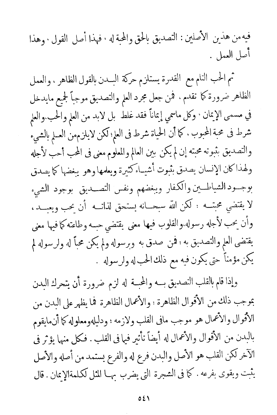 فِيهِ مِنْ هَذَيْنِ الْأَصْلَيْنِ: التَّصْدِيقِ بِالْحَقِّ وَالْمَحَبَّةِ لَهُ فَهَذَا أَصْلُ الْقَوْلِ وَهَذَا أَصْلُ الْعَمَلِ. ثُمَّ الْحُبُّ التَّامُّ مَعَ الْقُدْرَةِ يَسْتَلْزِمُ حَرَكَةَ الْبَدَنِ بِالْقَوْلِ الظَّاهِرِ، وَالْعَمَلُ الظَّاهِرُ ضَرُورَةٌ كَمَا تَقَدَّمَ فَمَنْ جَعَلَ مُجَرَّدَ الْعِلْمِ وَالتَّصْدِيقِ مُوجِبًا لِجَمِيعِ مَا يَدْخُلُ فِي مُسَمَّى الْإِيمَانِ وَكُلُّ مَا سُمِّيَ إيمَانًا فَقَدْ غَلِطَ بَلْ لَا بُدَّ مِنْ الْعِلْمِ وَالْحُبِّ وَالْعِلْمُ شَرْطٌ فِي مَحَبَّةِ الْمَحْبُوبِ كَمَا أَنَّ الْحَيَاةَ شَرْطٌ فِي الْعِلْمِ؛ لَكِنْ لَا يَلْزَمُ مِنْ الْعِلْمِ بِالشَّيْءِ وَالتَّصْدِيقِ بِثُبُوتِهِ مَحَبَّتُهُ إنْ لَمْ يَكُنْ بَيْنَ الْعَالِمِ وَالْمَعْلُومِ مَعْنًى فِي الْمُحِبِّ أَحَبَّ لِأَجْلِهِ وَلِهَذَا كَانَ الْإِنْسَانُ يُصَدِّقُ بِثُبُوتِ أَشْيَاءَ كَثِيرَةٍ وَيَعْلَمُهَا وَهُوَ يُبْغِضُهَا كَمَا يُصَدِّقُ بِوُجُودِ الشَّيَاطِينِ وَالْكُفَّارِ وَيُبْغِضُهُمْ وَنَفْسُ التَّصْدِيقِ بِوُجُودِ الشَّيْءِ لَا يَقْتَضِي مَحَبَّتَهُ؛ لَكِنَّ اللَّهَ سُبْحَانَهُ يَسْتَحِقُّ لِذَاتِهِ أَنْ يُحَبَّ وَيُعْبَدَ وَأَنْ يُحَبَّ لِأَجْلِهِ رَسُولُهُ، وَالْقُلُوبُ فِيهَا مَعْنًى يَقْتَضِي حُبَّهُ وَطَاعَتَهُ كَمَا فِيهَا مَعْنًى يَقْتَضِي الْعِلْمَ وَالتَّصْدِيقَ بِهِ؛ فَمَنْ صَدَّقَ بِهِ وَبِرَسُولِهِ وَلَمْ يَكُنْ مُحِبًّا لَهُ وَلِرَسُولِهِ لَمْ يَكُنْ مُؤْمِنًا حَتَّى يَكُونَ فِيهِ مَعَ ذَلِكَ الْحُبِّ لَهُ وَلِرَسُولِهِ. وَإِذَا قَامَ بِالْقَلْبِ التَّصْدِيقُ بِهِ وَالْمَحَبَّةُ لَهُ لَزِمَ ضَرُورَةَ أَنْ يَتَحَرَّكَ الْبَدَنُ بِمُوجِبِ ذَلِكَ مِنْ الْأَقْوَالِ الظَّاهِرَةِ؛ وَالْأَعْمَالِ الظَّاهِرَةِ فَمَا يَظْهَرُ عَلَى الْبَدَنِ مِنْ الْأَقْوَالِ وَالْأَعْمَالِ هُوَ مُوجَبُ مَا فِي الْقَلْبِ وَلَازِمُهُ؛ وَدَلِيلُهُ وَمَعْلُولُهُ كَمَا أَنَّ مَا يَقُومُ بِالْبَدَنِ مِنْ الْأَقْوَالِ وَالْأَعْمَالِ لَهُ أَيْضًا تَأْثِيرٌ فِيمَا فِي الْقَلْبِ. فَكُلٌّ مِنْهُمَا يُؤَثِّرُ فِي الْآخَرِ لَكِنَّ الْقَلْبَ هُوَ الْأَصْلُ، وَالْبَدَنَ فَرْعٌ لَهُ وَالْفَرْعُ يُسْتَمَدُّ مِنْ أَصْلِهِ، وَالْأَصْلُ يَثْبُتُ وَيَقْوَى بِفَرْعِهِ. كَمَا فِي الشَّجَرَةِ الَّتِي يُضْرَبُ بِهَا الْمَثَلُ لِكَلِمَةِ الْإِيمَانِ، قَالَ
