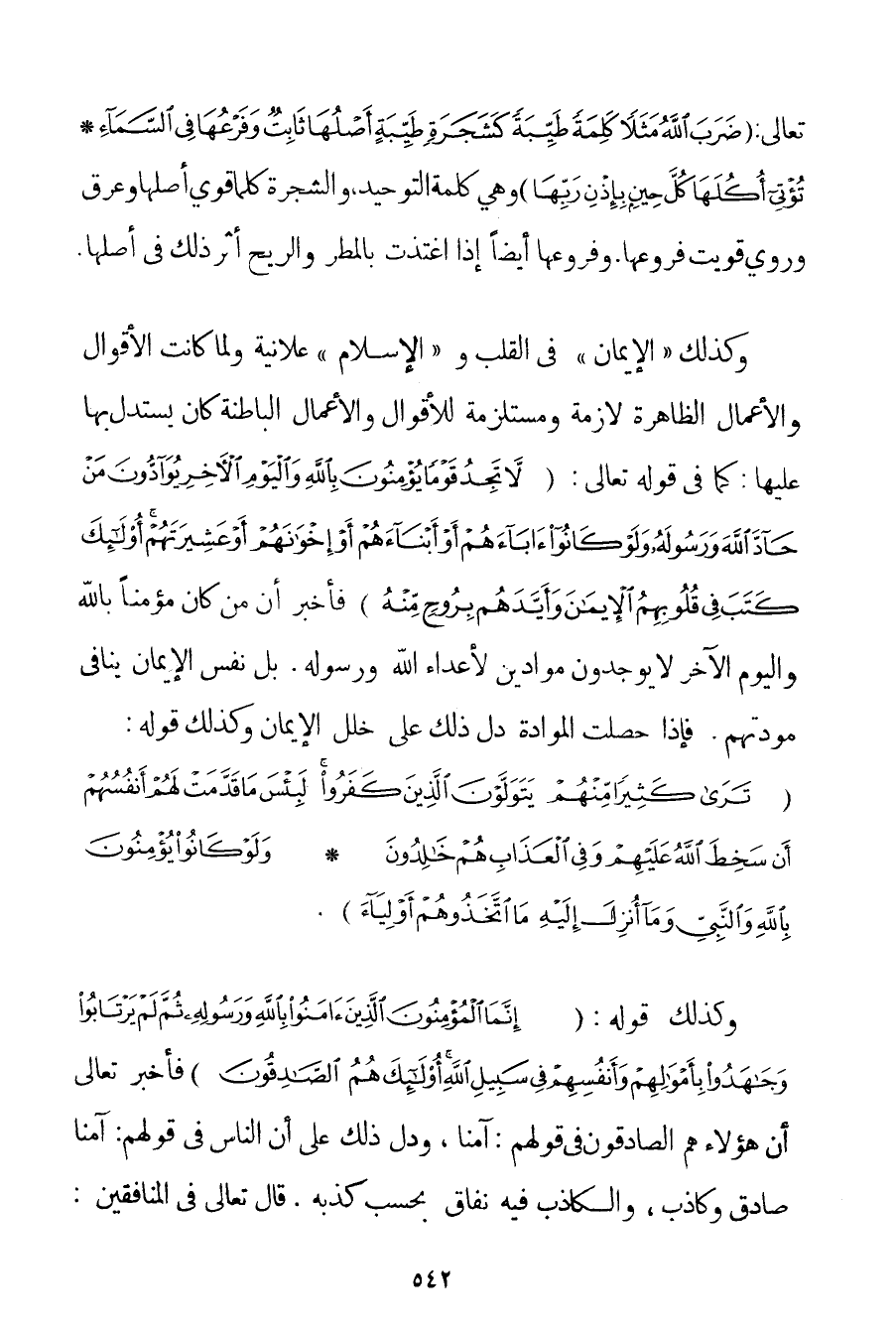 تَعَالَى: {ضَرَبَ اللَّهُ مَثَلًا كَلِمَةً طَيِّبَةً كَشَجَرَةٍ طَيِّبَةٍ أَصْلُهَا ثَابِتٌ وَفَرْعُهَا فِي السَّمَاءِ تُؤْتِي أُكُلَهَا كُلَّ حِينٍ بِإِذْنِ رَبِّهَا} وَهِيَ كَلِمَةُ التَّوْحِيدِ وَالشَّجَرَةُ كُلَّمَا قَوِيَ أَصْلُهَا وَعَرِقَ وَرُوِيَ قَوِيَتْ فَرْعُهَا. وَفُرُوعُهَا أَيْضًا إذَا اغْتَذَتْ بِالْمَطَرِ وَالرِّيحِ أَثَّرَ ذَلِكَ فِي أَصْلِهَا. وَكَذَلِكَ " الْإِيمَانُ " فِي الْقَلْبِ وَ " الْإِسْلَامِ " عَلَانِيَةً وَلَمَّا كَانَتْ الْأَقْوَالُ وَالْأَعْمَالُ الظَّاهِرَةُ لَازِمَةً وَمُسْتَلْزَمَةً لِلْأَقْوَالِ وَالْأَعْمَالِ الْبَاطِنَةِ كَانَ يُسْتَدَلُّ بِهَا عَلَيْهَا: كَمَا فِي قَوْله تَعَالَى {لَا تَجِدُ قَوْمًا يُؤْمِنُونَ بِاللَّهِ وَالْيَوْمِ الْآخِرِ يُوَادُّونَ مَنْ حَادَّ اللَّهَ وَرَسُولَهُ وَلَوْ كَانُوا آبَاءَهُمْ أَوْ أَبْنَاءَهُمْ أَوْ إخْوَانَهُمْ أَوْ عَشِيرَتَهُمْ أُولَئِكَ كَتَبَ فِي قُلُوبِهِمُ الْإِيمَانَ وَأَيَّدَهُمْ بِرُوحٍ مِنْهُ} فَأَخْبَرَ أَنَّ مَنْ كَانَ مُؤْمِنًا بِاَللَّهِ وَالْيَوْمِ الْآخِرِ لَا يُوجَدُونَ مُوَادِّينَ لِأَعْدَاءِ اللَّهِ وَرَسُولِهِ. بَلْ نَفْسُ الْإِيمَانِ يُنَافِي مَوَدَّتَهُمْ. فَإِذَا حَصَلَتْ الْمُوَادَّةُ دَلَّ ذَلِكَ عَلَى خَلَلِ الْإِيمَانِ وَكَذَلِكَ قَوْلُهُ: {تَرَى كَثِيرًا مِنْهُمْ يَتَوَلَّوْنَ الَّذِينَ كَفَرُوا لَبِئْسَ مَا قَدَّمَتْ لَهُمْ أَنْفُسُهُمْ أَنْ سَخِطَ اللَّهُ عَلَيْهِمْ وَفِي الْعَذَابِ هُمْ خَالِدُونَ} {وَلَوْ كَانُوا يُؤْمِنُونَ بِاللَّهِ وَالنَّبِيِّ وَمَا أُنْزِلَ إلَيْهِ مَا اتَّخَذُوهُمْ أَوْلِيَاءَ} . وَكَذَلِكَ قَوْلُهُ: {إنَّمَا الْمُؤْمِنُونَ الَّذِينَ آمَنُوا بِاللَّهِ وَرَسُولِهِ ثُمَّ لَمْ يَرْتَابُوا وَجَاهَدُوا بِأَمْوَالِهِمْ وَأَنْفُسِهِمْ فِي سَبِيلِ اللَّهِ أُولَئِكَ هُمُ الصَّادِقُونَ} فَأَخْبَرَ تَعَالَى أَنَّ هَؤُلَاءِ هُمْ الصَّادِقُونَ فِي قَوْلِهِمْ: آمَنَّا وَدَلَّ ذَلِكَ عَلَى أَنَّ النَّاسَ فِي قَوْلِهِمْ: آمَنَّا صَادِقٌ وَكَاذِبٌ وَالْكَاذِبُ فِيهِ نِفَاقٌ بِحَسَبِ كَذِبِهِ. قَالَ تَعَالَى فِي الْمُنَافِقِينَ: