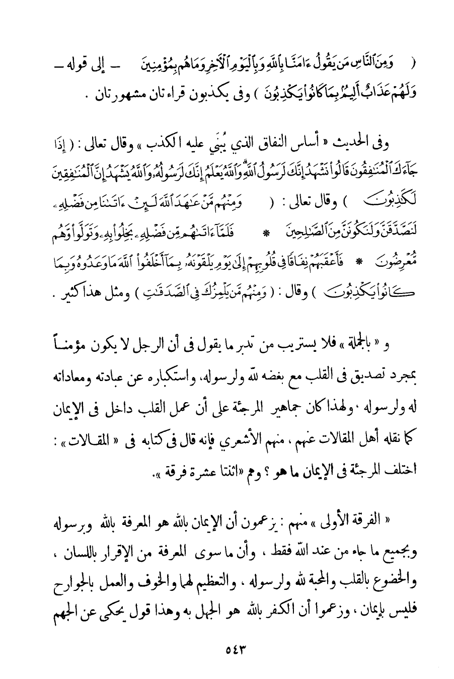 وَ " بِالْجُمْلَةِ " فَلَا يَسْتَرِيبُ مَنْ تَدَبَّرَ مَا يَقُولُ فِي أَنَّ الرَّجُلَ لَا يَكُونُ مُؤْمِنًا بِمُجَرَّدِ تَصْدِيقٍ فِي الْقَلْبِ مَعَ بُغْضِهِ لِلَّهِ وَلِرَسُولِهِ وَاسْتِكْبَارِهِ عَنْ عِبَادَتِهِ وَمُعَادَاته لَهُ وَلِرَسُولِهِ وَلِهَذَا كَانَ جَمَاهِيرُ الْمُرْجِئَةِ عَلَى أَنَّ عَمَلَ الْقَلْبِ دَاخِلٌ فِي الْإِيمَانِ كَمَا نَقَلَهُ أَهْلُ الْمَقَالَاتِ عَنْهُمْ مِنْهُمْ الْأَشْعَرِيُّ فَإِنَّهُ قَالَ فِي كِتَابِهِ فِي " الْمَقَالَاتِ ": اخْتَلَفَ الْمُرْجِئَةُ فِي الْإِيمَانِ مَا هُوَ؟ وَهُمْ " اثْنَتَا عَشْرَةَ فِرْقَةً ". " الْفِرْقَةُ الْأُولَى " مِنْهُمْ: يَزْعُمُونَ أَنَّ الْإِيمَانَ بِاَللَّهِ هُوَ الْمَعْرِفَةُ بِاَللَّهِ وَبِرَسُولِهِ وَبِجَمِيعِ مَا جَاءَ مِنْ عِنْدِ اللَّهِ فَقَطْ وَأَنَّ مَا سِوَى الْمَعْرِفَةِ مِنْ الْإِقْرَارِ بِاللِّسَانِ وَالْخُضُوعِ بِالْقَلْبِ وَالْمَحَبَّةِ لِلَّهِ وَلِرَسُولِهِ وَالتَّعْظِيمِ لَهُمَا وَالْخَوْفِ وَالْعَمَلِ بِالْجَوَارِحِ فَلَيْسَ بِإِيمَانِ وَزَعَمُوا أَنَّ الْكُفْرَ بِاَللَّهِ هُوَ الْجَهْلُ بِهِ وَهَذَا قَوْلٌ يُحْكَى عَنْ الْجَهْمِ