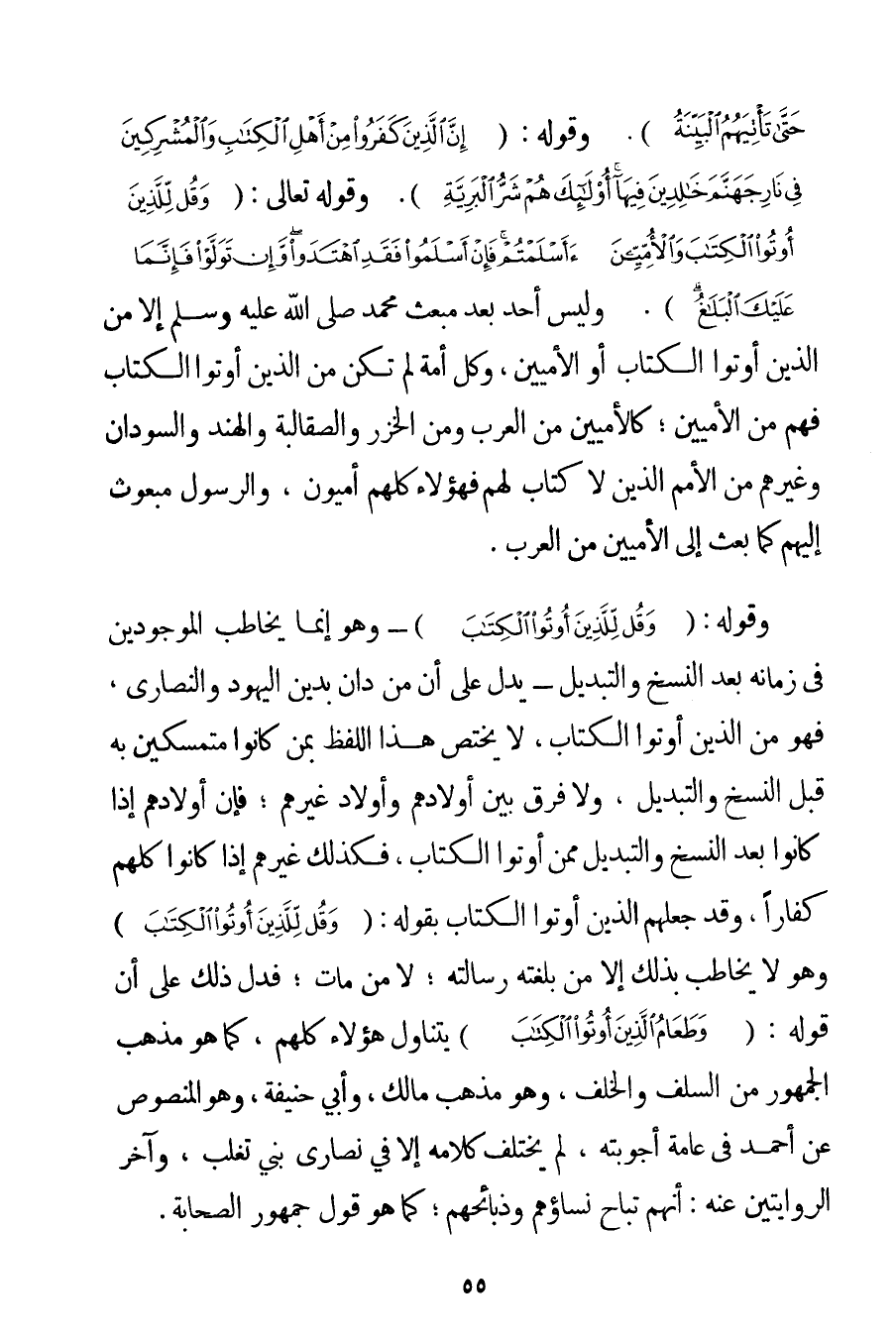 مُنْفَكِّينَ حَتَّى تَأْتِيَهُمُ الْبَيِّنَةُ} . وَقَوْلِهِ: {إنَّ الَّذِينَ كَفَرُوا مِنْ أَهْلِ الْكِتَابِ وَالْمُشْرِكِينَ فِي نَارِ جَهَنَّمَ خَالِدِينَ فِيهَا أُولَئِكَ هُمْ شَرُّ الْبَرِيَّةِ} . وقَوْله تَعَالَى {وَقُلْ لِلَّذِينَ أُوتُوا الْكِتَابَ وَالْأُمِّيِّينَ أَأَسْلَمْتُمْ فَإِنْ أَسْلَمُوا فَقَدِ اهْتَدَوْا وَإِنْ تَوَلَّوْا فَإِنَّمَا عَلَيْكَ الْبَلَاغُ} . وَلَيْسَ أَحَدٌ بَعْدَ مَبْعَثِ مُحَمَّدٍ صَلَّى اللَّهُ عَلَيْهِ وَسَلَّمَ إلَّا مِنْ الَّذِينَ أُوتُوا الْكِتَابَ أَوْ الْأُمِّيِّينَ، وَكُلُّ أُمَّةٍ لَمْ تَكُنْ مِنْ الَّذِينَ أُوتُوا الْكِتَابَ فَهُمْ مِنْ الْأُمِّيِّينَ؛ كَالْأُمِّيِّينَ مِنْ الْعَرَبِ وَمِنْ الْخَزَرِ وَالصَّقَالِبَةِ وَالْهِنْدِ وَالسُّودَانِ وَغَيْرِهِمْ مِنْ الْأُمَمِ الَّذِينَ لَا كِتَابَ لَهُمْ فَهَؤُلَاءِ كُلُّهُمْ أُمِّيُّونَ، وَالرَّسُولُ مَبْعُوثٌ إلَيْهِمْ كَمَا بُعِثَ إلَى الْأُمِّيِّينَ مِنْ الْعَرَبِ. وَقَوْلُهُ: {وَقُلْ لِلَّذِينَ أُوتُوا الْكِتَابَ} - وَهُوَ إنَّمَا يُخَاطِبُ الْمَوْجُودِينَ فِي زَمَانِهِ بَعْدَ النَّسْخِ وَالتَّبْدِيلِ - يَدُلُّ عَلَى أَنَّ مَنْ دَانَ بِدِينِ الْيَهُودِ وَالنَّصَارَى فَهُوَ مِنْ الَّذِينَ أُوتُوا الْكِتَابَ لَا يَخْتَصُّ هَذَا اللَّفْظُ بِمَنْ كَانُوا مُتَمَسِّكِينَ بِهِ قَبْلَ النَّسْخِ وَالتَّبْدِيلِ وَلَا فَرْقَ بَيْنَ أَوْلَادِهِمْ وَأَوْلَادِ غَيْرِهِمْ؛ فَإِنَّ أَوْلَادَهُمْ إذَا كَانُوا بَعْدَ النَّسْخِ وَالتَّبْدِيلِ مِمَّنْ أُوتُوا الْكِتَابَ فَكَذَلِكَ غَيْرُهُمْ إذَا كَانُوا كُلُّهُمْ كُفَّارًا وَقَدْ جَعَلَهُمْ الَّذِينَ أُوتُوا الْكِتَابَ بِقَوْلِهِ: {وَقُلْ لِلَّذِينَ أُوتُوا الْكِتَابَ} وَهُوَ لَا يُخَاطِبُ بِذَلِكَ إلَّا مَنْ بَلَغَتْهُ رِسَالَتُهُ؛ لَا مَنْ مَاتَ؛ فَدَلَّ ذَلِكَ عَلَى أَنَّ قَوْلَهُ: {وَطَعَامُ الَّذِينَ أُوتُوا الْكِتَابَ} يَتَنَاوَلُ هَؤُلَاءِ كُلَّهُمْ كَمَا هُوَ مَذْهَبُ الْجُمْهُورِ مِنْ السَّلَفِ وَالْخَلَفِ وَهُوَ مَذْهَبُ مَالِكٍ وَأَبِي حَنِيفَةَ وَهُوَ الْمَنْصُوصُ عَنْ أَحْمَد فِي عَامَّةِ أَجْوِبَتِهِ لَمْ يَخْتَلِفْ كَلَامُهُ إلَّا فِي نَصَارَى بَنِي تَغْلِبَ، وَآخِرُ الرِّوَايَتَيْنِ عَنْهُ: أَنَّهُمْ تُبَاحُ نِسَاؤُهُمْ وَذَبَائِحُهُمْ؛ كَمَا هُوَ قَوْلُ جُمْهُورِ الصَّحَابَةِ.