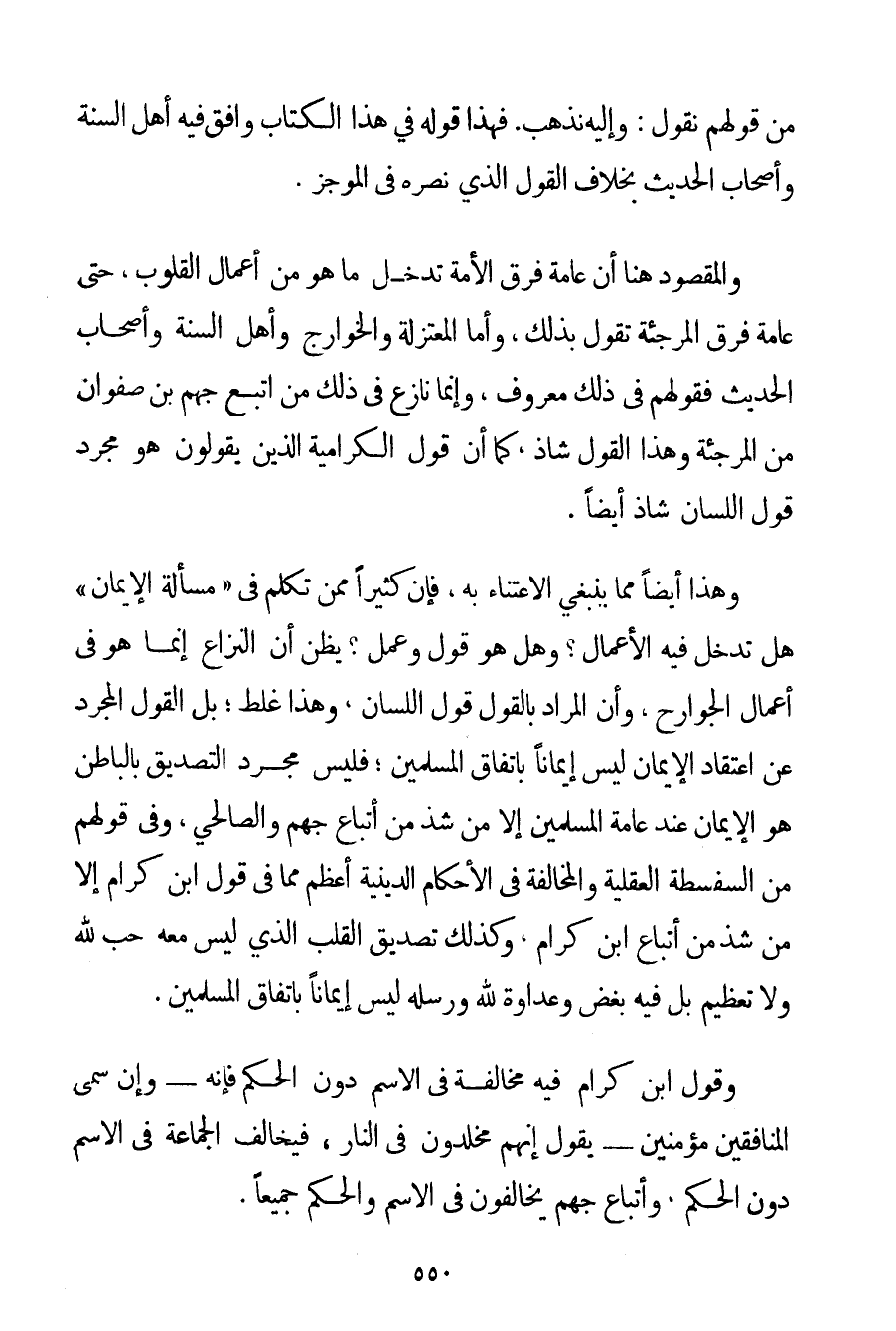 مِنْ قَوْلِهِمْ نَقُولُ: وَإِلَيْهِ نَذْهَبُ. فَهَذَا قَوْلُهُ فِي هَذَا الْكِتَابِ وَافَقَ فِيهِ أَهْلَ السُّنَّةِ وَأَصْحَابَ الْحَدِيثِ بِخِلَافِ الْقَوْلِ الَّذِي نَصَرَهُ فِي الْمُوجَزِ. وَالْمَقْصُودُ هُنَا أَنَّ عَامَّةَ فِرَقِ الْأُمَّةِ تُدْخِلُ مَا هُوَ مِنْ أَعْمَالِ الْقُلُوبِ حَتَّى عَامَّةِ فِرَقِ الْمُرْجِئَةِ تَقُولُ بِذَلِكَ وَأَمَّا الْمُعْتَزِلَةُ وَالْخَوَارِجُ وَأَهْلُ السُّنَّةِ وَأَصْحَابُ الْحَدِيثِ فَقَوْلُهُمْ فِي ذَلِكَ مَعْرُوفٌ وَإِنَّمَا نَازَعَ فِي ذَلِكَ مَنْ اتَّبَعَ جَهْمَ بْنَ صَفْوَانَ مِنْ الْمُرْجِئَةِ وَهَذَا الْقَوْلُ شَاذٌّ كَمَا أَنَّ قَوْلَ الكَرَّامِيَة الَّذِينَ يَقُولُونَ هُوَ مُجَرَّدُ قَوْلِ اللِّسَانِ شَاذٌّ أَيْضًا. وَهَذَا أَيْضًا مِمَّا يَنْبَغِي الِاعْتِنَاءُ بِهِ فَإِنَّ كَثِيرًا مِمَّنْ تَكَلَّمَ فِي " مَسْأَلَةِ الْإِيمَانِ " هَلْ تَدْخُلُ فِيهِ الْأَعْمَالُ؟ وَهَلْ هُوَ قَوْلٌ وَعَمَلٌ؟ يَظُنُّ أَنَّ النِّزَاعَ إنَّمَا هُوَ فِي أَعْمَالِ الْجَوَارِحِ وَأَنَّ الْمُرَادَ بِالْقَوْلِ قَوْلُ اللِّسَانِ وَهَذَا غَلَطٌ؛ بَلْ الْقَوْلُ الْمُجَرَّدُ عَنْ اعْتِقَادِ الْإِيمَانِ لَيْسَ إيمَانًا بِاتِّفَاقِ الْمُسْلِمِينَ؛ فَلَيْسَ مُجَرَّدُ التَّصْدِيقِ بِالْبَاطِنِ هُوَ الْإِيمَانَ عِنْدَ عَامَّةِ الْمُسْلِمِينَ إلَّا مَنْ شَذَّ مِنْ أَتْبَاعِ جَهْمٍ والصالحي وَفِي قَوْلِهِمْ مِنْ السَّفْسَطَةِ الْعَقْلِيَّةِ وَالْمُخَالَفَةِ فِي الْأَحْكَامِ الدِّينِيَّةِ أَعْظَمُ مِمَّا فِي قَوْلِ ابْنِ كَرَّامٍ إلَّا مَنْ شَذَّ مِنْ أَتْبَاعِ ابْنِ كَرَّامٍ وَكَذَلِكَ تَصْدِيقُ الْقَلْبِ الَّذِي لَيْسَ مَعَهُ حُبٌّ لِلَّهِ وَلَا تَعْظِيمٌ بَلْ فِيهِ بُغْضٌ وَعَدَاوَةٌ لِلَّهِ وَرُسُلِهِ لَيْسَ إيمَانًا بِاتِّفَاقِ الْمُسْلِمِينَ. وَقَوْلُ ابْنِ كَرَّامٍ فِيهِ مُخَالَفَةٌ فِي الِاسْمِ دُونَ الْحُكْمِ فَإِنَّهُ - وَإِنْ سَمَّى الْمُنَافِقِينَ مُؤْمِنِينَ - يَقُولُ إنَّهُمْ مُخَلَّدُونَ فِي النَّارِ فَيُخَالِفُ الْجَمَاعَةَ فِي الِاسْمِ دُونَ الْحُكْمِ وَأَتْبَاعُ جَهْمٍ يُخَالِفُونَ فِي الِاسْمِ وَالْحُكْمِ جَمِيعًا.