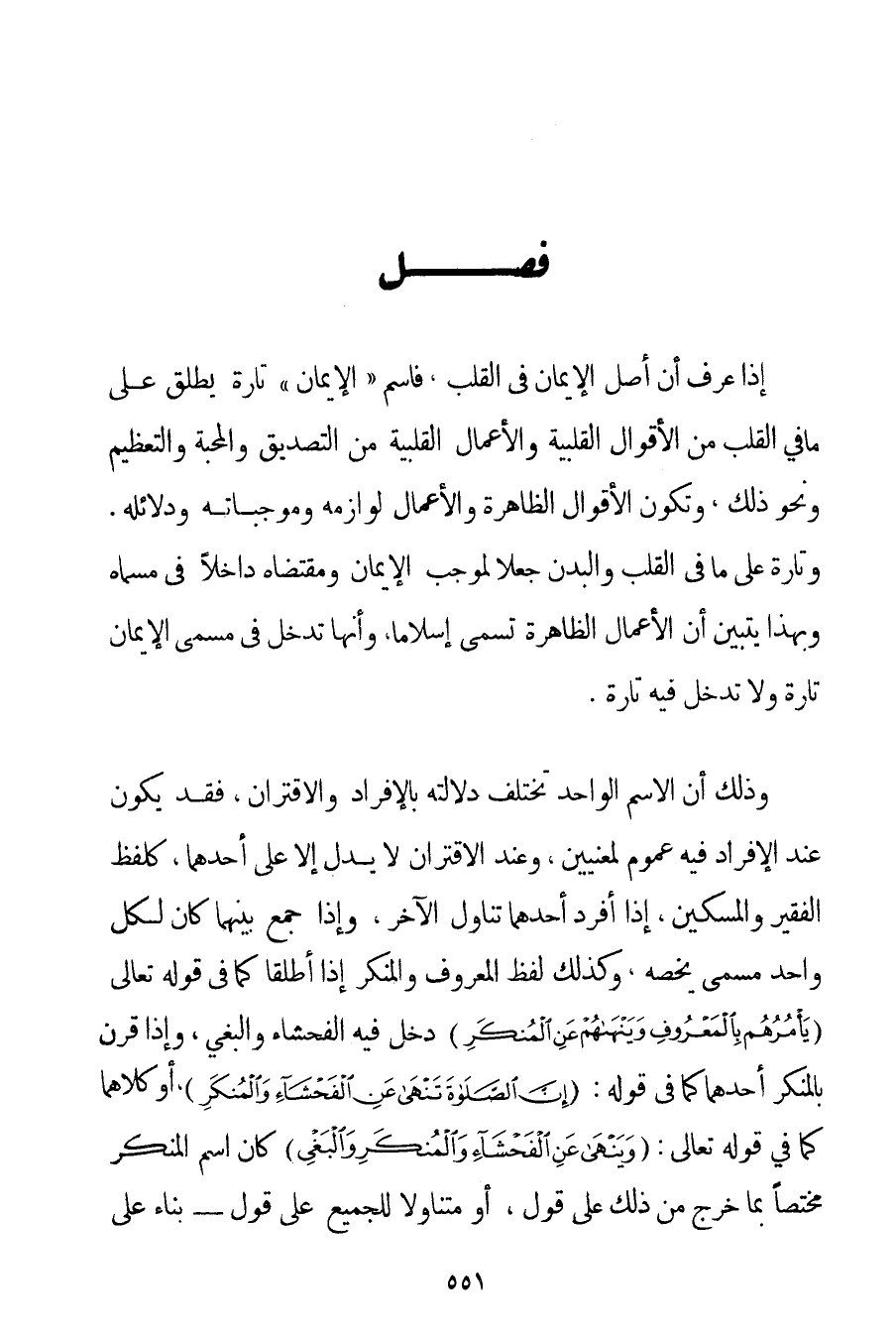 وَذَلِكَ أَنَّ الِاسْمَ الْوَاحِدَ تَخْتَلِفُ دَلَالَتُهُ بِالْإِفْرَادِ وَالِاقْتِرَانِ فَقَدْ يَكُونُ عِنْدَ الْإِفْرَادِ فِيهِ عُمُومٌ لِمَعْنَيَيْنِ وَعِنْدَ الِاقْتِرَانِ لَا يَدُلُّ إلَّا عَلَى أَحَدِهِمَا كَلَفْظِ الْفَقِيرِ وَالْمِسْكِينِ إذَا أُفْرِدَ أَحَدُهُمَا تَنَاوَلَ الْآخَرَ وَإِذَا جَمَعَ بَيْنَهُمَا كَانَ لِكُلِّ وَاحِدٍ مُسَمًّى يَخُصُّهُ وَكَذَلِكَ لَفْظُ الْمَعْرُوفِ وَالْمُنْكَرِ إذَا أُطْلِقَا كَمَا فِي قَوْله تَعَالَى {يَأْمُرُهُمْ بِالْمَعْرُوفِ وَيَنْهَاهُمْ عَنِ الْمُنْكَرِ} دَخَلَ فِيهِ الْفَحْشَاءُ وَالْبَغْيُ وَإِذَا قَرَنَ بِالْمُنْكَرِ أَحَدَهُمَا كَمَا فِي قَوْلِهِ: {إنَّ الصَّلَاةَ تَنْهَى عَنِ الْفَحْشَاءِ وَالْمُنْكَرِ} أَوْ كِلَاهُمَا كَمَا فِي قَوْله تَعَالَى {وَيَنْهَى عَنِ الْفَحْشَاءِ وَالْمُنْكَرِ وَالْبَغْيِ} كَانَ اسْمُ الْمُنْكَرِ مُخْتَصًّا بِمَا خَرَجَ مِنْ ذَلِكَ عَلَى قَوْلٍ أَوْ مُتَنَاوِلًا لِلْجَمِيعِ عَلَى قَوْلٍ - بِنَاءً عَلَى