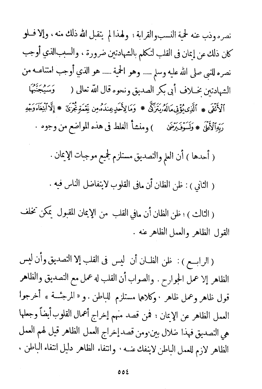 نَصَرَهُ وَذَبَّ عَنْهُ لِحَمِيَّةِ النَّسَبِ وَالْقَرَابَةِ؛ وَلِهَذَا لَمْ يَتَقَبَّلْ اللَّهُ ذَلِكَ مِنْهُ وَإِلَّا فَلَوْ كَانَ ذَلِكَ عَنْ إيمَانٍ فِي الْقَلْبِ لَتَكَلَّمَ بِالشَّهَادَتَيْنِ ضَرُورَةً وَالسَّبَبُ الَّذِي أَوْجَبَ نَصْرَهُ لِلنَّبِيِّ صَلَّى اللَّهُ عَلَيْهِ وَسَلَّمَ - وَهُوَ الْحَمِيَّةُ - هُوَ الَّذِي أَوْجَبَ امْتِنَاعَهُ مِنْ الشَّهَادَتَيْنِ بِخِلَافِ أَبِي بَكْرٍ الصِّدِّيقِ وَنَحْوِهِ قَالَ اللَّهُ تَعَالَى {وَسَيُجَنَّبُهَا الْأَتْقَى} {الَّذِي يُؤْتِي مَالَهُ يَتَزَكَّى} {وَمَا لِأَحَدٍ عِنْدَهُ مِنْ نِعْمَةٍ تُجْزَى} {إلَّا ابْتِغَاءَ وَجْهِ رَبِّهِ الْأَعْلَى} {وَلَسَوْفَ يَرْضَى} وَمَنْشَأُ الْغَلَطِ فِي هَذِهِ الْمَوَاضِعِ مِنْ وُجُوهٍ. (أَحَدُهَا) أَنَّ الْعِلْمَ وَالتَّصْدِيقَ مُسْتَلْزِمٌ لِجَمِيعِ مُوجِبَاتِ الْإِيمَانِ. (الثَّانِي) : ظَنَّ الظَّانُّ أَنَّ مَا فِي الْقُلُوبِ لَا يَتَفَاضَلُ النَّاسُ فِيهِ. (الثَّالِثُ) ظَنَّ الظَّانُّ أَنَّ مَا فِي الْقَلْبِ مِنْ الْإِيمَانِ الْمَقْبُولِ يُمْكِنُ تَخَلُّفُ الْقَوْلِ الظَّاهِرِ وَالْعَمَلِ الظَّاهِرِ عَنْهُ. (الرَّابِعُ) : ظَنَّ الظَّانُّ أَنْ لَيْسَ فِي الْقَلْبِ إلَّا التَّصْدِيقُ وَأَنْ لَيْسَ الظَّاهِرُ إلَّا عَمَلُ الْجَوَارِحِ. وَالصَّوَابُ أَنَّ الْقَلْبَ لَهُ عَمَلٌ مَعَ التَّصْدِيقِ وَالظَّاهِرُ قَوْلٌ ظَاهِرٌ وَعَمَلٌ ظَاهِرٌ وَكِلَاهُمَا مُسْتَلْزِمٌ لِلْبَاطِنِ.