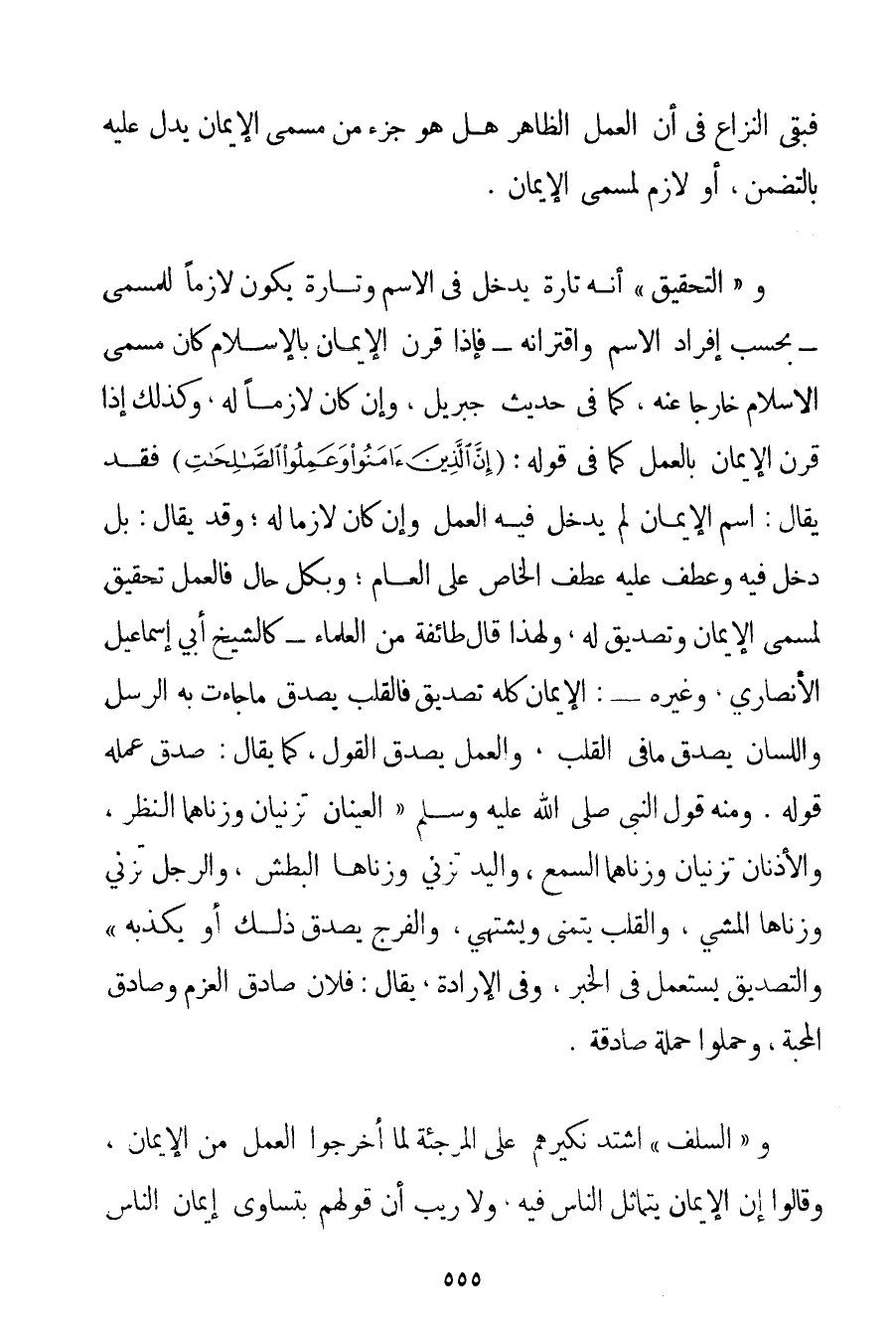 فَبَقِيَ النِّزَاعُ فِي أَنَّ الْعَمَلَ الظَّاهِرَ هَلْ هُوَ جُزْءٌ مِنْ مُسَمَّى الْإِيمَانِ يَدُلُّ عَلَيْهِ بِالتَّضَمُّنِ أَوْ لَازِمٌ لِمُسَمَّى الْإِيمَانِ. وَ " التَّحْقِيقُ " أَنَّهُ تَارَةً يَدْخُلُ فِي الِاسْمِ وَتَارَةً يَكُونُ لَازِمًا لِلْمُسَمَّى - بِحَسَبِ إفْرَادِ الِاسْمِ وَاقْتِرَانِهِ - فَإِذَا قُرِنَ الْإِيمَانُ بِالْإِسْلَامِ كَانَ مُسَمَّى الْإِسْلَامِ خَارِجًا عَنْهُ كَمَا فِي حَدِيثِ جِبْرِيلَ وَإِنْ كَانَ لَازِمًا لَهُ وَكَذَلِكَ إذَا قُرِنَ الْإِيمَانُ بِالْعَمَلِ كَمَا فِي قَوْلِهِ: {إنَّ الَّذِينَ آمَنُوا وَعَمِلُوا الصَّالِحَاتِ} فَقَدْ يُقَالُ: اسْمُ الْإِيمَانِ لَمْ يَدْخُلْ فِيهِ الْعَمَلُ وَإِنْ كَانَ لَازِمًا لَهُ؛ وَقَدْ يُقَالُ: بَلْ دَخَلَ فِيهِ وَعُطِفَ عَلَيْهِ عَطْفَ الْخَاصِّ عَلَى الْعَامِّ؛ وَبِكُلِّ حَالٍ فَالْعَمَلُ تَحْقِيقٌ لِمُسَمَّى الْإِيمَانِ وَتَصْدِيقٌ لَهُ وَلِهَذَا قَالَ طَائِفَةٌ مِنْ الْعُلَمَاءِ - كَالشَّيْخِ أَبِي إسْمَاعِيلَ الْأَنْصَارِيِّ؟ وَغَيْرِهِ -: الْإِيمَانُ كُلُّهُ تَصْدِيقٌ فَالْقَلْبُ يُصَدِّقُ مَا جَاءَتْ بِهِ الرُّسُلُ، وَاللِّسَانُ يُصَدِّقُ مَا فِي الْقَلْبِ، وَالْعَمَلُ يُصَدِّقُ الْقَوْلَ كَمَا يُقَالُ: صَدَّقَ عَمَلُهُ قَوْلَهُ. وَمِنْهُ قَوْلُ النَّبِيِّ صَلَّى اللَّهُ عَلَيْهِ وَسَلَّمَ {الْعَيْنَانِ تَزْنِيَانِ وَزِنَاهُمَا النَّظَرُ وَالْأُذُنَانِ تَزْنِيَانِ وَزِنَاهُمَا السَّمْعُ وَالْيَدُ تَزْنِي وَزِنَاهَا الْبَطْشُ وَالرِّجْلُ تَزْنِي وَزِنَاهَا الْمَشْيُ وَالْقَلْبُ يَتَمَنَّى وَيَشْتَهِي وَالْفَرْجُ يُصَدِّقُ ذَلِكَ أَوْ يُكَذِّبُهُ} وَالتَّصْدِيقُ يُسْتَعْمَلُ فِي الْخَبَرِ وَفِي الْإِرَادَةِ يُقَالُ: فُلَانٌ صَادِقُ الْعَزْمِ وَصَادِقُ الْمَحَبَّةِ وَحَمَلُوا حَمْلَةً صَادِقَةً.