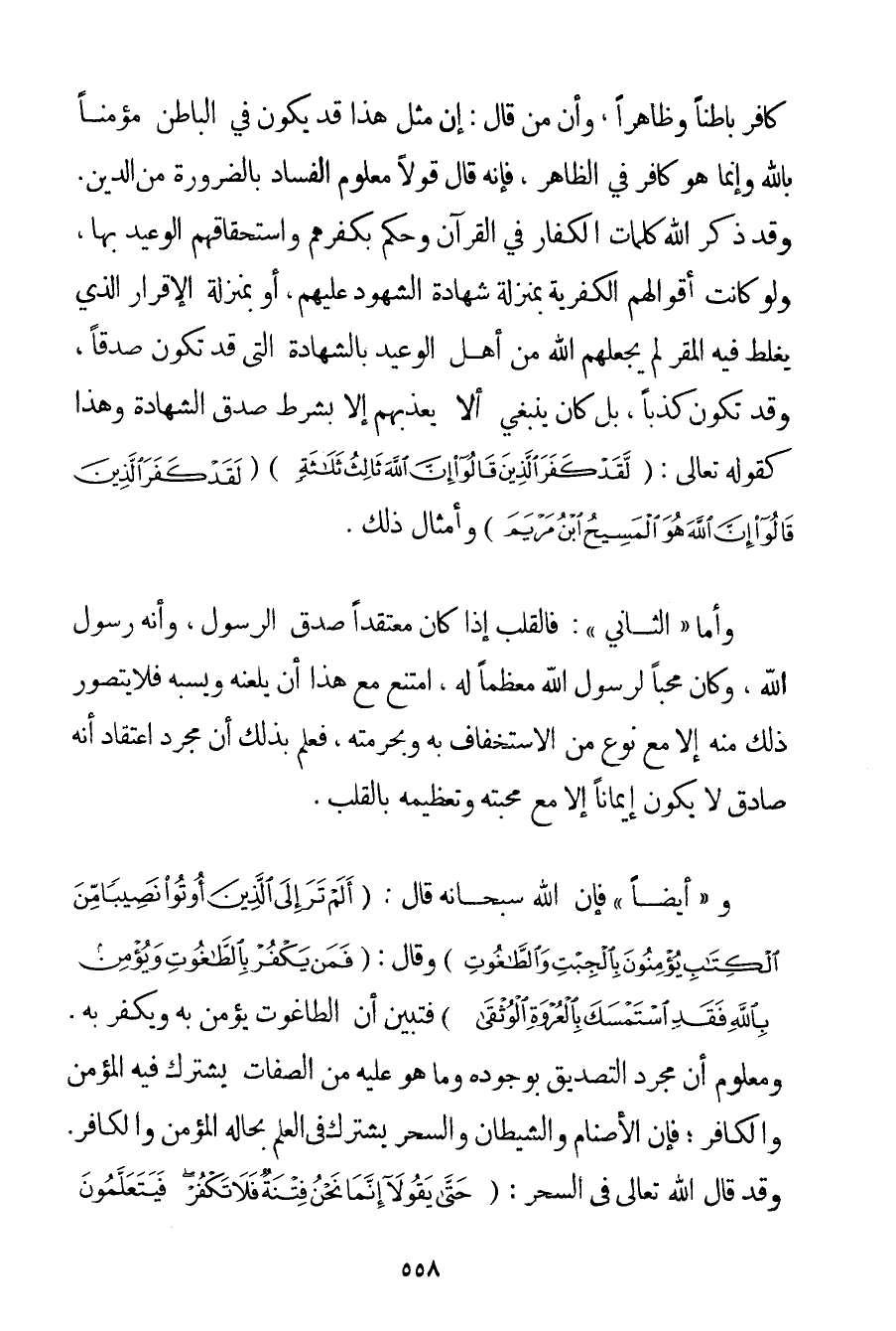 كَافِرٌ بَاطِنًا وَظَاهِرًا وَأَنَّ مَنْ قَالَ: إنَّ مِثْلَ هَذَا قَدْ يَكُونُ فِي الْبَاطِنِ مُؤْمِنًا بِاَللَّهِ وَإِنَّمَا هُوَ كَافِرٌ فِي الظَّاهِرِ فَإِنَّهُ قَالَ قَوْلًا مَعْلُومَ الْفَسَادِ بِالضَّرُورَةِ مِنْ الدِّينِ. وَقَدْ ذَكَرَ اللَّهُ كَلِمَاتِ الْكُفَّارِ فِي الْقُرْآنِ وَحَكَمَ بِكُفْرِهِمْ وَاسْتِحْقَاقِهِمْ الْوَعِيدَ بِهَا وَلَوْ كَانَتْ أَقْوَالُهُمْ الكفرية بِمَنْزِلَةِ شَهَادَةِ الشُّهُودِ عَلَيْهِمْ أَوْ بِمَنْزِلَةِ الْإِقْرَارِ الَّذِي يَغْلَطُ فِيهِ الْمُقِرُّ لَمْ يَجْعَلْهُمْ اللَّهُ مِنْ أَهْلِ الْوَعِيدِ بِالشَّهَادَةِ الَّتِي قَدْ تَكُونُ صِدْقًا وَقَدْ تَكُونُ كَذِبًا بَلْ كَانَ يَنْبَغِي أَنْ لَا يُعَذِّبَهُمْ إلَّا بِشَرْطِ صِدْقِ الشَّهَادَةِ وَهَذَا كَقَوْلِهِ تَعَالَى: {لَقَدْ كَفَرَ الَّذِينَ قَالُوا إنَّ اللَّهَ ثَالِثُ ثَلَاثَةٍ} {لَقَدْ كَفَرَ الَّذِينَ قَالُوا إنَّ اللَّهَ هُوَ الْمَسِيحُ ابْنُ مَرْيَمَ} وَأَمْثَالُ ذَلِكَ. وَأَمَّا " الثَّانِي ": فَالْقَلْبُ إذَا كَانَ مُعْتَقِدًا صِدْقَ الرَّسُولِ وَأَنَّهُ رَسُولُ اللَّهِ وَكَانَ مُحِبًّا لِرَسُولِ اللَّهِ مُعَظِّمًا لَهُ امْتَنَعَ مَعَ هَذَا أَنْ يَلْعَنَهُ وَيَسُبَّهُ فَلَا يُتَصَوَّرُ ذَلِكَ مِنْهُ إلَّا مَعَ نَوْعٍ مِنْ الِاسْتِخْفَافِ بِهِ وَبِحُرْمَتِهِ فَعُلِمَ بِذَلِكَ أَنَّ مُجَرَّدَ اعْتِقَادِ أَنَّهُ صَادِقٌ لَا يَكُونُ إيمَانًا إلَّا مَعَ مَحَبَّتِهِ وَتَعْظِيمِهِ بِالْقَلْبِ. وَ " أَيْضًا " فَإِنَّ اللَّهَ سُبْحَانَهُ قَالَ: {أَلَمْ تَرَ إلَى الَّذِينَ أُوتُوا نَصِيبًا مِنَ الْكِتَابِ يُؤْمِنُونَ بِالْجِبْتِ وَالطَّاغُوتِ} وَقَالَ: {فَمَنْ يَكْفُرْ بِالطَّاغُوتِ وَيُؤْمِنْ بِاللَّهِ فَقَدِ اسْتَمْسَكَ بِالْعُرْوَةِ الْوُثْقَى} فَتَبَيَّنَ أَنَّ الطَّاغُوتَ يُؤْمَنُ بِهِ وَيُكْفَرُ بِهِ. وَمَعْلُومٌ أَنَّ مُجَرَّدَ التَّصْدِيقِ بِوُجُودِهِ وَمَا هُوَ عَلَيْهِ مِنْ الصِّفَاتِ يَشْتَرِكُ فِيهِ الْمُؤْمِنُ وَالْكَافِرُ؛ فَإِنَّ الْأَصْنَامَ وَالشَّيْطَانَ وَالسِّحْرَ يَشْتَرِكُ فِي الْعِلْمِ بِحَالِهِ الْمُؤْمِنُ وَالْكَافِرُ. وَقَدْ قَالَ اللَّهُ تَعَالَى فِي السِّحْرِ: {حَتَّى يَقُولَا إنَّمَا نَحْنُ فِتْنَةٌ فَلَا تَكْفُرْ فَيَتَعَلَّمُونَ