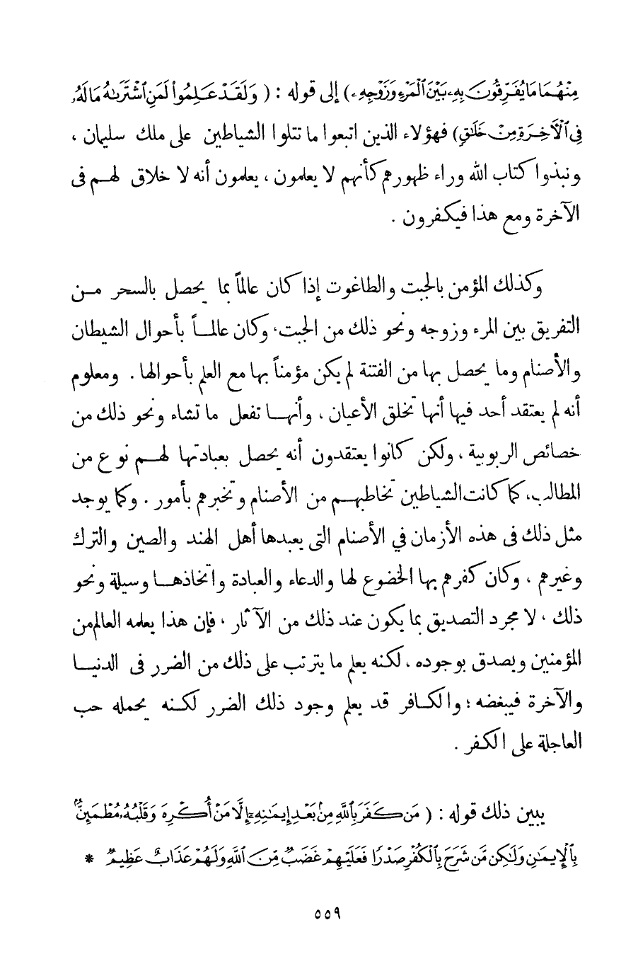 مِنْهُمَا مَا يُفَرِّقُونَ بِهِ بَيْنَ الْمَرْءِ وَزَوْجِهِ} إلَى قَوْلِهِ: {وَلَقَدْ عَلِمُوا لَمَنِ اشْتَرَاهُ مَا لَهُ فِي الْآخِرَةِ مِنْ خَلَاقٍ} فَهَؤُلَاءِ الَّذِينَ اتَّبَعُوا مَا تَتْلُوَا الشَّيَاطِينُ عَلَى مُلْكِ سُلَيْمَانَ وَنَبَذُوا كِتَابَ اللَّهِ وَرَاءَ ظُهُورِهِمْ كَأَنَّهُمْ لَا يَعْلَمُونَ يَعْلَمُونَ أَنَّهُ لَا خَلَاقَ لَهُمْ فِي الْآخِرَةِ وَمَعَ هَذَا فَيَكْفُرُونَ. وَكَذَلِكَ الْمُؤْمِنُ بِالْجِبْتِ وَالطَّاغُوتِ إذَا كَانَ عَالِمًا بِمَا يَحْصُلُ بِالسِّحْرِ مِنْ التَّفْرِيقِ بَيْنَ الْمَرْءِ وَزَوْجِهِ وَنَحْوِ ذَلِكَ مِنْ الْجِبْتِ وَكَانَ عَالِمًا بِأَحْوَالِ الشَّيْطَانِ وَالْأَصْنَامِ وَمَا يَحْصُلُ بِهَا مِنْ الْفِتْنَةِ لَمْ يَكُنْ مُؤْمِنًا بِهَا مَعَ الْعِلْمِ بِأَحْوَالِهَا. وَمَعْلُومٌ أَنَّهُ لَمْ يَعْتَقِدْ أَحَدٌ فِيهَا أَنَّهَا تَخْلُقُ الْأَعْيَانَ وَأَنَّهَا تَفْعَلُ مَا تَشَاءُ وَنَحْوُ ذَلِكَ مِنْ خَصَائِصِ الرُّبُوبِيَّةِ وَلَكِنْ كَانُوا يَعْتَقِدُونَ أَنَّهُ يَحْصُلُ بِعِبَادَتِهَا لَهُمْ نَوْعٌ مِنْ الْمَطَالِبِ كَمَا كَانَتْ الشَّيَاطِينُ تُخَاطِبُهُمْ مِنْ الْأَصْنَامِ وَتُخْبِرُهُمْ بِأُمُورِ. وَكَمَا يُوجَدُ مِثْلُ ذَلِكَ فِي هَذِهِ الْأَزْمَانِ فِي الْأَصْنَامِ الَّتِي يَعْبُدُهَا أَهْلُ الْهِنْدِ وَالصِّينِ وَالتُّرْكِ وَغَيْرِهِمْ وَكَانَ كُفْرُهُمْ بِهَا الْخُضُوعَ لَهَا وَالدُّعَاءَ وَالْعِبَادَةَ وَاِتِّخَاذَهَا وَسِيلَةً وَنَحْوَ ذَلِكَ لَا مُجَرَّدَ التَّصْدِيقِ بِمَا يَكُونُ عِنْدَ ذَلِكَ مِنْ الْآثَارِ فَإِنَّ هَذَا يَعْلَمُهُ الْعَالِمُ مِنْ الْمُؤْمِنِينَ وَيُصَدِّقُ بِوُجُودِهِ لَكِنَّهُ يَعْلَمُ مَا يَتَرَتَّبُ عَلَى ذَلِكَ مِنْ الضَّرَرِ فِي الدُّنْيَا وَالْآخِرَةِ فَيُبْغِضُهُ؛ وَالْكَافِرُ قَدْ يَعْلَمُ وُجُودَ ذَلِكَ الضَّرَرِ لَكِنَّهُ يَحْمِلُهُ حُبُّ الْعَاجِلَةِ عَلَى الْكُفْرِ. يُبَيِّنُ ذَلِكَ قَوْلُهُ: {مَنْ كَفَرَ بِاللَّهِ مِنْ بَعْدِ إيمَانِهِ إلَّا مَنْ أُكْرِهَ وَقَلْبُهُ مُطْمَئِنٌّ بِالْإِيمَانِ وَلَكِنْ مَنْ شَرَحَ بِالْكُفْرِ صَدْرًا فَعَلَيْهِمْ غَضَبٌ مِنَ اللَّهِ وَلَهُمْ عَذَابٌ عَظِيمٌ}