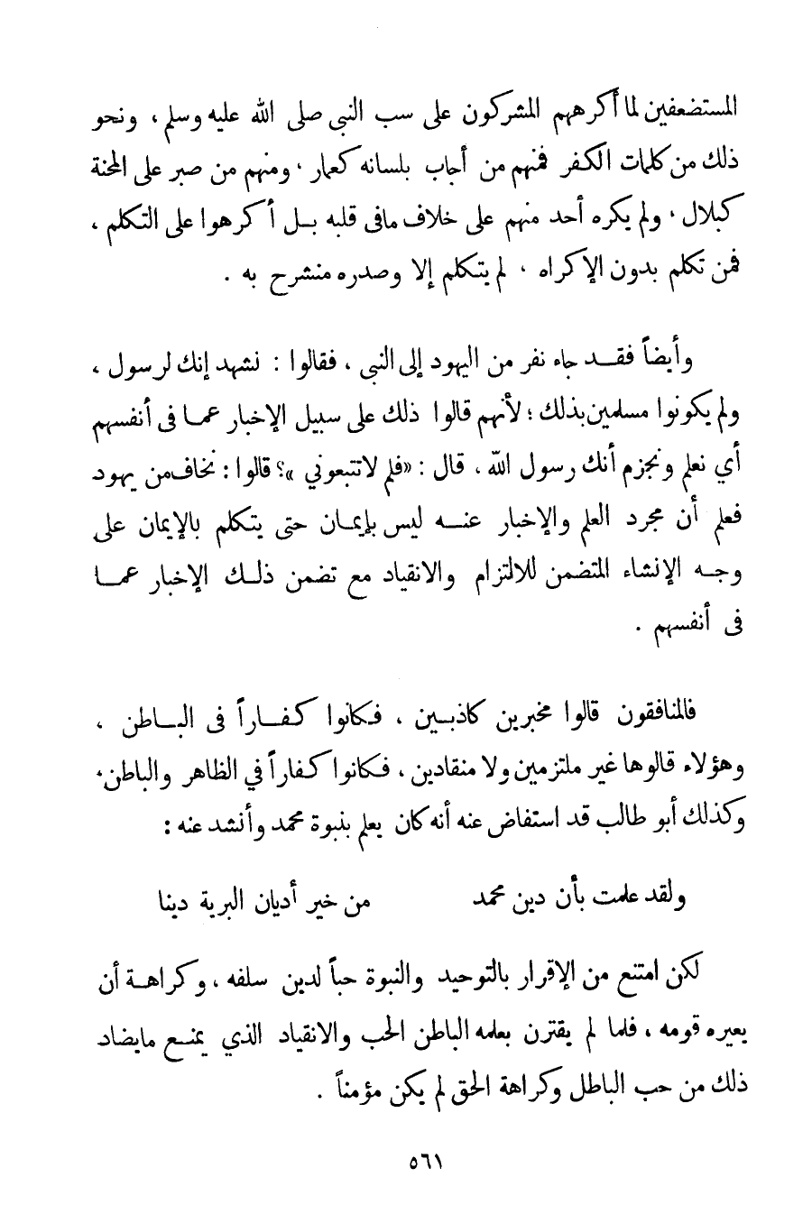 الْمُسْتَضْعَفِينَ لَمَّا أَكْرَهَهُمْ الْمُشْرِكُونَ عَلَى سَبِّ النَّبِيِّ صَلَّى اللَّهُ عَلَيْهِ وَسَلَّمَ وَنَحْوِ ذَلِكَ مِنْ كَلِمَاتِ الْكُفْرِ فَمِنْهُمْ مَنْ أَجَابَ بِلِسَانِهِ كَعَمَّارِ وَمِنْهُمْ مَنْ صَبَرَ عَلَى الْمِحْنَةِ كَبِلَالِ وَلَمْ يُكْرَهْ أَحَدٌ مِنْهُمْ عَلَى خِلَافِ مَا فِي قَلْبِهِ بَلْ أُكْرِهُوا عَلَى التَّكَلُّمِ فَمَنْ تَكَلَّمَ بِدُونِ الْإِكْرَاهِ لَمْ يَتَكَلَّمْ إلَّا وَصَدْرُهُ مُنْشَرِحٌ بِهِ. وَأَيْضًا فَقَدْ {جَاءَ نَفَرٌ مِنْ الْيَهُودِ إلَى النَّبِيِّ فَقَالُوا: نَشْهَدُ إنَّك لَرَسُولٌ وَلَمْ يَكُونُوا مُسْلِمِينَ بِذَلِكَ؛ لِأَنَّهُمْ قَالُوا ذَلِكَ عَلَى سَبِيلِ الْإِخْبَارِ عَمَّا فِي أَنْفُسِهِمْ أَيْ نَعْلَمُ وَنَجْزِمُ أَنَّك رَسُولُ اللَّهِ قَالَ: فَلِمَ لَا تَتَّبِعُونِي؟ قَالُوا: نَخَافُ مِنْ يَهُودَ} فَعُلِمَ أَنَّ مُجَرَّدَ الْعِلْمِ وَالْإِخْبَارِ عَنْهُ لَيْسَ بِإِيمَانِ حَتَّى يَتَكَلَّمَ بِالْإِيمَانِ عَلَى وَجْهِ الْإِنْشَاءِ الْمُتَضَمِّنِ لِلِالْتِزَامِ وَالِانْقِيَادِ مَعَ تَضَمُّنِ ذَلِكَ الْإِخْبَارِ عَمَّا فِي أَنْفُسِهِمْ. فَالْمُنَافِقُونَ قَالُوا مُخْبِرِينَ كَاذِبِينَ فَكَانُوا كُفَّارًا فِي الْبَاطِنِ وَهَؤُلَاءِ قَالُوهَا غَيْرَ مُلْتَزِمِينَ وَلَا مُنْقَادِينَ فَكَانُوا كُفَّارًا فِي الظَّاهِرِ وَالْبَاطِنِ وَكَذَلِكَ أَبُو طَالِبٍ قَدْ اسْتَفَاضَ عَنْهُ أَنَّهُ كَانَ يَعْلَمُ بِنُبُوَّةِ مُحَمَّدٍ وَأُنْشِدَ عَنْهُ: