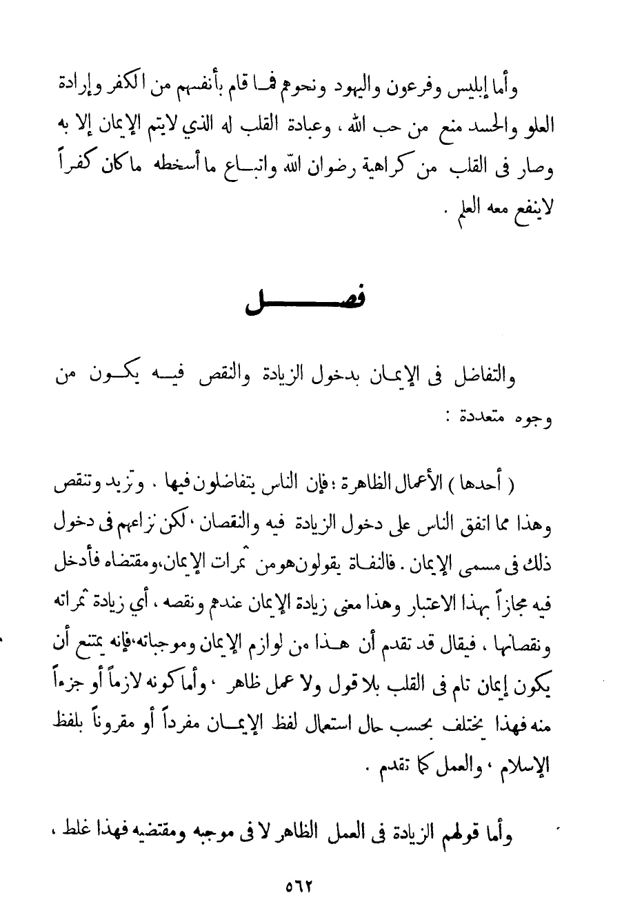 وَالتَّفَاضُلُ فِي الْإِيمَانِ بِدُخُولِ الزِّيَادَةِ وَالنَّقْصِ فِيهِ يَكُونُ مِنْ وُجُوهٍ مُتَعَدِّدَةٍ: (أَحَدُهَا) الْأَعْمَالُ الظَّاهِرَةُ؛ فَإِنَّ النَّاسَ يَتَفَاضَلُونَ فِيهَا وَتَزِيدُ وَتَنْقُصُ وَهَذَا مِمَّا اتَّفَقَ النَّاسُ عَلَى دُخُولِ الزِّيَادَةِ فِيهِ وَالنُّقْصَانِ لَكِنْ نِزَاعُهُمْ فِي دُخُولِ ذَلِكَ فِي مُسَمَّى الْإِيمَانِ. فالْنُّفَاةِ يَقُولُونَ هُوَ مِنْ ثَمَرَاتِ الْإِيمَانِ وَمُقْتَضَاهُ فَأُدْخِلَ فِيهِ مَجَازًا بِهَذَا الِاعْتِبَارِ وَهَذَا مَعْنَى زِيَادَةِ الْإِيمَانِ عِنْدَهُمْ وَنَقْصِهِ أَيْ زِيَادَةِ ثَمَرَاتِهِ وَنُقْصَانِهَا فَيُقَالُ قَدْ تَقَدَّمَ أَنَّ هَذَا مِنْ لَوَازِمِ الْإِيمَانِ وَمُوجِبَاتِهِ فَإِنَّهُ يَمْتَنِعُ أَنْ يَكُونَ إيمَانٌ تَامٌّ فِي الْقَلْبِ بِلَا قَوْلٍ وَلَا عَمَلٍ ظَاهِرٍ وَأَمَّا كَوْنُهُ لَازِمًا أَوْ جُزْءًا مِنْهُ فَهَذَا يَخْتَلِفُ بِحَسَبِ حَالِ اسْتِعْمَالِ لَفْظِ الْإِيمَانِ مُفْرَدًا أَوْ مَقْرُونًا بِلَفْظِ الْإِسْلَامِ وَالْعَمَلِ كَمَا تَقَدَّمَ. وَأَمَّا قَوْلُهُمْ الزِّيَادَةُ فِي الْعَمَلِ الظَّاهِرِ لَا فِي مُوجِبِهِ وَمُقْتَضِيهِ فَهَذَا غَلَطٌ،