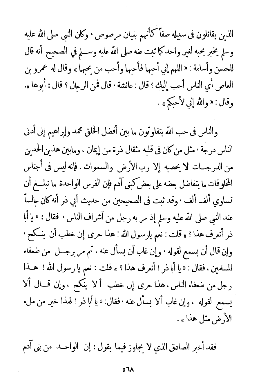الَّذِينَ يُقَاتِلُونَ فِي سَبِيلِهِ صَفًّا كَأَنَّهُمْ بُنْيَانٌ مَرْصُوصٌ وَكَانَ النَّبِيُّ صَلَّى اللَّهُ عَلَيْهِ وَسَلَّمَ يُخْبِرُ بِحُبِّهِ لِغَيْرِ وَاحِدٍ كَمَا ثَبَتَ عَنْهُ صَلَّى اللَّهُ عَلَيْهِ وَسَلَّمَ فِي الصَّحِيحِ {أَنَّهُ قَالَ لِلْحَسَنِ وَأُسَامَةَ: اللَّهُمَّ إنِّي أُحِبُّهُمَا فَأَحِبَّهُمَا وَأَحُبّ مَنْ يُحِبُّهُمَا} {وَقَالَ لَهُ عَمْرُو بْنُ العاص أَيُّ النَّاسِ أَحَبُّ إلَيْك؟ قَالَ: عَائِشَةُ قَالَ فَمِنْ الرِّجَالِ؟ قَالَ: أَبُوهَا} . وَقَالَ: {وَاَللَّهِ إنِّي لَأُحِبُّكُمْ} . وَالنَّاسُ فِي حُبِّ اللَّهِ يَتَفَاوَتُونَ مَا بَيْنَ أَفْضَلِ الْخَلْقِ مُحَمَّدٍ وَإِبْرَاهِيمَ إلَى أَدْنَى النَّاسِ دَرَجَةً مِثْلُ مَنْ كَانَ فِي قَلْبِهِ مِثْقَالُ ذَرَّةٍ مِنْ إيمَانٍ وَمَا بَيْنَ هَذَيْنِ الْحَدَّيْنِ مِنْ الدَّرَجَاتِ لَا يُحْصِيهِ إلَّا رَبُّ الْأَرْضِ وَالسَّمَوَاتِ فَإِنَّهُ لَيْسَ فِي أَجْنَاسِ الْمَخْلُوقَاتِ مَا يَتَفَاضَلُ بَعْضُهُ عَلَى بَعْضٍ كَبَنِي آدَمَ فَإِنَّ الْفَرَسَ الْوَاحِدَةَ مَا تَبْلُغُ أَنْ تساوي أَلْفَ أَلْفٍ وَقَدْ ثَبَتَ فِي الصَّحِيحَيْنِ مِنْ {حَدِيثِ أَبِي ذَرٍّ أَنَّهُ كَانَ جَالِسًا عِنْدَ النَّبِيِّ صَلَّى اللَّهُ عَلَيْهِ وَسَلَّمَ إذْ مَرَّ بِهِ رَجُلٌ مِنْ أَشْرَافِ النَّاسِ فَقَالَ: يَا أَبَا ذَرٍّ أَتَعْرِفُ هَذَا؟ قُلْت: نَعَمْ يَا رَسُولَ اللَّهِ هَذَا حَرِيٌّ إنْ خَطَبَ أَنْ يُنْكَحَ وَإِنْ قَالَ أَنْ يُسْمَعَ لِقَوْلِهِ وَإِنْ غَابَ أَنْ يُسْأَلَ عَنْهُ ثُمَّ مَرَّ بِرَجُلِ مِنْ ضُعَفَاءِ الْمُسْلِمِينَ فَقَالَ: يَا أَبَا ذَرٍّ أَتَعْرِفُ هَذَا؟ قُلْت: نَعَمْ يَا رَسُولَ اللَّهِ هَذَا رَجُلٌ مِنْ ضُعَفَاءِ النَّاسِ هَذَا حَرِيٌّ إنْ خَطَبَ أَلَّا يُنْكَحَ وَإِنْ قَالَ أَلَّا يُسْمَعَ لِقَوْلِهِ وَإِنْ غَابَ أَلَّا يُسْأَلَ عَنْهُ فَقَالَ: يَا أَبَا ذَرٍّ لَهَذَا خَيْرٌ مِنْ مِلْءِ الْأَرْضِ مِثْلَ هَذَا} . فَقَدْ أَخْبَرَ الصَّادِقُ الَّذِي لَا يُجَاوِزُ فِيمَا يَقُولُ: إنَّ الْوَاحِدَ مِنْ بَنِي آدَمَ