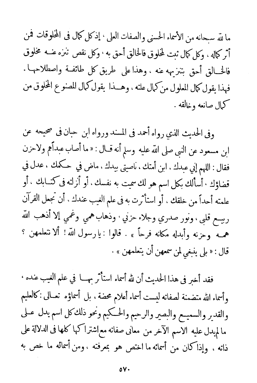 مَا لِلَّهِ سُبْحَانَهُ مِنْ الْأَسْمَاءِ الْحُسْنَى وَالصِّفَاتِ الْعُلَى إذْ كُلُّ كَمَالٍ فِي الْمَخْلُوقَاتِ فَمِنْ أَثَرِ كَمَالِهِ، وَكُلُّ كَمَالٍ ثَبَتَ لِمَخْلُوقِ فَالْخَالِقُ أَحَقُّ بِهِ، وَكُلُّ نَقْصٍ تَنَزَّهَ عَنْهُ مَخْلُوقٌ فَالْخَالِقُ أَحَقُّ بِتَنْزِيهِهِ عَنْهُ، وَهَذَا عَلَى طَرِيقِ كُلِّ طَائِفَةٍ وَاصْطِلَاحِهَا. فَهَذَا يَقُولُ كَمَالُ الْمَعْلُولِ مِنْ كَمَالِ عِلَّتِهِ وَهَذَا يَقُولُ: كَمَالُ الْمَصْنُوعِ الْمَخْلُوقِ مِنْ كَمَالِ صَانِعِهِ وَخَالِقِهِ. وَفِي الْحَدِيثِ الَّذِي رَوَاهُ أَحْمَدُ فِي الْمُسْنَدِ وَرَوَاهُ ابْنُ حِبَّانَ فِي صَحِيحِهِ عَنْ ابْنِ مَسْعُودٍ عَنْ النَّبِيِّ صَلَّى اللَّهُ عَلَيْهِ وَسَلَّمَ أَنَّهُ قَالَ: {مَا أَصَابَ عَبْدًا هَمٌّ وَلَا حَزَنٌ فَقَالَ: اللَّهُمَّ إنِّي عَبْدُك ابْنُ أَمَتِك نَاصِيَتِي بِيَدِك مَاضٍ فِيَّ حُكْمُك عَدْلٌ فِيَّ قَضَاؤُك أَسْأَلُك بِكُلِّ اسْمٍ هُوَ لَك سَمَّيْت بِهِ نَفْسَك أَوْ أَنْزَلْته فِي كِتَابِك أَوْ عَلَّمْته أَحَدًا مَنْ خَلْقِك أَوْ اسْتَأْثَرْت بِهِ فِي عِلْمِ الْغَيْبِ عِنْدَك أَنْ تَجْعَلَ الْقُرْآنَ رَبِيعَ قَلْبِي وَنُورَ صَدْرِي وَجَلَاءَ حُزْنِي وَذَهَابَ هَمِّي وَغَمِّي إلَّا أَذْهَبَ اللَّهُ هَمَّهُ وَحُزْنَهُ وَأَبْدَلَهُ مَكَانَهُ فَرَحًا. قَالُوا. يَا رَسُولَ اللَّهِ أَلَا نَتَعَلَّمُهُنَّ؟ قَالَ: بَلَى يَنْبَغِي لِمَنْ سَمِعَهُنَّ أَنْ يَتَعَلَّمَهُنَّ} . فَقَدْ أَخْبَرَ فِي هَذَا الْحَدِيثِ أَنَّ لِلَّهِ أَسْمَاءً اسْتَأْثَرَ بِهَا فِي عِلْمِ الْغَيْبِ عِنْدَهُ وَأَسْمَاءُ اللَّهِ مُتَضَمِّنَةٌ لِصِفَاتِهِ لَيْسَتْ أَسْمَاءَ أَعْلَامٍ مَحْضَةً بَلْ أَسْمَاؤُهُ تَعَالَى: كَالْعَلِيمِ وَالْقَدِيرِ وَالسَّمِيعِ وَالْبَصِيرِ وَالرَّحِيمِ وَالْحَكِيمِ وَنَحْوِ ذَلِكَ كُلُّ اسْمٍ يَدُلُّ عَلَى مَا لَمْ يَدُلَّ عَلَيْهِ الِاسْمُ الْآخَرُ مِنْ مَعَانِي صِفَاتِهِ مَعَ اشْتِرَاكِهَا كُلِّهَا فِي الدَّلَالَةِ عَلَى ذَاتِهِ وَإِذَا كَانَ مِنْ أَسْمَائِهِ مَا اخْتَصَّ هُوَ بِمَعْرِفَتِهِ وَمِنْ أَسْمَائِهِ مَا خُصَّ بِهِ