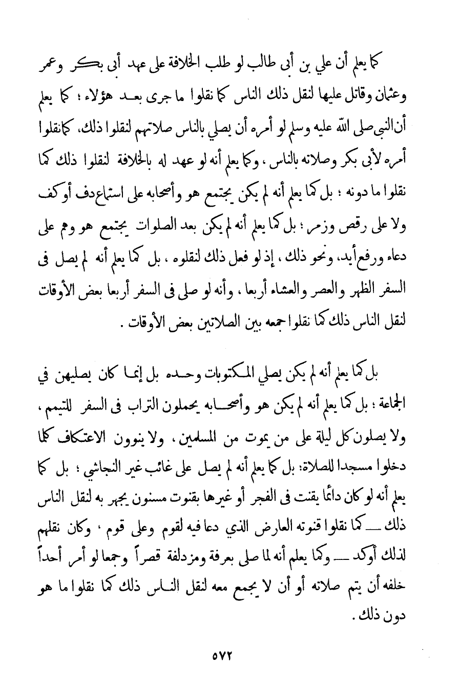 كَمَا يُعْلَمُ أَنَّ عَلِيَّ بْنَ أَبِي طَالِبٍ لَوْ طَلَبَ الْخِلَافَةَ عَلَى عَهْدِ أَبِي بَكْرٍ وَعُمَرَ وَعُثْمَانَ وَقَاتَلَ عَلَيْهَا لَنَقَلَ ذَلِكَ النَّاسُ كَمَا نَقَلُوا مَا جَرَى بَعْدَ هَؤُلَاءِ؛ كَمَا يُعْلَمُ أَنَّ النَّبِيَّ صَلَّى اللَّهُ عَلَيْهِ وَسَلَّمَ لَوْ أَمَرَهُ أَنْ يُصَلِّيَ بِالنَّاسِ صَلَاتَهُمْ لَنَقَلُوا ذَلِكَ كَمَا نَقَلُوا أَمْرَهُ لِأَبِي بَكْرٍ وَصَلَاتَهُ بِالنَّاسِ وَكَمَا يُعْلَمُ أَنَّهُ لَوْ عَهِدَ لَهُ بِالْخِلَافَةِ لَنَقَلُوا ذَلِكَ كَمَا نَقَلُوا مَا دُونَهُ؛ بَلْ كَمَا يُعْلَمُ أَنَّهُ لَمْ يَكُنْ يَجْتَمِعُ هُوَ وَأَصْحَابُهُ عَلَى اسْتِمَاعِ دُفٍّ أَوْ كَفٍّ وَلَا عَلَى رَقْصٍ وَزَمْرٍ؛ بَلْ كَمَا يُعْلَمُ أَنَّهُ لَمْ يَكُنْ بَعْدَ الصَّلَوَاتِ يَجْتَمِعُ هُوَ وَهُمْ عَلَى دُعَاءٍ وَرَفْعِ أَيْدٍ وَنَحْوِ ذَلِكَ إذْ لَوْ فَعَلَ ذَلِكَ لَنَقَلُوهُ بَلْ كَمَا يُعْلَمُ أَنَّهُ لَمْ يُصَلِّ فِي السَّفَرِ الظُّهْرَ وَالْعَصْرَ وَالْعِشَاءَ أَرْبَعًا وَأَنَّهُ لَوْ صَلَّى فِي السَّفَرِ أَرْبَعًا بَعْضَ الْأَوْقَاتِ لَنَقَلَ النَّاسُ ذَلِكَ كَمَا نَقَلُوا جَمْعَهُ بَيْنَ الصَّلَاتَيْنِ بَعْضَ الْأَوْقَاتِ. بَلْ كَمَا يُعْلَمُ أَنَّهُ لَمْ يَكُنْ يُصَلِّي الْمَكْتُوبَاتِ وَحْدَهُ بَلْ إنَّمَا كَانَ يُصَلِّيهِنَّ فِي الْجَمَاعَةِ؛ بَلْ كَمَا يُعْلَمُ أَنَّهُ لَمْ يَكُنْ هُوَ وَأَصْحَابُهُ يَحْمِلُونَ التُّرَابَ فِي السَّفَرِ لِلتَّيَمُّمِ وَلَا يُصَلُّونَ كُلَّ لَيْلَةٍ عَلَى مَنْ يَمُوتُ مِنْ الْمُسْلِمِينَ وَلَا يَنْوُونَ الِاعْتِكَافَ كُلَّمَا دَخَلُوا مَسْجِدًا لِلصَّلَاةِ؛ بَلْ كَمَا يُعْلَمُ أَنَّهُ لَمْ يُصَلِّ عَلَى غَائِبٍ غَيْرَ النَّجَاشِيِّ؛ بَلْ كَمَا يُعْلَمُ أَنَّهُ لَوْ كَانَ دَائِمًا يَقْنُتُ فِي الْفَجْرِ أَوْ غَيْرِهَا بِقُنُوتِ مَسْنُونٍ يَجْهَرُ بِهِ لَنَقَلَ النَّاسُ ذَلِكَ - كَمَا نَقَلُوا قُنُوتَهُ الْعَارِضَ الَّذِي دَعَا فِيهِ لِقَوْمِ وَعَلَى قَوْمٍ وَكَانَ نَقْلُهُمْ لِذَلِكَ أَوْكَدَ - وَكَمَا يُعْلَمُ أَنَّهُ لَمَّا صَلَّى بِعَرَفَةَ وَمُزْدَلِفَةَ قَصْرًا وَجَمْعًا لَوْ أَمَرَ أَحَدًا خَلْفَهُ أَنْ يُتِمَّ صَلَاتَهُ أَوْ أَنْ لَا يَجْمَعَ مَعَهُ لَنَقَلَ النَّاسُ ذَلِكَ كَمَا نَقَلُوا مَا هُوَ دُونَ ذَلِكَ.