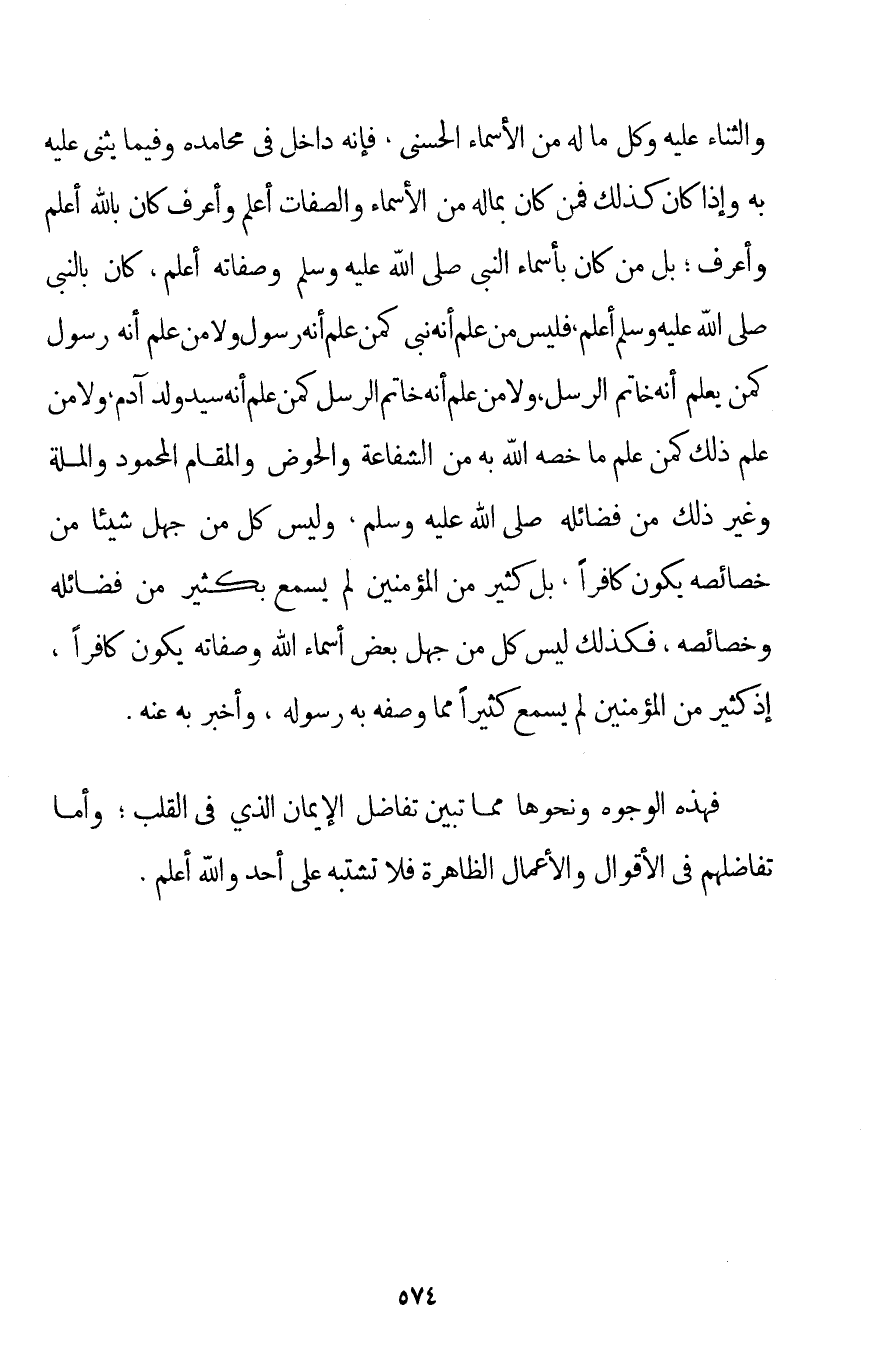 وَالثَّنَاءِ عَلَيْهِ وَكُلُّ مَا لَهُ مِنْ الْأَسْمَاءِ الْحُسْنَى فَإِنَّهُ دَاخِلٌ فِي مَحَامِدِهِ وَفِيمَا يُثْنِي عَلَيْهِ بِهِ وَإِذَا كَانَ كَذَلِكَ فَمَنْ كَانَ بِمَا لَهُ مِنْ الْأَسْمَاءِ وَالصِّفَاتِ أَعْلَمَ وَأَعْرَفَ كَانَ بِاَللَّهِ أَعْلَمَ وَأَعْرَفَ؛ بَلْ مَنْ كَانَ بِأَسْمَاءِ النَّبِيِّ صَلَّى اللَّهُ عَلَيْهِ وَسَلَّمَ وَصِفَاتِهِ أَعْلَمَ كَانَ بِالنَّبِيِّ صَلَّى اللَّهُ عَلَيْهِ وَسَلَّمَ أَعْلَمَ فَلَيْسَ مَنْ عَلِمَ أَنَّهُ نَبِيٌّ كَمَنْ عَلِمَ أَنَّهُ رَسُولٌ وَلَا مَنْ عَلِمَ أَنَّهُ رَسُولٌ كَمَنْ يَعْلَمُ أَنَّهُ خَاتَمُ الرُّسُلِ وَلَا مَنْ عَلِمَ أَنَّهُ خَاتَمُ الرُّسُلِ كَمَنْ عَلِمَ أَنَّهُ سَيِّدُ وَلَدِ آدَمَ وَلَا مَنْ عَلِمَ ذَلِكَ كَمَنْ عَلِمَ مَا خَصَّهُ اللَّهُ بِهِ مِنْ الشَّفَاعَةِ وَالْحَوْضِ وَالْمَقَامِ الْمَحْمُودِ وَالْمِلَّةِ وَغَيْرِ ذَلِكَ مِنْ فَضَائِلِهِ صَلَّى اللَّهُ عَلَيْهِ وَسَلَّمَ وَلَيْسَ كُلُّ مَنْ جَهِلَ شَيْئًا مِنْ خَصَائِصِهِ يَكُونُ كَافِرًا بَلْ كَثِيرٌ مِنْ الْمُؤْمِنِينَ لَمْ يَسْمَعْ بِكَثِيرِ مِنْ فَضَائِلِهِ وَخَصَائِصِهِ فَكَذَلِكَ لَيْسَ كُلُّ مَنْ جَهِلَ بَعْضَ أَسْمَاءِ اللَّهِ وَصِفَاتِهِ يَكُونُ كَافِرًا إذْ كَثِيرٌ مِنْ الْمُؤْمِنِينَ لَمْ يَسْمَعْ كَثِيرًا مِمَّا وَصَفَهُ بِهِ رَسُولُهُ وَأَخْبَرَ بِهِ عَنْهُ. فَهَذِهِ الْوُجُوهُ وَنَحْوُهَا مِمَّا تُبَيِّنُ تَفَاضُلَ الْإِيمَانِ الَّذِي فِي الْقَلْبِ؛ وَأَمَّا تَفَاضُلُهُمْ فِي الْأَقْوَالِ وَالْأَعْمَالِ الظَّاهِرَةِ فَلَا تَشْتَبِهُ عَلَى أَحَدٍ وَاَللَّهُ أَعْلَمُ.