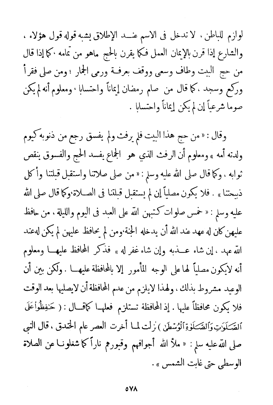 لَوَازِمُ لِلْبَاطِنِ لَا تَدْخُلُ فِي الِاسْمِ عِنْدَ الْإِطْلَاقِ يُشْبِه قَوْلُهُ قَوْلَ هَؤُلَاءِ وَالشَّارِعُ إذَا قَرَنَ بِالْإِيمَانِ الْعَمَلَ فَكَمَا يَقْرِنُ بِالْحَجِّ مَا هُوَ مِنْ تَمَامِهِ كَمَا إذَا قَالَ مَنْ حَجَّ الْبَيْتَ وَطَافَ وَسَعَى وَوَقَفَ بِعَرَفَةَ وَرَمَى الْجِمَارَ؛ وَمَنْ صَلَّى فَقَرَأَ وَرَكَعَ وَسَجَدَ كَمَا قَالَ مَنْ صَامَ رَمَضَانَ إيمَانًا وَاحْتِسَابًا وَمَعْلُومٌ أَنَّهُ لَمْ يَكُنْ صَوْمًا شَرْعِيًّا إنْ لَمْ يَكُنْ إيمَانًا وَاحْتِسَابًا. وَقَالَ: {مَنْ حَجَّ هَذَا الْبَيْتَ فَلَمْ يَرْفُثْ وَلَمْ يَفْسُقْ رَجَعَ مِنْ ذُنُوبِهِ كَيَوْمِ وَلَدَتْهُ أُمُّهُ} وَمَعْلُومٌ أَنَّ الرَّفَثَ الَّذِي هُوَ الْجِمَاعُ يُفْسِدُ الْحَجَّ وَالْفُسُوقُ يُنْقِصُ ثَوَابَهُ وَكَمَا قَالَ صَلَّى اللَّهُ عَلَيْهِ وَسَلَّمَ {مَنْ صَلَّى صَلَاتَنَا وَاسْتَقْبَلَ قِبْلَتَنَا وَأَكَلَ ذَبِيحَتَنَا} . فَلَا يَكُونُ مُصَلِّيًا إنْ لَمْ يَسْتَقْبِلْ قِبْلَتَنَا فِي الصَّلَاةِ وَكَمَا قَالَ صَلَّى اللَّهُ عَلَيْهِ وَسَلَّمَ {خَمْسُ صَلَوَاتٍ كَتَبَهُنَّ اللَّهُ عَلَى الْعَبْدِ فِي الْيَوْمِ وَاللَّيْلَةِ مَنْ حَافَظَ عَلَيْهِنَّ كَانَ لَهُ عَهْدٌ عِنْدَ اللَّهِ أَنْ يُدْخِلَهُ الْجَنَّةَ وَمَنْ لَمْ يُحَافِظْ عَلَيْهِنَّ لَمْ يَكُنْ لَهُ عِنْدَ اللَّهِ عَهْدٌ إنْ شَاءَ عَذَّبَهُ وَإِنْ شَاءَ غَفَرَ لَهُ} فَذَكَرَ الْمُحَافِظَ عَلَيْهَا وَمَعْلُومٌ أَنَّهُ لَا يَكُونُ مُصَلِّيًا لَهَا عَلَى الْوَجْهِ الْمَأْمُورِ إلَّا بِالْمُحَافَظَةِ عَلَيْهَا. وَلَكِنْ بَيَّنَ أَنَّ الْوَعِيدَ مَشْرُوطٌ بِذَلِكَ وَلِهَذَا لَا يَلْزَمُ مِنْ عَدَمِ الْمُحَافَظَةِ أَنْ لَا يُصَلِّيَهَا بَعْدَ الْوَقْتِ فَلَا يَكُونُ مُحَافِظًا عَلَيْهَا. إذْ الْمُحَافَظَةُ تَسْتَلْزِمُ فِعْلَهَا كَمَا قَالَ: {حَافِظُوا عَلَى الصَّلَوَاتِ وَالصَّلَاةِ الْوُسْطَى} نَزَلَتْ لَمَّا أُخِّرَتْ الْعَصْرُ عَامَ الْخَنْدَقِ قَالَ النَّبِيُّ صَلَّى اللَّهُ عَلَيْهِ وَسَلَّمَ {مَلَأَ اللَّهُ أَجْوَافَهُمْ وَقُبُورَهُمْ نَارًا كَمَا شَغَلُونَا عَنْ الصَّلَاةِ الْوُسْطَى حَتَّى غَابَتْ الشَّمْسُ} .