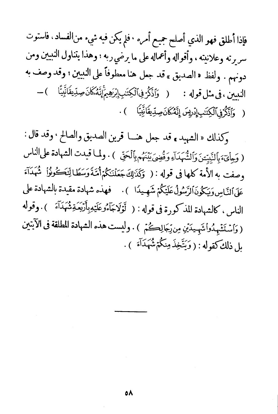 فَإِذَا أُطْلِقَ فَهُوَ الَّذِي أَصْلَحَ جَمِيعَ أَمْرِهِ فَلَمْ يَكُنْ فِيهِ شَيْءٌ مِنْ الْفَسَادِ فَاسْتَوَتْ سَرِيرَتُهُ وَعَلَانِيَتُهُ وَأَقْوَالُهُ وَأَعْمَالُهُ عَلَى مَا يُرْضِي رَبَّهُ؛ وَهَذَا يَتَنَاوَلُ النَّبِيِّينَ وَمَنْ دُونَهُمْ. وَلَفْظُ " الصِّدِّيقِ " قَدْ جُعِلَ هُنَا مَعْطُوفًا عَلَى النَّبِيِّينَ؛ وَقَدْ وَصَفَ بِهِ النَّبِيِّينَ فِي مِثْلِ قَوْلِهِ: {وَاذْكُرْ فِي الْكِتَابِ إبْرَاهِيمَ إنَّهُ كَانَ صِدِّيقًا نَبِيًّا} - {وَاذْكُرْ فِي الْكِتَابِ إدْرِيسَ إنَّهُ كَانَ صِدِّيقًا نَبِيًّا} . وَكَذَلِكَ " الشَّهِيدُ " قَدْ جُعِلَ هُنَا قَرِينَ الصِّدِّيقِ وَالصَّالِحِ وَقَدْ قَالَ: {وَجِيءَ بِالنَّبِيِّينَ وَالشُّهَدَاءِ وَقُضِيَ بَيْنَهُمْ بِالْحَقِّ} . وَلَمَّا قُيِّدَتْ الشَّهَادَةُ عَلَى النَّاسِ وُصِفَتْ بِهِ الْأُمَّةُ كُلُّهَا فِي قَوْلِهِ: {وَكَذَلِكَ جَعَلْنَاكُمْ أُمَّةً وَسَطًا لِتَكُونُوا شُهَدَاءَ عَلَى النَّاسِ وَيَكُونَ الرَّسُولُ عَلَيْكُمْ شَهِيدًا} . فَهَذِهِ شَهَادَةٌ مُقَيَّدَةٌ بِالشَّهَادَةِ عَلَى النَّاسِ كَالشَّهَادَةِ الْمَذْكُورَةِ فِي قَوْلِهِ: {لَوْلَا جَاءُوا عَلَيْهِ بِأَرْبَعَةِ شُهَدَاءَ} . وَقَوْلِهِ {وَاسْتَشْهِدُوا شَهِيدَيْنِ مِنْ رِجَالِكُمْ} . وَلَيْسَتْ هَذِهِ الشَّهَادَةُ الْمُطْلَقَةُ فِي الْآيَتَيْنِ بَلْ ذَلِكَ كَقَوْلِهِ: {وَيَتَّخِذَ مِنْكُمْ شُهَدَاءَ} .