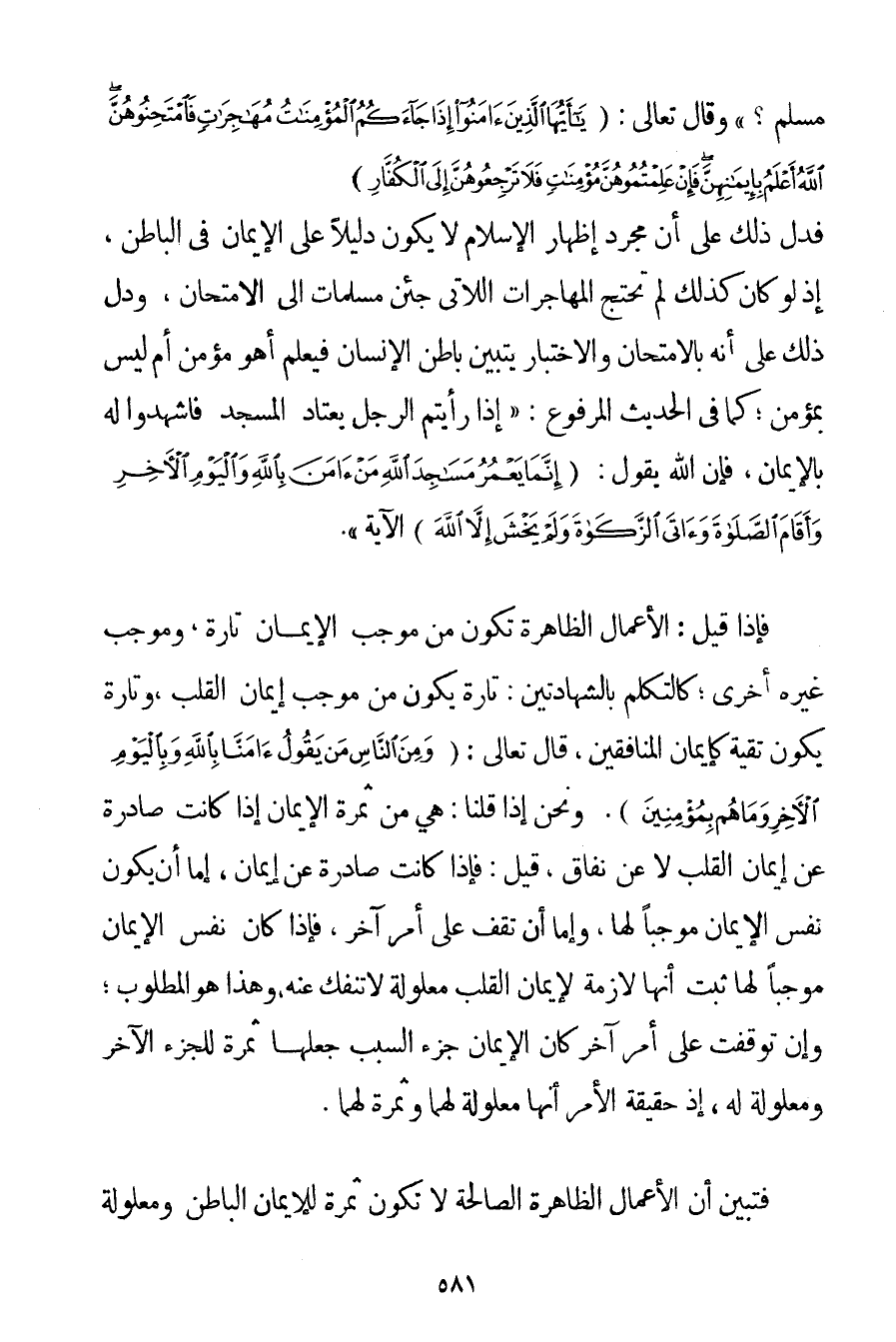 مُسْلِمٌ؟} وَقَالَ تَعَالَى: {يَا أَيُّهَا الَّذِينَ آمَنُوا إذَا جَاءَكُمُ الْمُؤْمِنَاتُ مُهَاجِرَاتٍ فَامْتَحِنُوهُنَّ اللَّهُ أَعْلَمُ بِإِيمَانِهِنَّ فَإِنْ عَلِمْتُمُوهُنَّ مُؤْمِنَاتٍ فَلَا تَرْجِعُوهُنَّ إلَى الْكُفَّارِ} فَدَلَّ ذَلِكَ عَلَى أَنَّ مُجَرَّدَ إظْهَارِ الْإِسْلَامِ لَا يَكُونُ دَلِيلًا عَلَى الْإِيمَانِ فِي الْبَاطِنِ إذْ لَوْ كَانَ كَذَلِكَ لَمْ تَحْتَجْ الْمُهَاجِرَاتُ اللَّاتِي جِئْنَ مُسْلِمَاتٍ إلَى الِامْتِحَانِ وَدَلَّ ذَلِكَ عَلَى أَنَّهُ بِالِامْتِحَانِ وَالِاخْتِبَارِ يَتَبَيَّنُ بَاطِنُ الْإِنْسَانِ فَيُعْلَمُ أَهُوَ مُؤْمِنٌ أَمْ لَيْسَ بِمُؤْمِنِ؛ كَمَا فِي الْحَدِيثِ الْمَرْفُوعِ: {إذَا رَأَيْتُمْ الرَّجُلَ يَعْتَادُ الْمَسْجِدَ فَاشْهَدُوا لَهُ بِالْإِيمَانِ فَإِنَّ اللَّهَ يَقُولُ: {إنَّمَا يَعْمُرُ مَسَاجِدَ اللَّهِ مَنْ آمَنَ بِاللَّهِ وَالْيَوْمِ الْآخِرِ وَأَقَامَ الصَّلَاةَ وَآتَى الزَّكَاةَ وَلَمْ يَخْشَ إلَّا اللَّهَ} الْآيَةَ} . فَإِذَا قِيلَ: الْأَعْمَالُ الظَّاهِرَةُ تَكُونُ مِنْ مُوجِبِ الْإِيمَانِ تَارَةً، وَمُوجِبِ غَيْرِهِ أُخْرَى؛ كَالتَّكَلُّمِ بِالشَّهَادَتَيْنِ: تَارَةً يَكُونُ مِنْ مُوجِبِ إيمَانِ الْقَلْبِ وَتَارَةً يَكُونُ تَقِيَّةً كَإِيمَانِ الْمُنَافِقِينَ قَالَ تَعَالَى: {وَمِنَ النَّاسِ مَنْ يَقُولُ آمَنَّا بِاللَّهِ وَبِالْيَوْمِ الْآخِرِ وَمَا هُمْ بِمُؤْمِنِينَ} . وَنَحْنُ إذَا قُلْنَا: هِيَ مِنْ ثَمَرَةِ الْإِيمَانِ إذَا كَانَتْ صَادِرَةً عَنْ إيمَانِ الْقَلْبِ لَا عَنْ نِفَاقٍ قِيلَ: فَإِذَا كَانَتْ صَادِرَةً عَنْ إيمَانٍ إمَّا أَنْ يَكُونَ نَفْسُ الْإِيمَانِ مُوجِبًا لَهَا وَإِمَّا أَنْ تَقِفَ عَلَى أَمْرٍ آخَرَ فَإِذَا كَانَ نَفْسُ الْإِيمَانِ مُوجِبًا لَهَا ثَبَتَ أَنَّهَا لَازِمَةٌ لِإِيمَانِ الْقَلْبِ مَعْلُولَةٌ لَا تَنْفَكُّ عَنْهُ وَهَذَا هُوَ الْمَطْلُوبُ؛ وَإِنْ تَوَقَّفَتْ عَلَى أَمْرٍ آخَرَ كَانَ الْإِيمَانُ جُزْءَ السَّبَبِ جَعَلَهَا ثَمَرَةً لِلْجُزْءِ الْآخَرِ وَمَعْلُولَةً لَهُ إذْ حَقِيقَةُ الْأَمْرِ أَنَّهَا مَعْلُولَةٌ لَهُمَا وَثَمَرَةٌ لَهُمَا. فَتَبَيَّنَ أَنَّ الْأَعْمَالَ الظَّاهِرَةَ الصَّالِحَةَ لَا تَكُونُ ثَمَرَةً لِلْإِيمَانِ الْبَاطِنِ وَمَعْلُولَةً